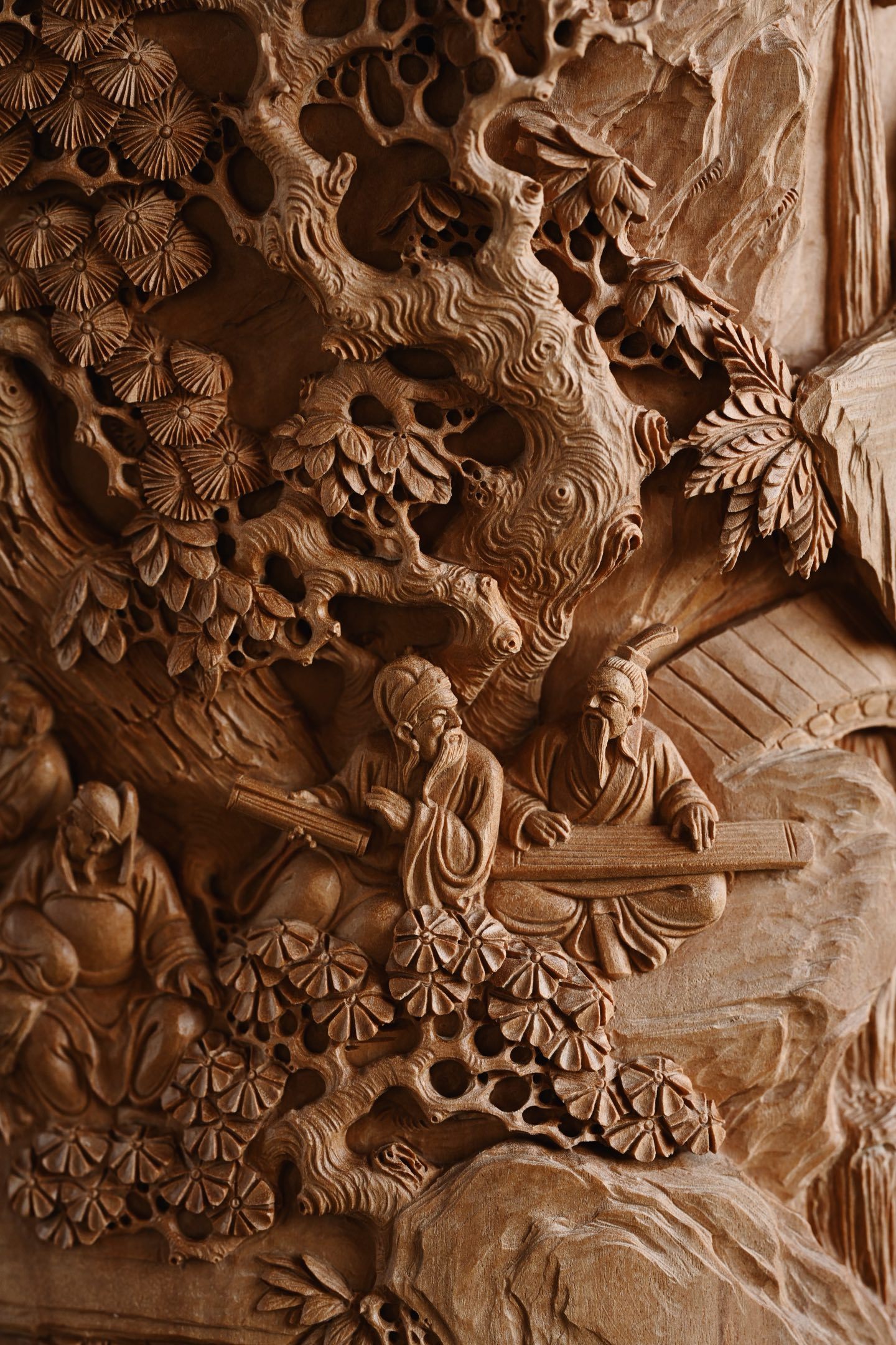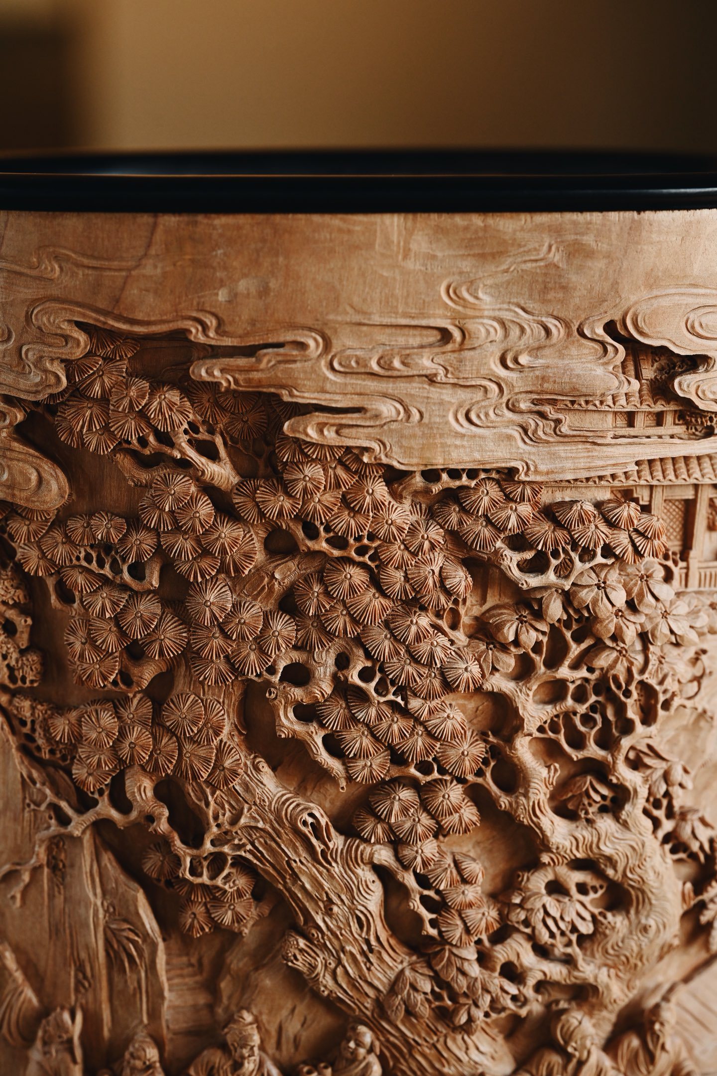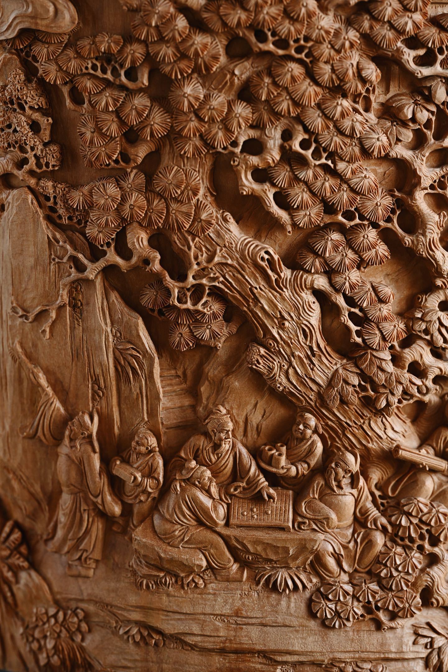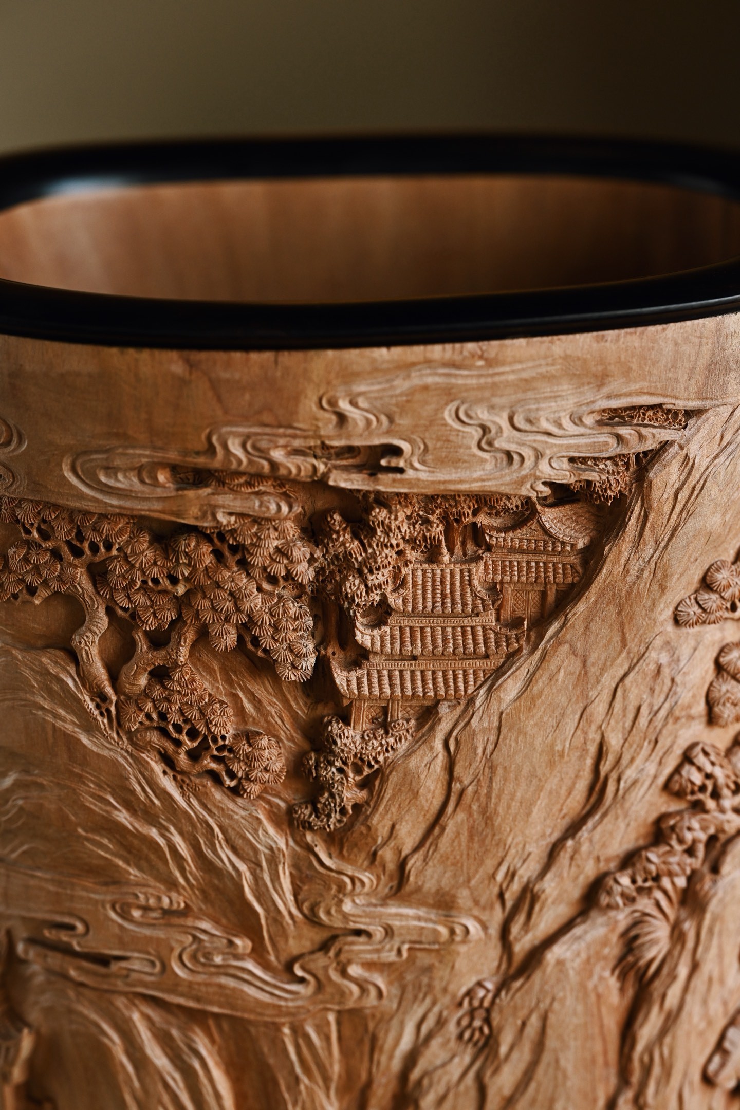 老山檀 | 琴棋书画 大笔筒老料香气浓郁,随形雕琢文士于山间陶然,琴棋书画诗酒畅达,苍松虬劲、山石磊落,目光所及之处无不生动形象,置文房意境深远。20.5*16.3*26.5cm 3491g