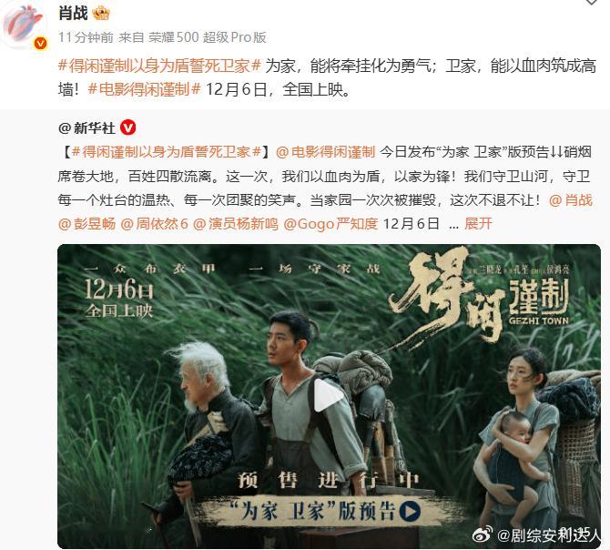 肖战说为家卫家肖战得闲谨制12月6日全国上映 《得闲谨制》定档!肖战饰演的莫得闲,在戈止镇战火中觉醒,“为家卫家” 彰显平凡力量。