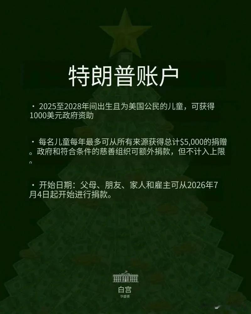 特朗普账户——2025至2028年间出生且为美国公民的儿童,可获得1000美元政府资助每名儿童每年最多可从所有来源获得总计$5000的捐赠。政府和符合条件的慈善组织可额外捐款,但不计入上限·开始日期:父母、朋友、家人和雇主可从2026年7月4日起开始进行捐款。白宫华盛顿