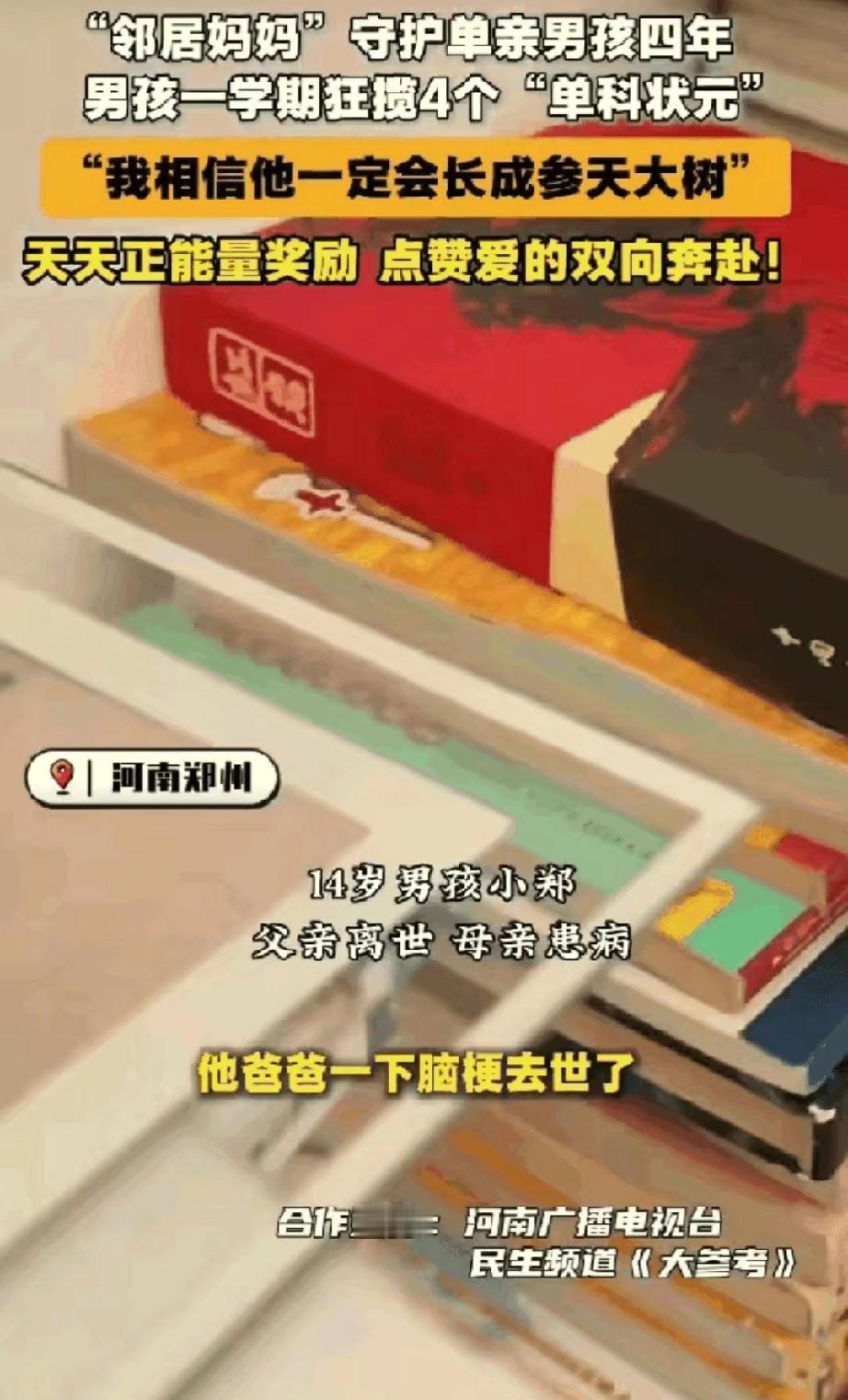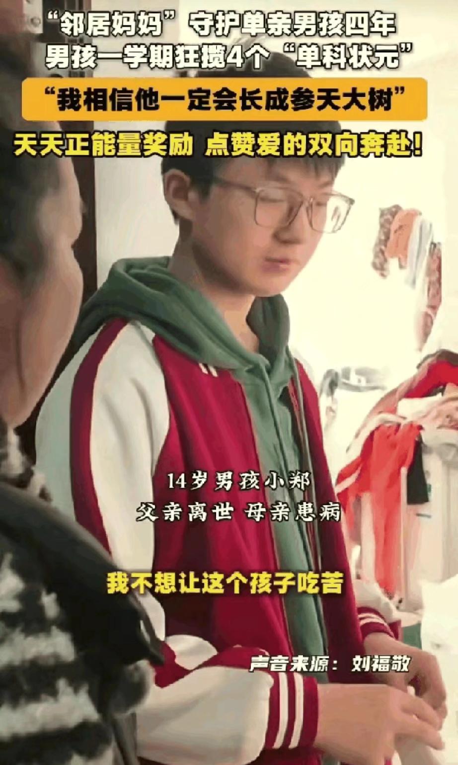 “邻居变亲妈!”河南14岁男孩父亲脑梗去世、母亲卧床,邻居刘福敬一把揽过照顾活儿,4年如一日,端药喂饭、擦身陪聊,硬是把困境娃托进期中考试四门单科状元。网友:这阿姨,照亮别人也点亮了未来! 据媒体12月报道,男孩10岁时父亲突发脑梗离世,母亲受刺激病重卧床,家里一下子失去顶梁柱。刘福敬自家也有两个孩子,却每天定闹钟准时上门,照顾病人、操心孩子,一天不落。 四年里,她替男孩家做饭、洗衣、换药,还常把自家饭菜端过来;男孩放学一路小跑回家,先给妈妈擦身、熬粥,再趴昏暗茶几写作业,刘阿姨把重活都揽下,让孩子安心上学。 今年期中成绩揭晓,男孩拿下语文、数学、英语、物理四科第一,他举着成绩单直奔刘阿姨家,一进门就喊“妈,我考了第一!”他把“努力学习,报答阿姨”的字条贴在书桌前,说要把这份善意继续传下去。 现在男孩性格开朗许多,见人就说刘阿姨就是自己的光。刘福敬却摆摆手:“谁见难不伸把手?”一句话,把邻里情说成平常事,却暖了整个社区。 对于这件事情,大家有什么看法?