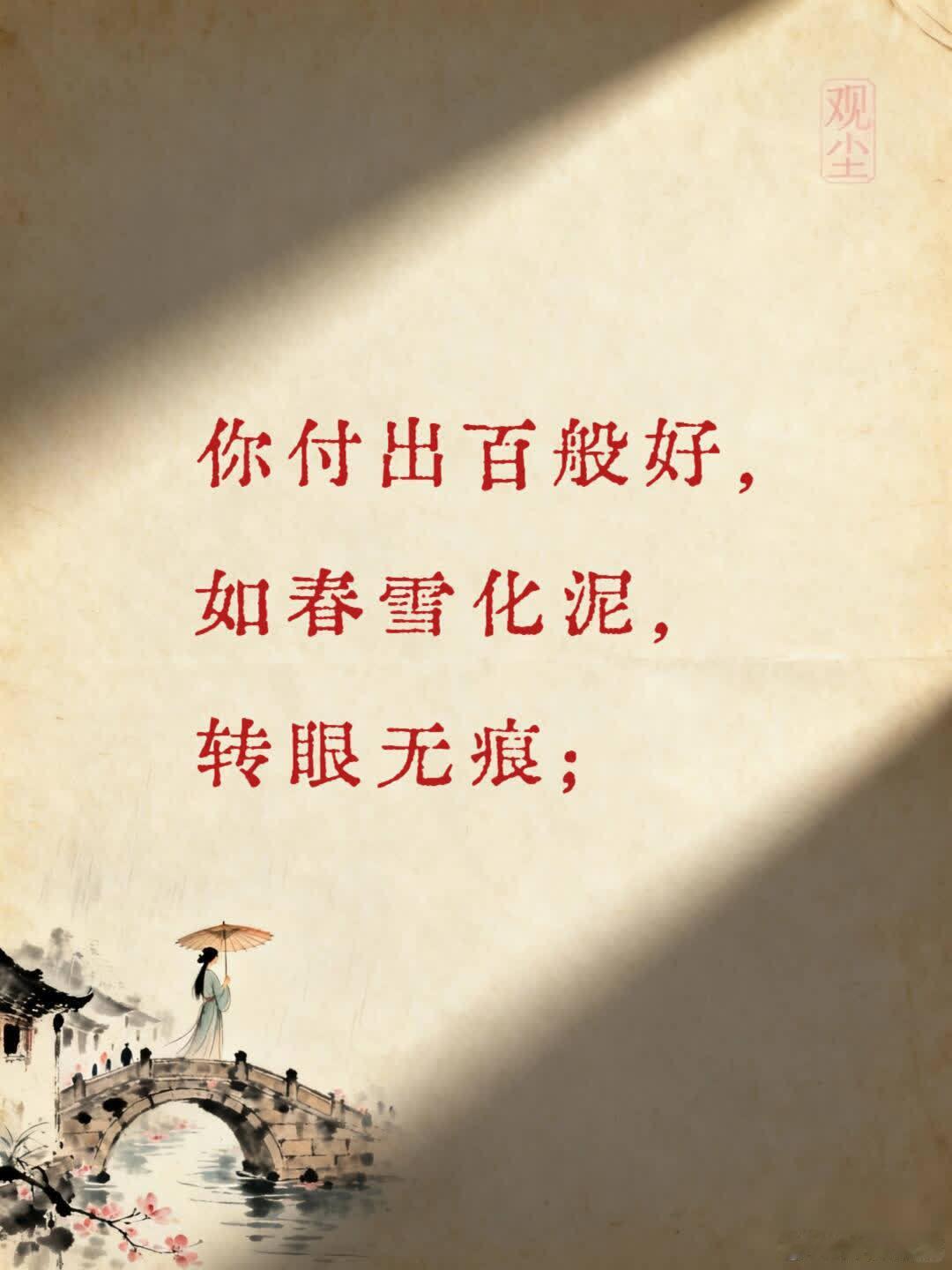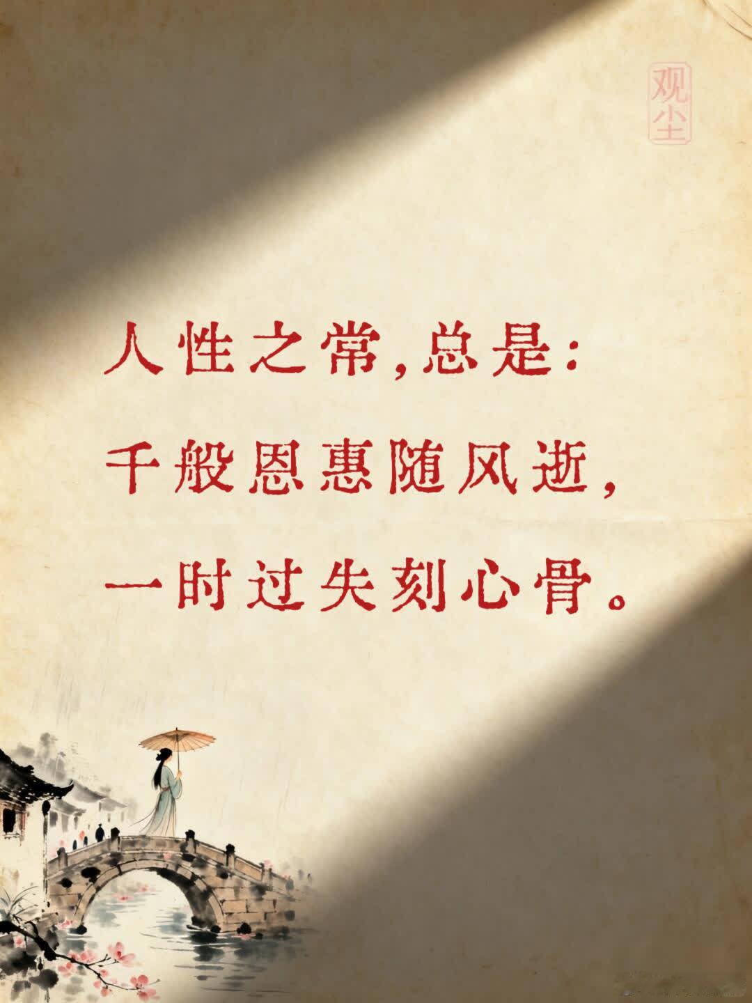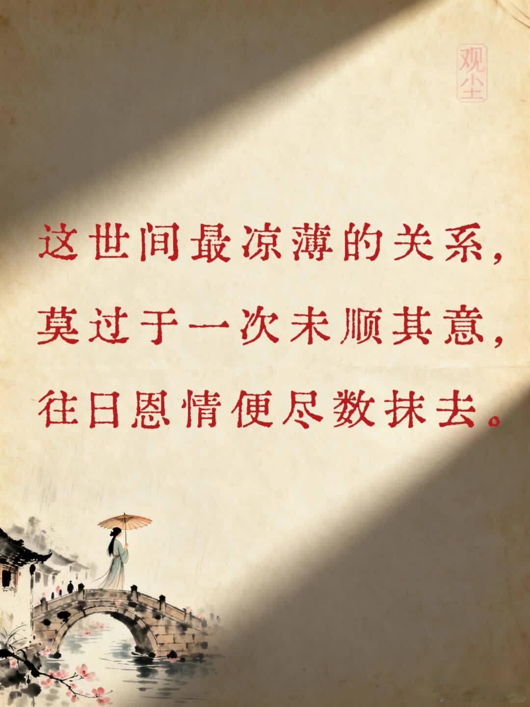 世情浅薄,人心难测——这世间最凉薄的关系 世情浅薄,人心难测 这世间最凉薄的关系, 莫过于一次未顺其意, 往日恩情便尽数抹去。 当你不复与人争执之时, 方悟众生皆困于己念。 毒蛇不知自身带毒, 凡人难觉心中有错。 你付出百般好,如春雪化泥,转眼无痕; 你偶有一次过,似刀刻青石,永存心间。 人性之常,总是: 千般恩惠随风逝,一时过失刻心骨。 ——既然人心难测,守心便好; 世情虽凉,记得对自己温暖。