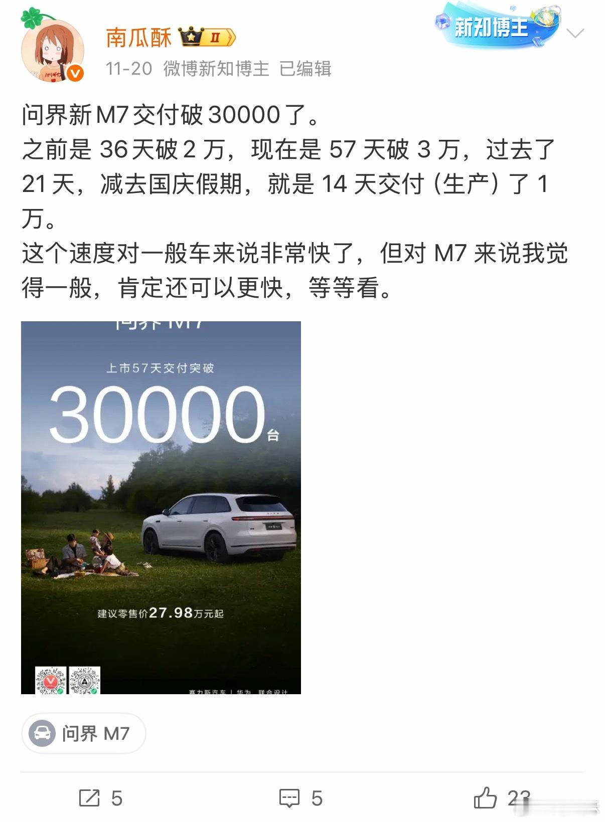 问界新M7 交付破 4 万了。之前是 57 天破 3 万,现在是 68 天破 4 万,也就是 11 天新增了一万。交付速度又提升了点,12 月份交付破 3 万应该没问题。