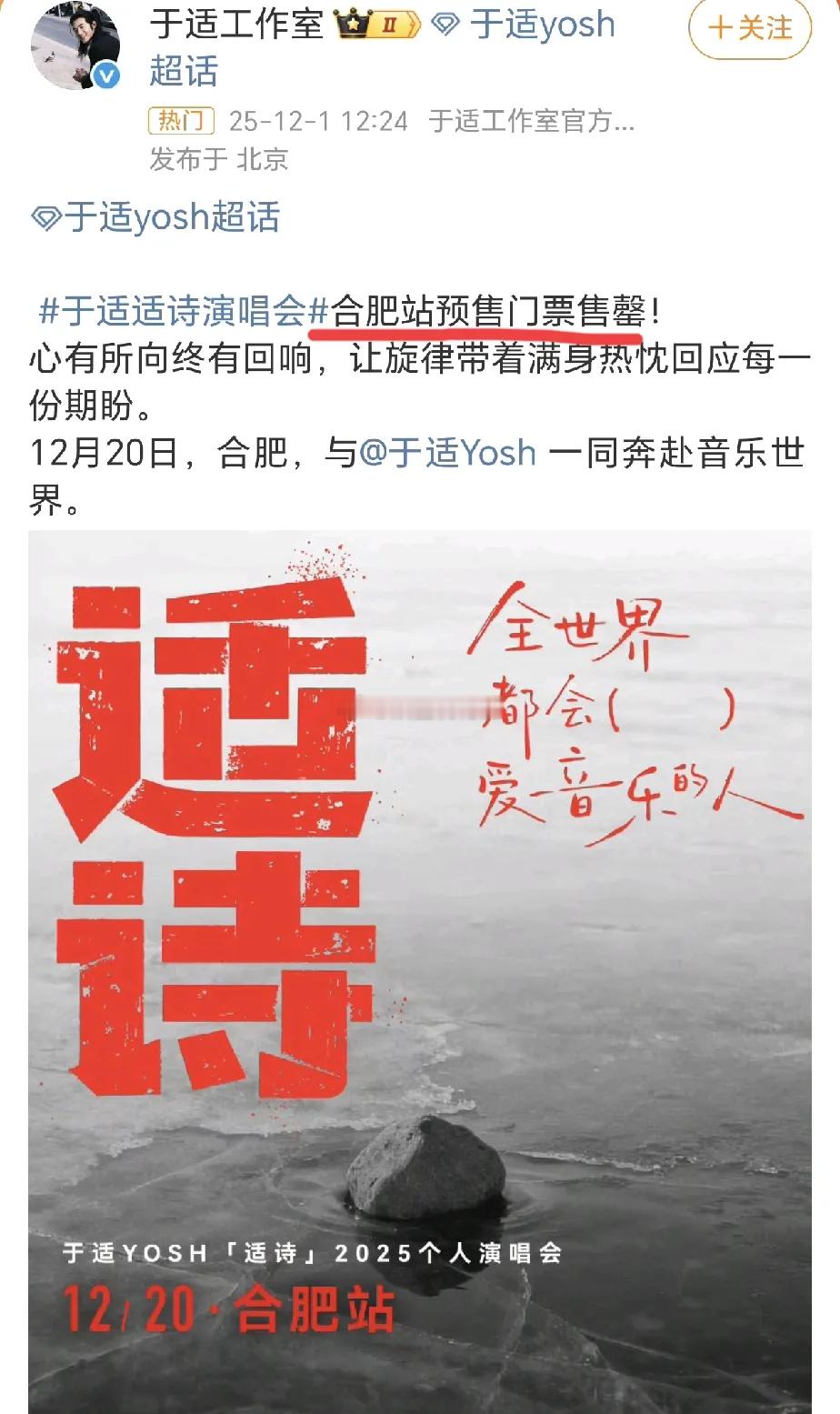 于适怎么不拍电影了??于适曾凭借优质电影资源活跃于大银幕,自《镖人》后逐渐低调,今年亮相多与骑马射箭比赛、音乐节相关。近日他官宣在合肥开演唱会,门票从380元到1680元不等,一开售便被抢空,热度惊人。这样的表现让人猜测,他或许在探索新赛道,若转型歌手,凭借当下的人气与市场反馈,或许能开辟出另一番天地。