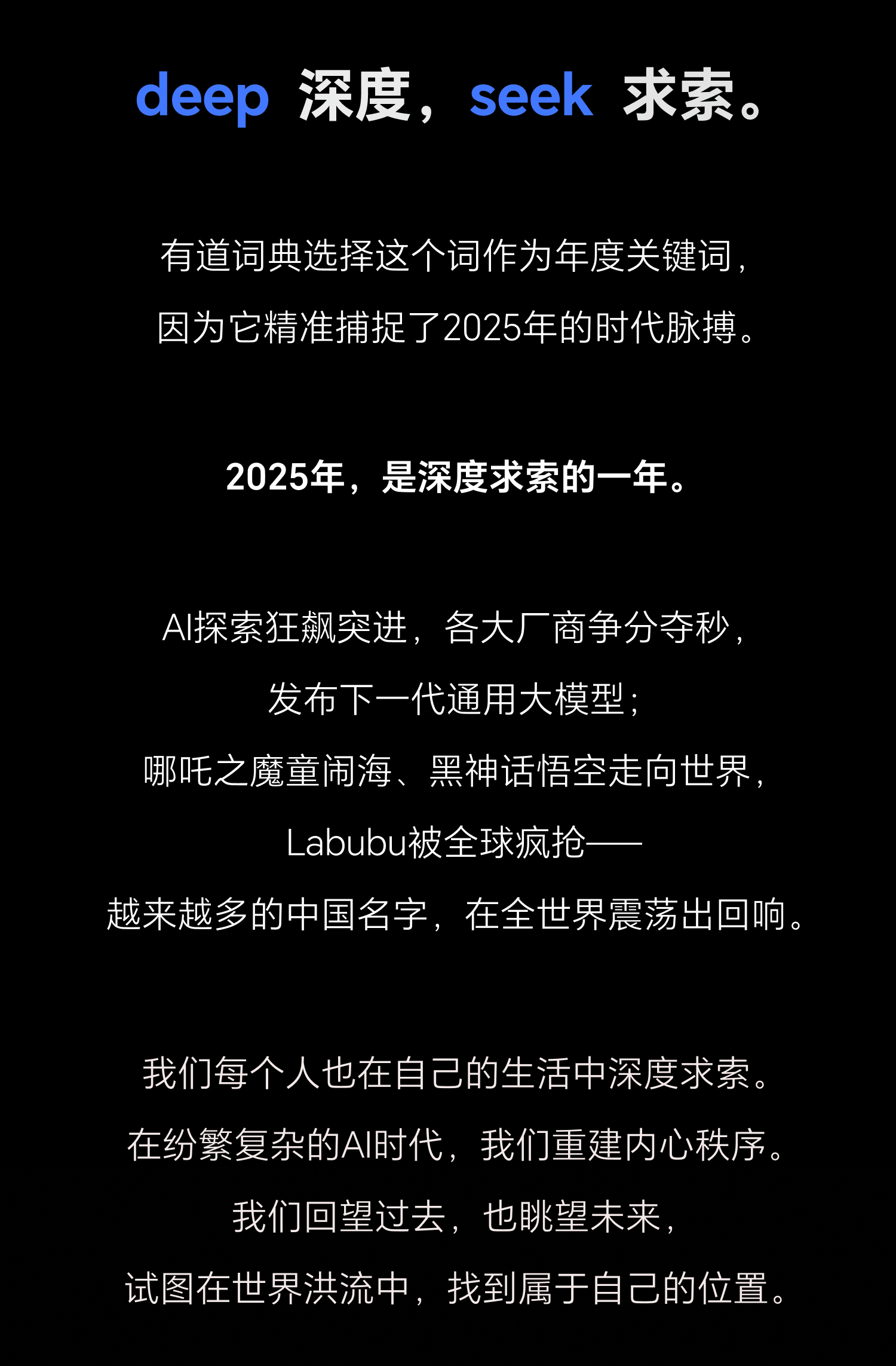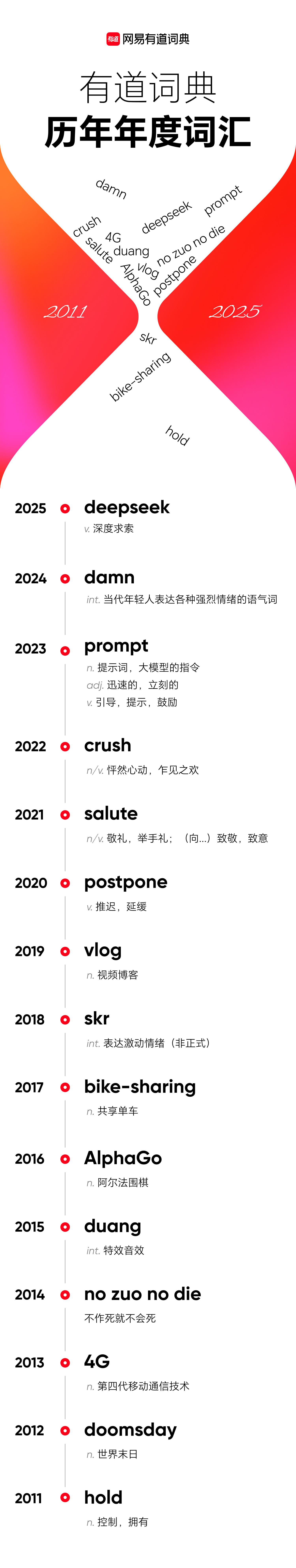 2025年度词汇盘点DeepSeek昨天刚发布全新的 V3.2 系列模型,推理能力达到了GPT-5 水平转头就看到了有道词典把deepseek评选为了2025年度词汇,恭喜有道词典押中题了。我挺喜欢今年有道词典对 deepseek 的解读:他们用了 deep-seek 这个单词本身的含义,deep:深度,seek:求索“在遍地答案中,重新学会提问;在算法的包围圈里,坚守人类的求知尊严。”deepseek 是一个生于 AI,但又对我们有 “摆脱AI依赖” 的启示的单词——当机器日益擅长回答,我们是否更应珍惜并锤炼那提出根本问题的能力?有道词典也同步公布了他们从2011年开始,过往15年的年度词汇:2011是“hold住”;2012是世界末日,doomsday;2014是no zuo no die;2015是duang;2017是bike-sharing,共享单车;AlphaGO都是快10年前的词了,那个时候AI还离我们很遥远,今天眨眼间我们都快步入AGI时代了。每年年底用一个单词回顾一下这一年还挺好的,希望有道词典一直做下去。你对哪年的年度词汇印象最深?deepseek当选2025年度词汇