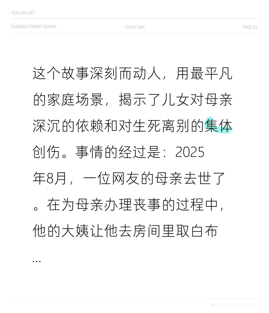 这个故事深刻而动人,用最平凡的家庭场景,揭示了儿女对母亲深沉的依赖和对生死离别的