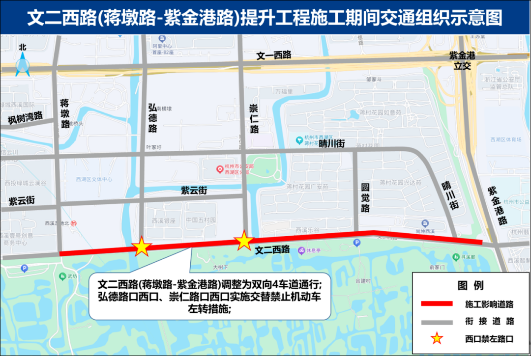 一、2025年12月9日至2026年12月8日,文二西路(蒋墩路—紫金港路)将占用部分道路空间进行施工。施工期间,文二西路(蒋墩路—紫金港路)路段维持双向4车道不变。文二西路弘德路西口、崇仁路西口实施交替禁止机动车左转措施。