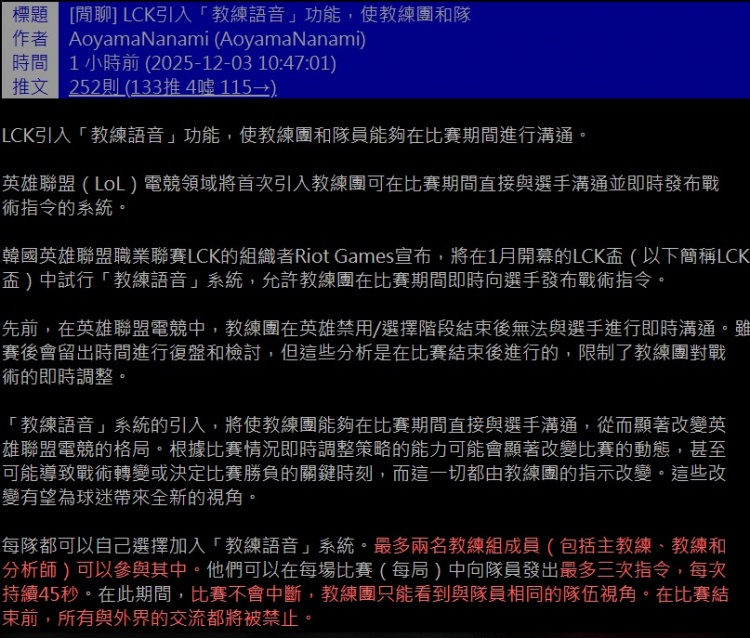 直播吧12月3日讯近日LCK官宣将在明年首先引入教练实时语音功能,对此PCS网友展开了热议;