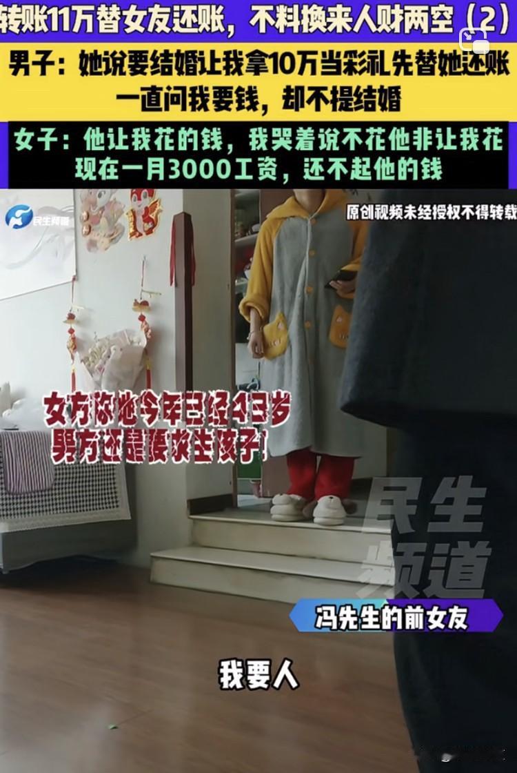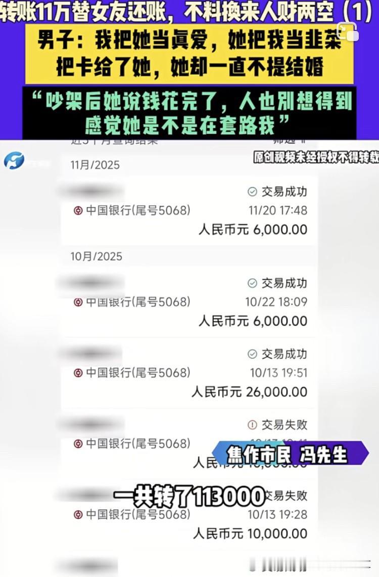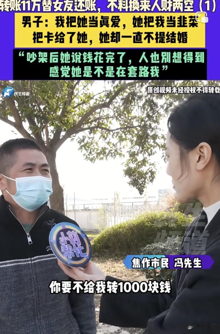 “我把她当真爱,她把我当韭菜。”河南焦作,冯先生对43岁女子一见钟情。相识不过几天,女子就提出要结婚。冯先生大喜,以为自己遇到了真爱。之后便花了11万为其还信用卡。结果等钱花完后,女友却说:“钱花完了,我人你也别想得到!” (来源:河南民生频道) 近日,来自河南焦作的冯先生发生了一件令其揪心无比的事,束手无策之下他求助了记者。 冯先生2013年离婚后一直单身,但他依然对爱情抱有美好的幻想,期待邂逅一段美好的爱情。 之后,在朋友的介绍下,冯先生认识了一位离异两次的女子。一见到她,冯先生藏在心里的小鹿猛地醒了,哒哒地撞着,撞得脸颊都在悄悄发烫。 而女子的行为举止也十分的热情,跟她聊天特别舒服,冯先生抛出的任何话题,她都能秒懂,接话接得又自然又有梗。两人就像天造地设的一对。 在采访中,冯先生更是直言:“一见面,我觉得俺俩是一见钟情,她非常热情,我当时就掉进了爱河里出不来了!” 令冯先生没想到的是,认识的第二天女子居然另一名陌生男子单独出去玩了。女子给冯先生打了视频电话,那名男子还乐呵呵跟他打招呼。 这简直就是赤裸裸的挑衅。 得知还有其他追求者,但凡有一点机会,冯先生都迫不及待地想要表现自己,想方设法的刷存在。 就在认识的第九天,女子告诉冯先生自己游玩的时候不小心弄脏了一件白衣服。试探性地询问冯先生能不能转她1000块钱,让她再买一身。 冯先生知道自己表现的机会来了,况且1000块钱也不多。为了讨女子欢心,冯先生毫不犹豫就转了。 日子没过几天,女子突然提出要结婚。冯先生对此很意外,但心想着人家女的都同意,他一个男的有什么好不同意的。更何况本身就对她有好感。 但结婚也是有条件的,女子向冯先生诉苦,说她欠了10万块钱,让其帮她还账,这钱就当是彩礼钱了。 对此,冯先生也是毫不犹豫地拿出了一张存有10万块钱的银行卡交与她。此事过后,女子三番四次的问冯先生要钱,冯先生每次都会给。前前后后一共给了她113000块钱。 而拿到钱后的女子却突然反水了,说两人认识的时间太短了,结婚的事情还得再等等。 冯先生蒙圈了,开始怀疑女子是不是在套路他。 两人因此闹矛盾分手,女子理直气壮地表示:“钱我已经花完了,我的人你也别想得到!”听到这话,冯先生心碎了一地,钱、人、心都给出去了,却换来这种结局。 跟记者说起此事时,冯先生心酸不已:“我以为她是我的一生挚爱,我把她当真爱,她却把我当韭菜!现在俺俩的感情该何去何从?” 由此可见,冯先生心里还抱有与女子感情复燃,走入婚姻殿堂的幻想。 随后,记者跟冯先生来到了女子的住处。冯先生卑微敲门:“你在屋里就开门中不中,咱俩说说话,把咱俩的事谈一谈中不中?” 女子也没逃避,潇洒地打开了门,并向记者道出了真相。 女子之前已经剖腹产生了两个娃,所以如果结婚她不会再生孩子。其次,因为欠了10万块钱的信用卡,如果结婚她要10万元彩礼。这两个条件冯先生当时都答应了。 然而突然有一天,冯先生反悔了,说无论是闺女还是儿子,反正都得生一个,彩礼钱可以多给。 女子不同意说:“我都43岁了,再生得要我命!”而冯先生却用无所谓地态度说:“我不要命,我要人!” 对此,女子十分失望。 在此之前,冯先生的一些行为举止更是让女子直呼受不了。只要女子不及时接电话,冯先生就以为她在跟别的男人睡,疑神疑鬼的行为让女子感到害怕,于是提出了分手。 而那113000块钱,当时分手时是冯先生不让其偿还。 聊天记录显示:“给你的卡从未想过要回,密码你也知道,取不取是你的事,等你把信用卡还完,我就把你拉黑删除永不打扰。” 对此,冯先生不买账了:“要是我没有目的,我会把钱交到你的手里吗?” 女子急了,连忙跟记者解释:“他让我把钱花完之后,他又来找我,问我结不结婚,不结就把钱还给我。这不是坑我吗?钱是他自己不要的!” 面对女子的说法,记者也不知道该如何处理了。 女子再次补充道:“我不花的时候他非要我花,我哭着说不花,他就是非要我花!我现在已经花完了,我一个月3000块钱的工资,我也确实还不起!” 冯先生其实是抱着复合的想法来找女子的,但女子的态度坚决,不愿再续旧情。冯先生只好灰溜溜地离开了。 但冯先生可不想当老好人,他决定收集证据起诉女子。对此他有感而发:“钱是留不住人的!” 律师提醒:以结婚为目的的大额转账,若所附条件未达成,赠与人可要求返还。但需要提供转账凭证、聊天记录等证据来证明该转账是以结婚为目的的附条件赠与。 在我看来,真心不该是无底线的筹码。在感情里可以真诚,但不能盲目。涉及大额金钱时一定要慎重再慎重!爱要留给值得的人,别让有心之人有可乘之机!