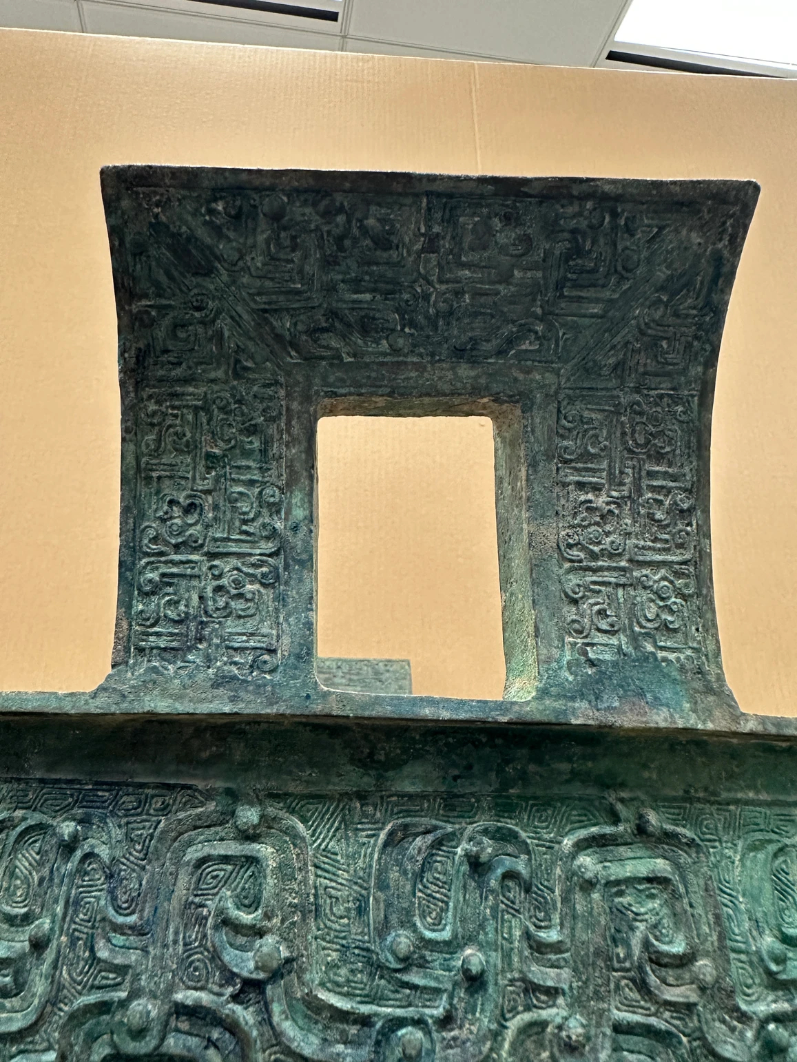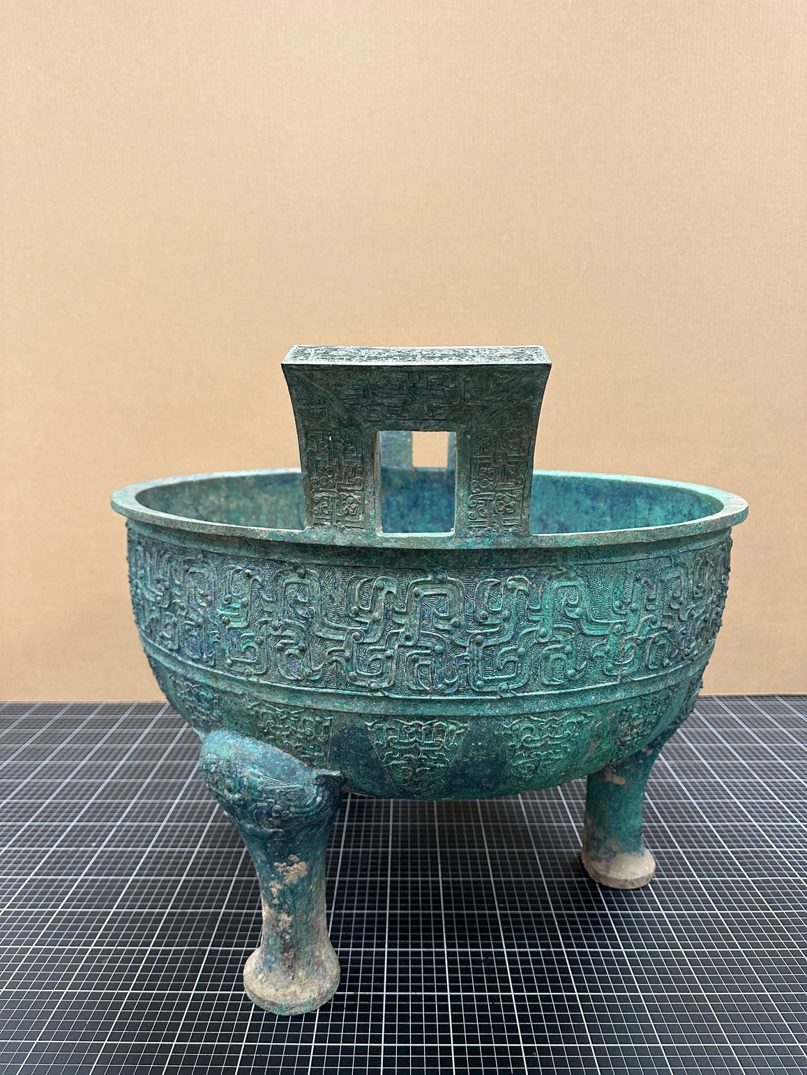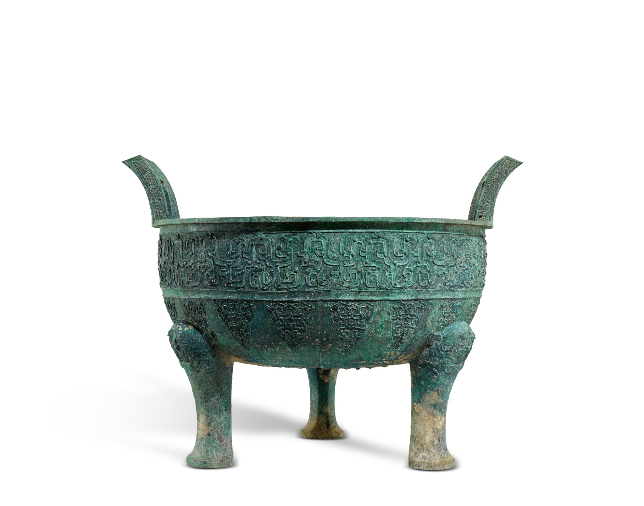 每天一件青铜器 苏富比香港的日本冈田美术馆“还债”特拍上拍一对春秋晚期:变形龙纹大鼎. 190.5万港币成交. 鼎非常大, 62.5 * 55 * 48.5 cm. 纹饰也比较特别, 采用了模印的变体龙纹交缠不断, 云雷纹填地.下方的三角纹也由复杂的龙纹变体而来. 外侈的巨大方孔附耳上也模印了龙纹.