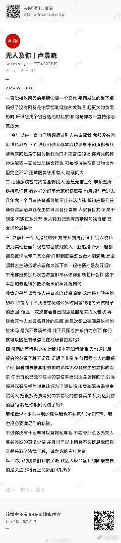 无人及你发文回应卢昱晓站姐无人及你发文回应,否认抽抽乐赚钱未全部投入,暂未回应工