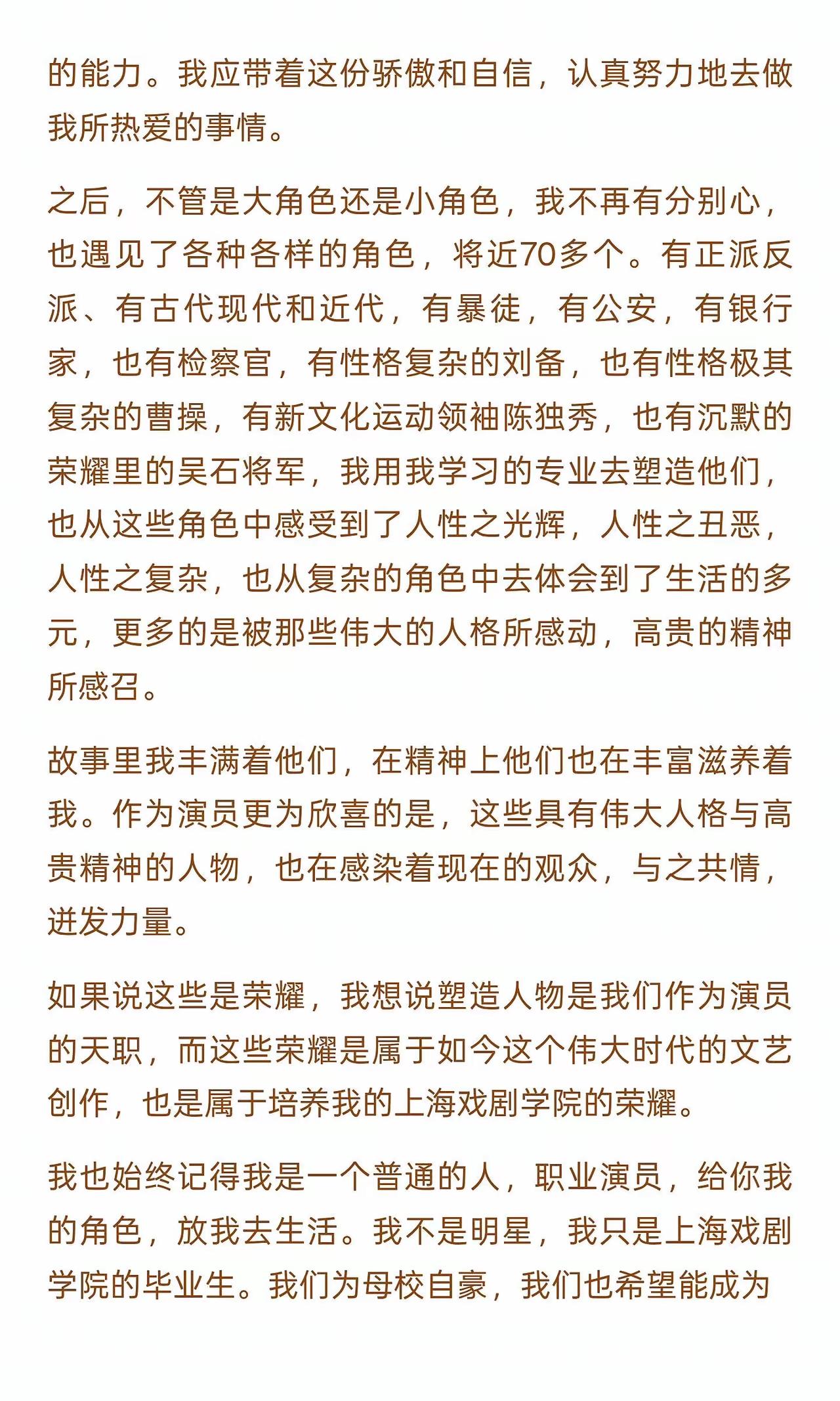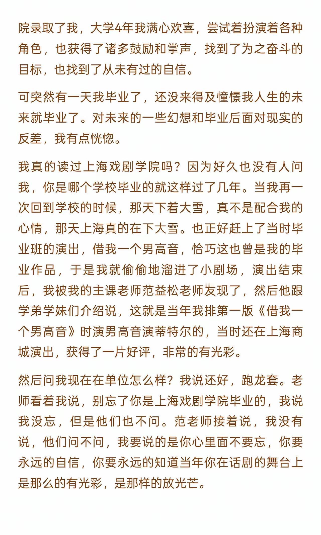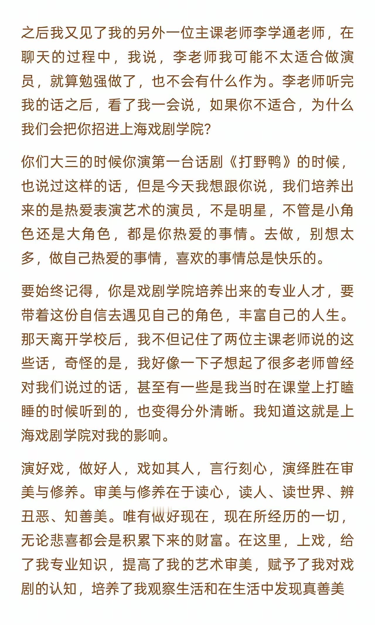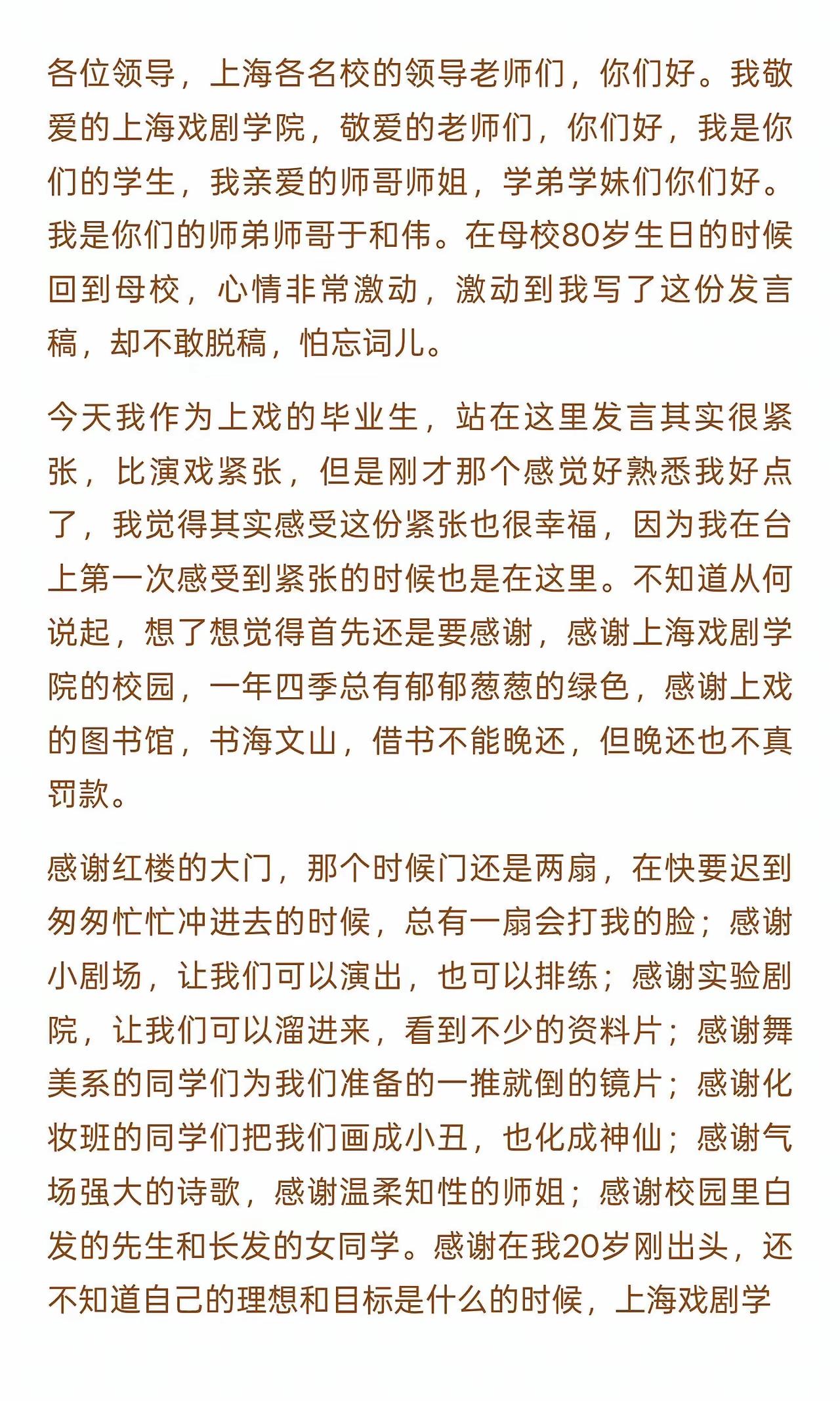 于和伟回上戏那番发言,看完真觉得——有些东西,AI再能写,也学不来。 没有套话,上来就说“当年考学,文化课差点挂科,老师偷偷塞给我复习资料”;不提奖杯不提票房,净说些“第一次排小品紧张到忘词,同学把台词写在手心给我看”的小事。台下笑成一片,他自己也挠着头乐,说“现在想想,那点窘迫比后来拿奖还记牢”。 这哪是演讲啊,分明是坐你对面唠嗑。没有“感恩时代”的大词,就说“当年食堂阿姨总多给我打一勺肉,现在见了还能叫出我名字”;不谈“艺术追求”,只讲“第一次演路人甲,为了抢一个镜头跟同学吵了一架,后来俩人成了一辈子的朋友”。 AI能生成“感恩母校培育”的排比句,却写不出“排练厅第三排座椅有个钉子,当年总硌我屁股”这种带着体温的细节。它能算出“奋斗”“坚持”这些词的热度,却模拟不出于和伟说“那时候穷,一双鞋穿到露脚趾,老师把他儿子的鞋给我穿”时,眼里一闪而过的红。 现在太多发言像复制粘贴,开头必提“岁月如梭”,结尾准是“再创辉煌”。于和伟偏不,就捧着一颗真心,把自己摔过的跤、受过的暖全倒出来。台下的学生听得眼睛发亮,不是因为他多成功,而是从他话里看到了自己——那些笨拙的、青涩的、被人帮过的瞬间,原来大佬也曾经历过。 说白了,能打动人的从不是华丽辞藻。是你我都懂的那份真实,是藏在细节里的烟火气,是“我也曾和你一样”的共情。这些东西,数据库里搜不到,算法算不出,只能从实实在在的日子里长出来。 下次再写发言稿,别总想着“高大上”。不如学学于和伟,多捡点生活里的碎金子——那些有点糗、有点暖、有点傻的瞬间,才最能戳中人。