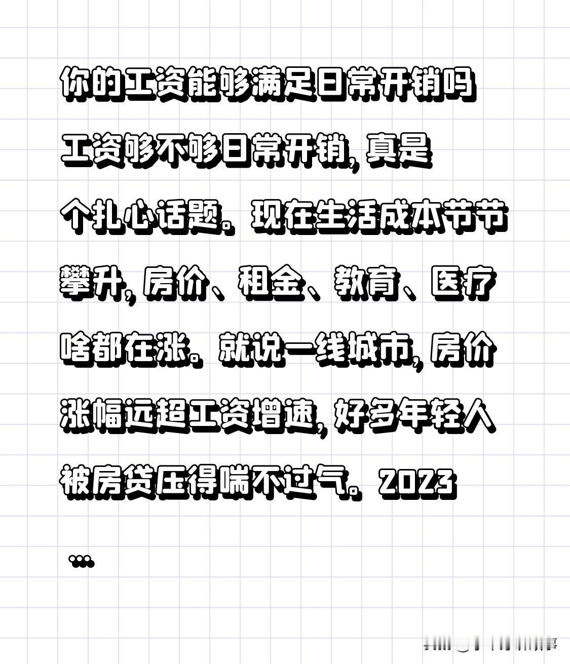 你的工资能够满足日常开销吗 你的工资能否满足日常开销?这真是个扎心话题。如今生活成本不断攀升,房价、租金、教育、医疗等费用都在上涨。一线城市房价涨幅远超工资增速,不少年轻人被房贷压得喘不过气。 2023 年我国城镇非私营单位就业人员平均工资有所增长,但大项支出也猛涨。北京、上海普通家庭月支出轻松过万,工资只有三五千,满足日常开销太难,不透支就很厉害了。 我们要学会合理消费,该省则省该花就花,还要存钱,遇事才不慌。