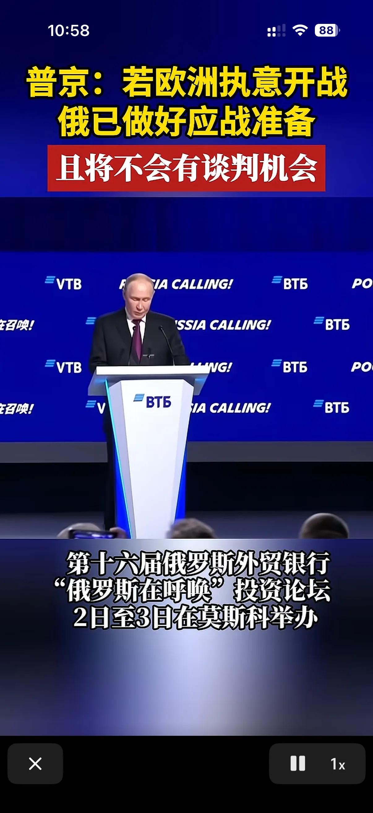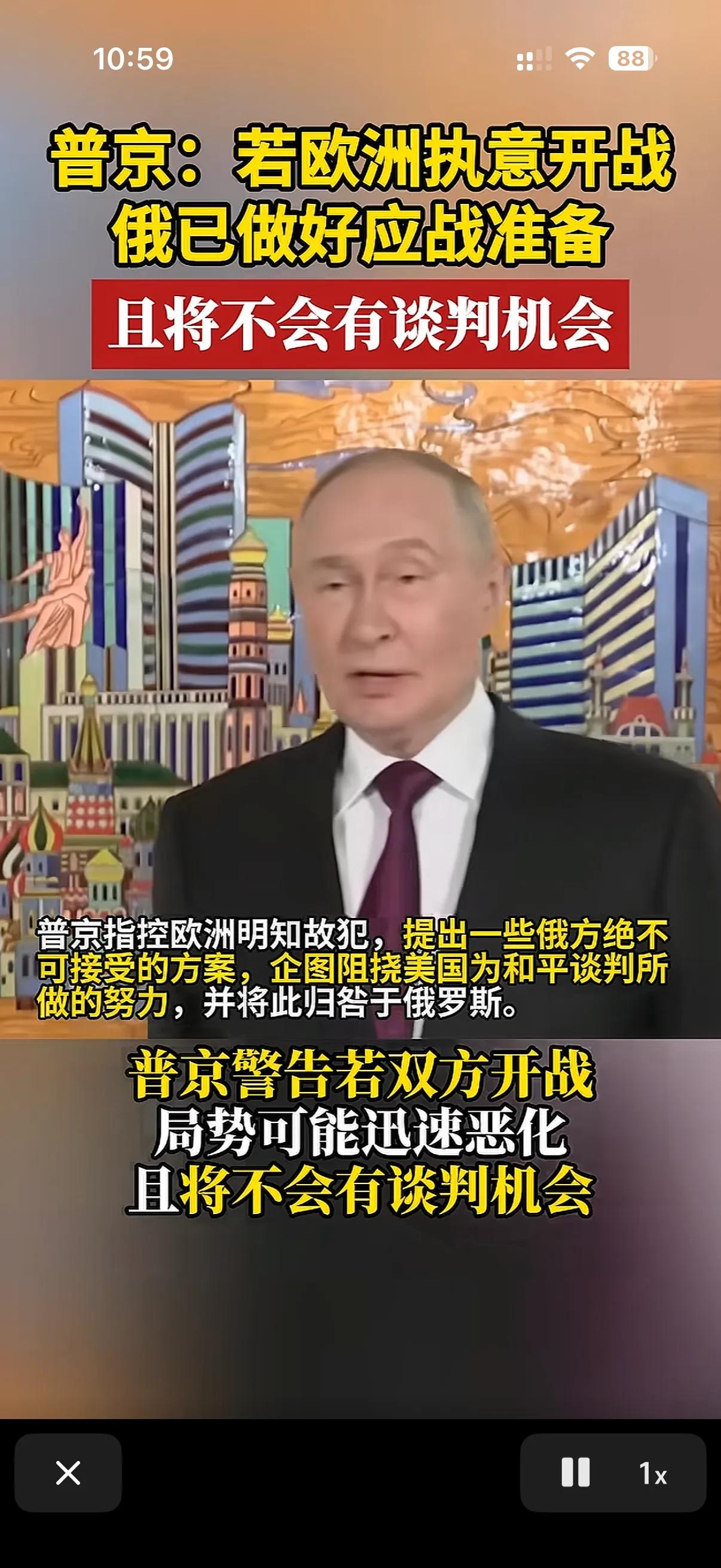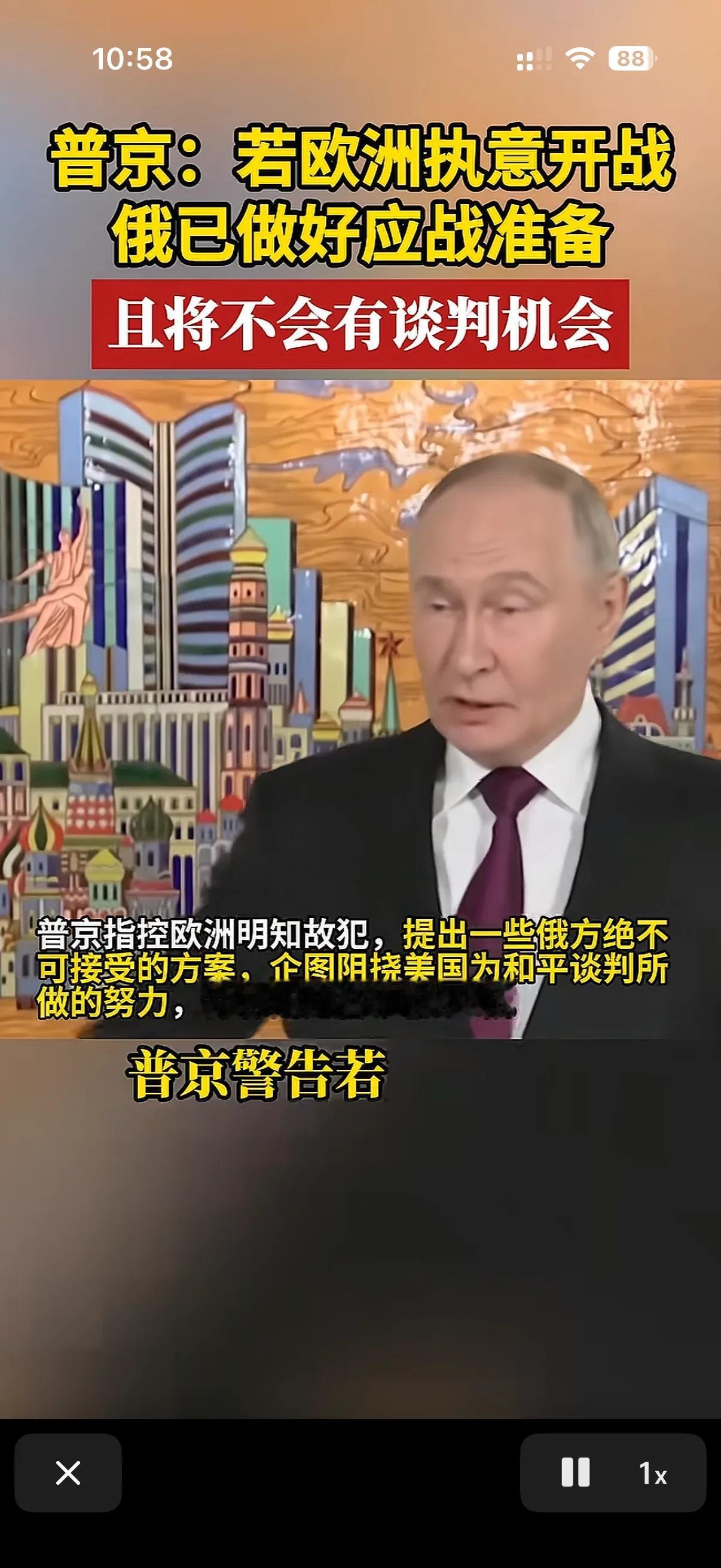 如果欧洲执意开战,那么将不会再有谈判机会! 这是俄罗斯总统普京在一次公开讲话时说的! 最近令人瞩目的俄乌和谈再一次的失败了! 究其原因就是原本美俄谈好的28条和谈比乌克兰和欧盟变成了19条!这是俄罗斯不能接受的! 尤其是在这个关键时刻,欧盟一些国家还在大秀自家的军事实力,甚至有的国家都做好了战争准备,将自家的军队开到了乌克兰边境,大有战争一旦开始,立刻加入进去的样子! 对此俄罗斯作出这样的回应就没什么稀奇了! 至于是一旦欧盟开战以后,以后不会再有和谈的机会是针对乌克兰还是整个欧洲那就不得而知了! 但是大家都知道一旦欧盟真的加入俄乌冲突,帮助乌克兰对抗俄罗斯,那么真的久和第三次世界大战没什么区别了!