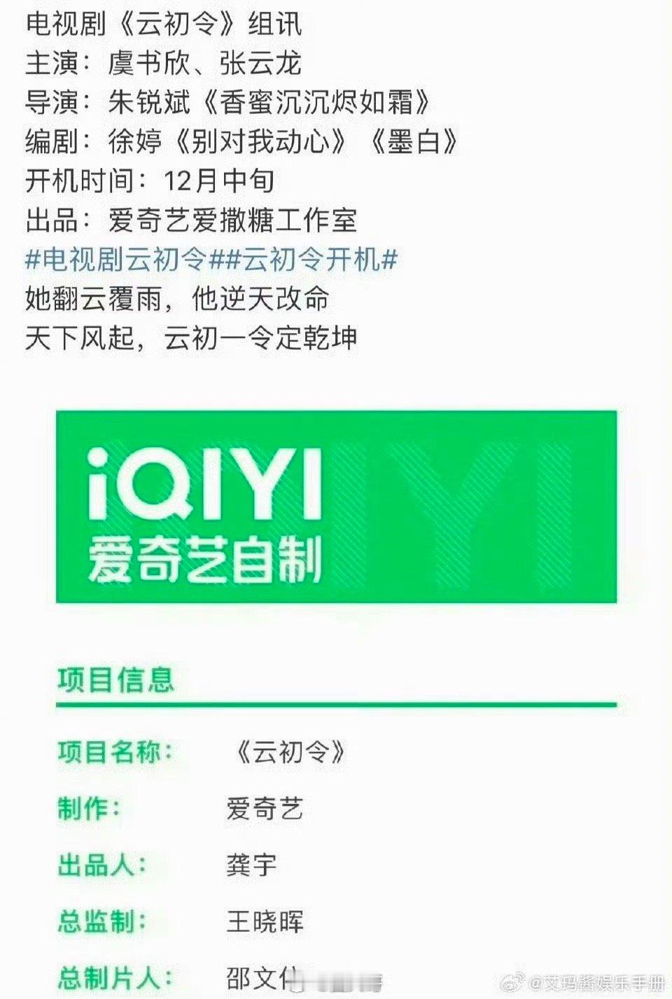 曝虞书欣没签云初令 虞书欣《云初令》居然没签啊,现在瓜主也否认了《云初令》的开机时间。就是说虞书欣两部古装剧都待定了,《一念江南》官宣后也延期开机了,好久没见虞书欣的营业物料了,心疼欣欣子的粉丝们了~瓜主否认云初令开机时间