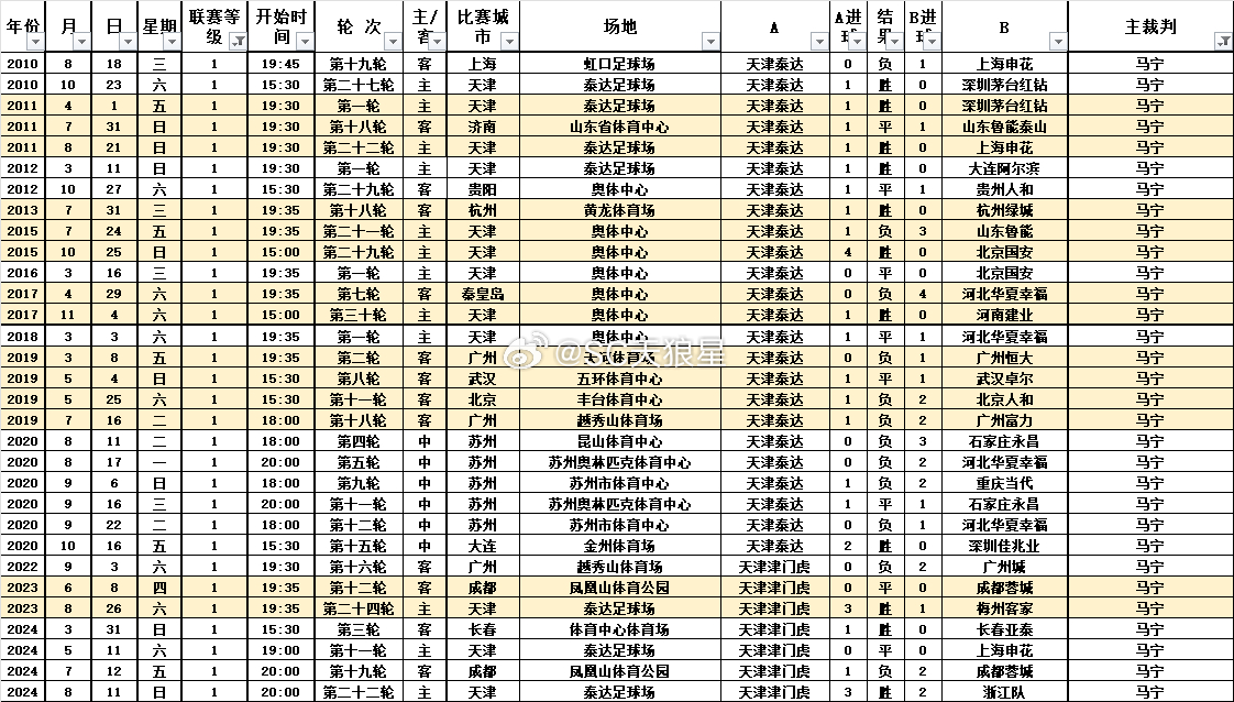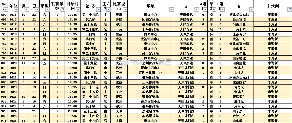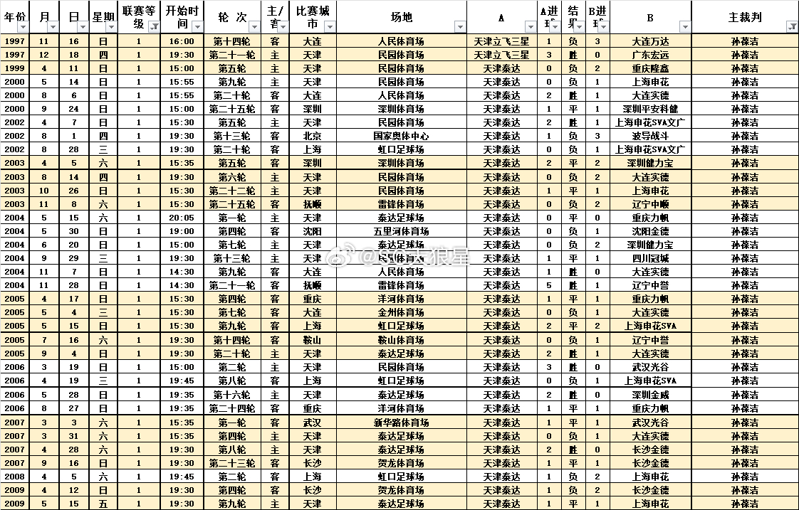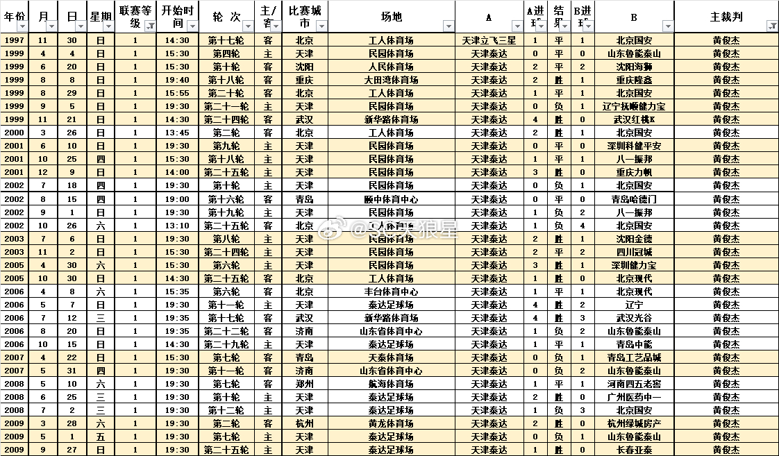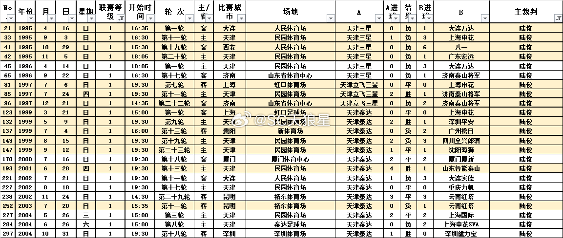 赛季结束,可以好好搞搞之前没时间弄的数据。先把职业化以来,所有比赛的裁判信息弄全。中超时代的数据好找,但是早期甲B,足协杯,中超杯的信息肯定是找不到。所以,在的数据基础上,我就直接摘了桃子,把所有正式比赛中,能找到的裁判信息整理成excel表格。至少,顶级联赛的主裁判信息是全的。其中,顶级联赛中,主哨最多的裁判是谭海,36场联赛。之后是孙葆洁35场 黄俊杰32场 马宁31场 陆俊/李海新23场谭海36场成绩: 19胜11平6负孙葆洁35场成绩:9胜11平15负黄俊杰32场成绩:12胜11平9负马宁31场成绩: 11胜8平12负天津津门虎中超联赛天津津门虎 北京