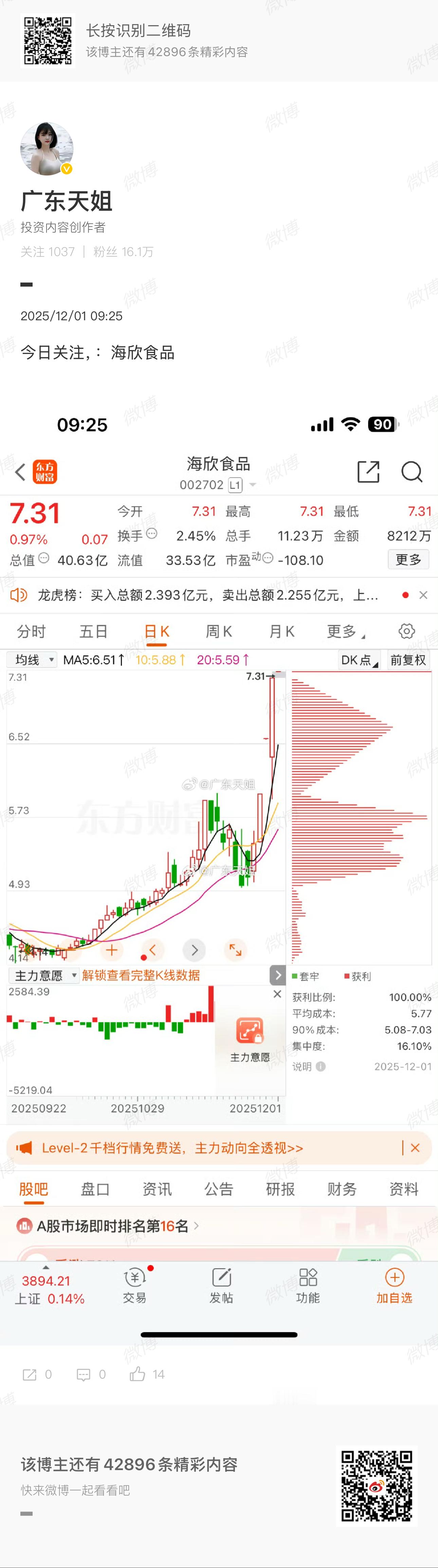 海欣食品三连板!飞龙在天,吃肉的朋友请集合前天盘前直播间刚点出海欣食品,今天直接封死涨停,喜提三板,完美兑现“飞龙在天”的强势行情 !必须狠狠恭喜跟上节奏、果断上车的朋友们,这波肉吃得够香!行情永远是机会与考验并存,能精准踩中节点,靠的就是对热点的敏锐嗅觉和龙头逻辑的把握 。还在观望、没踩准节奏的粉丝别着急,股市从不是一蹴而就的战场 。想知道接下来如何抓主线、找机会?直接私信天姐,带你拆解龙头战法,下次行情绝不踏空!