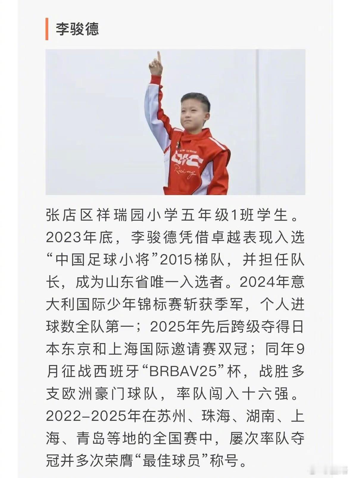 中国足球小将2015队长李骏德,荣获2025年度淄博市“新时代好少年”的光荣称号!祝贺!