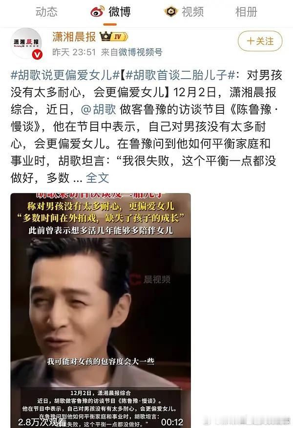 胡歌二胎 时间胡歌在采访里说的是男孩和女孩的教育方式不一样,说了自己女儿在青海陪