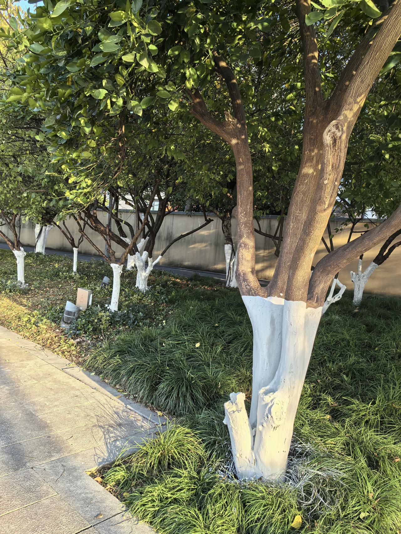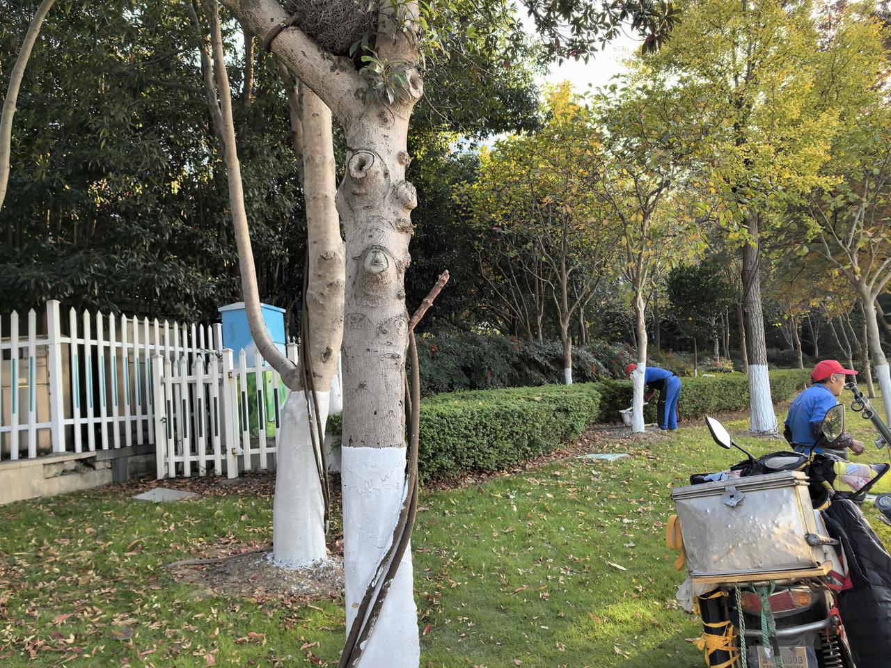 天冷了,树木也要“穿冬装”了。 今天去江边跑步,远远看着有好几位园林公司的师傅们在给树干下半部分刷白漆。 好奇的走过去问师傅们这树刷白漆是不是就是给树保暖?一个老师傅笑着说,我们给树穿冬装作用可不止保暖,这涂白剂不是白漆,是生石灰和石硫合剂混合制成的。一是杀树木的病菌和害虫,二是防冻防开裂,三是防日晒导致的温差太大。 看来我以前以为的给树刷白漆就是防冻保暖还是很不全面的,这下明白了。