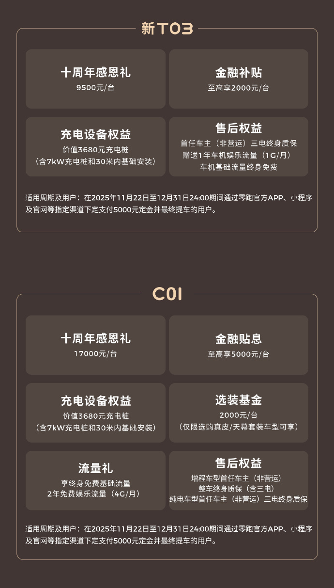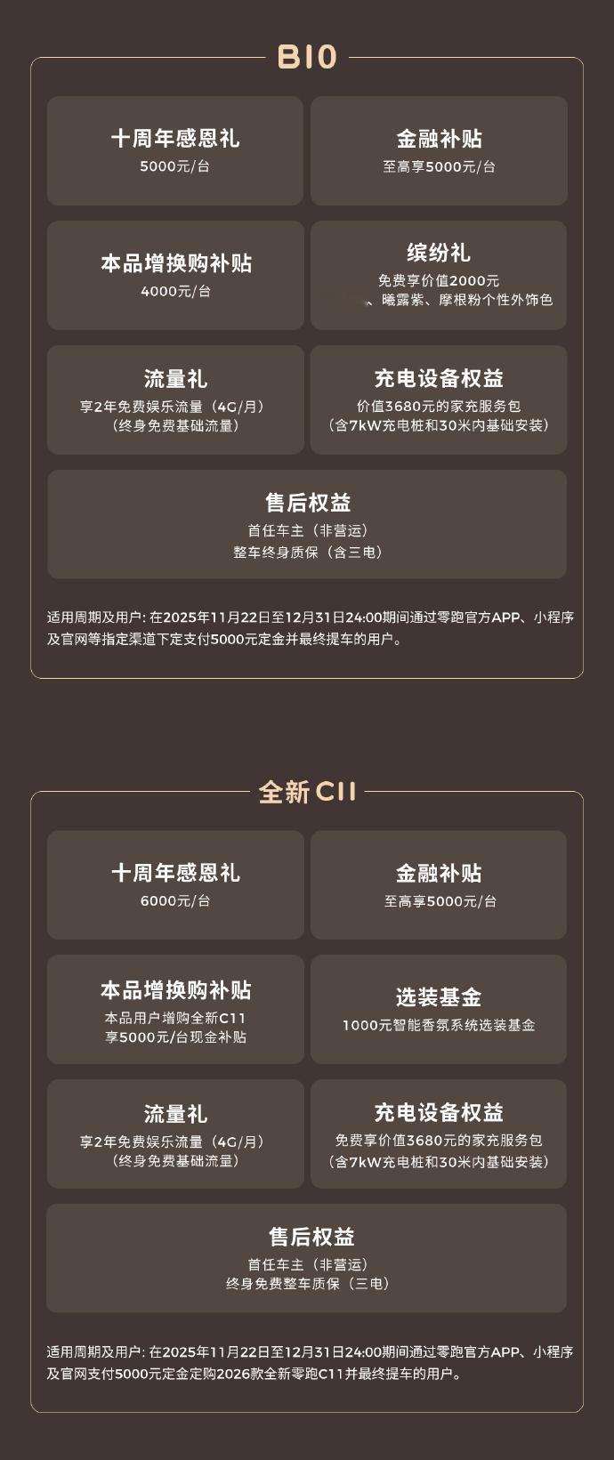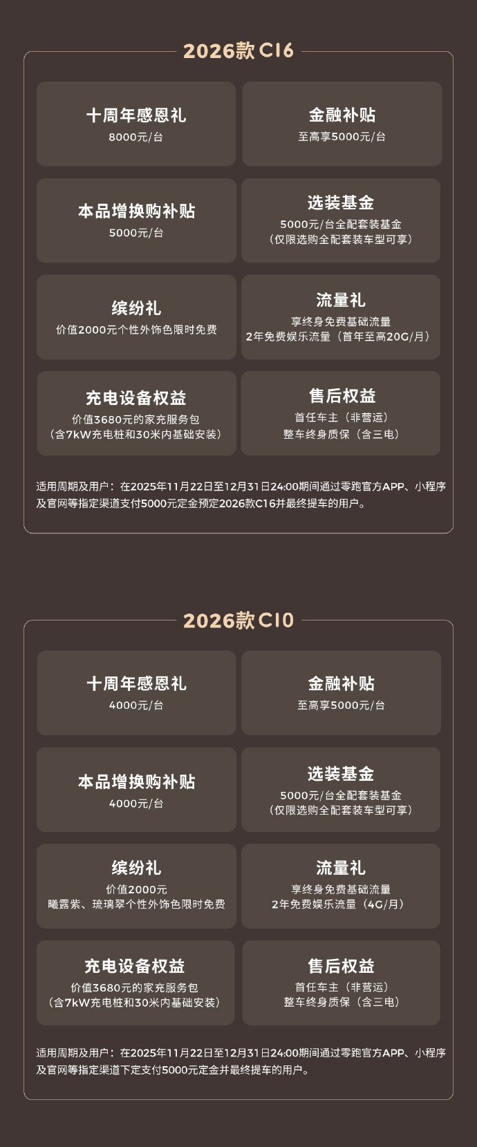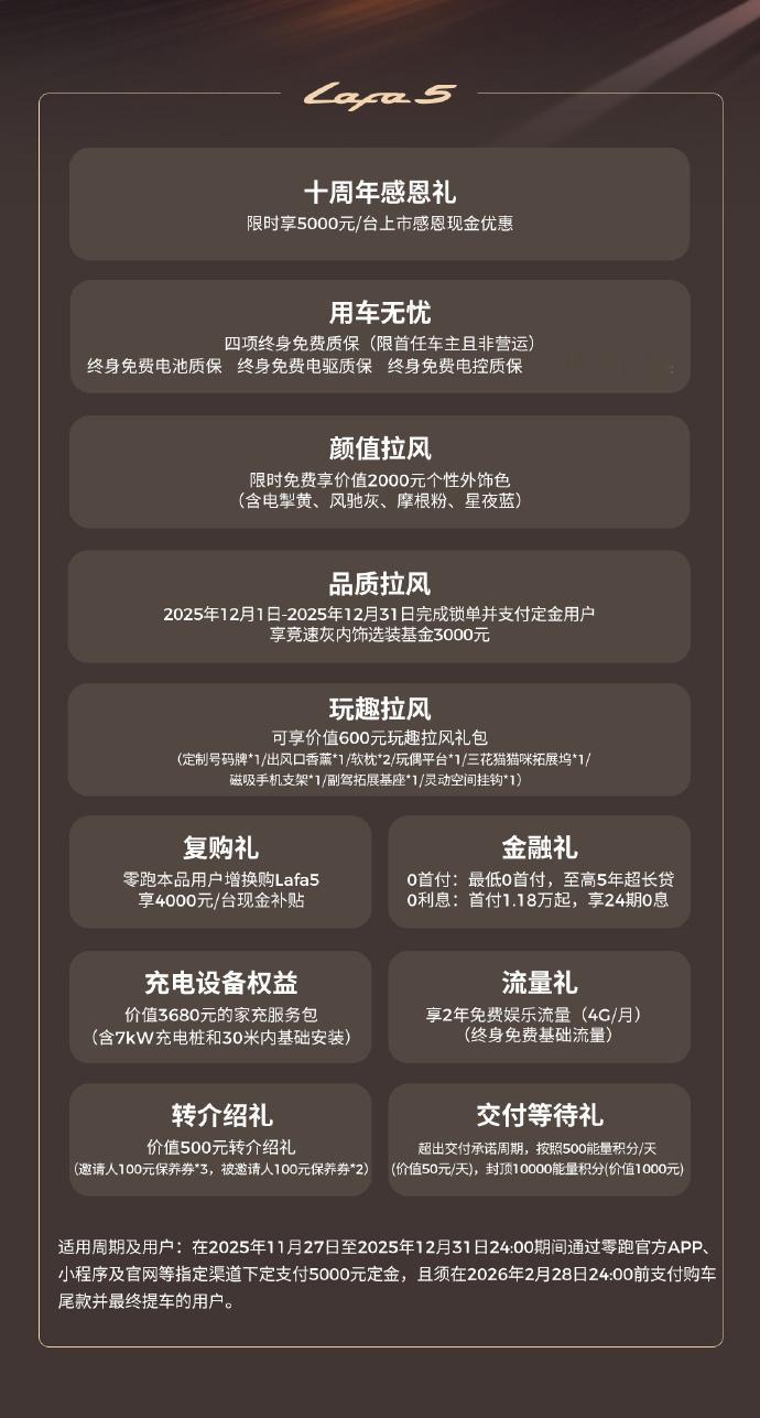 车若初见 零跑推12月购车福利政策,ABCD系列、还有Lafa5都包含在里面,权益有国家补贴、置换补贴、选装基金、金融优惠、补能服务和终身质保等,截止日期到12月31日,东西还是挺多挺满的,最近想开上新车的小伙伴,抓紧时间上车吧~