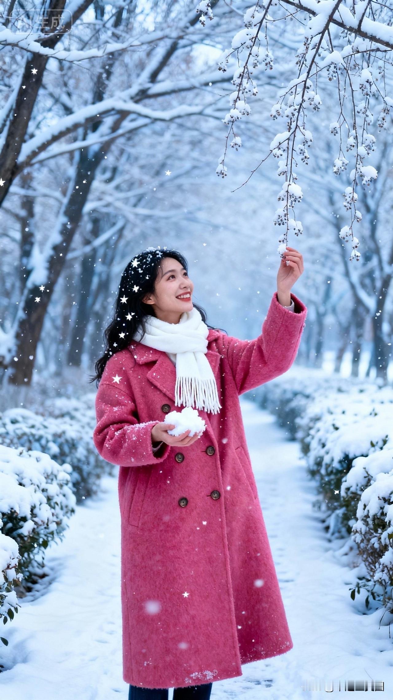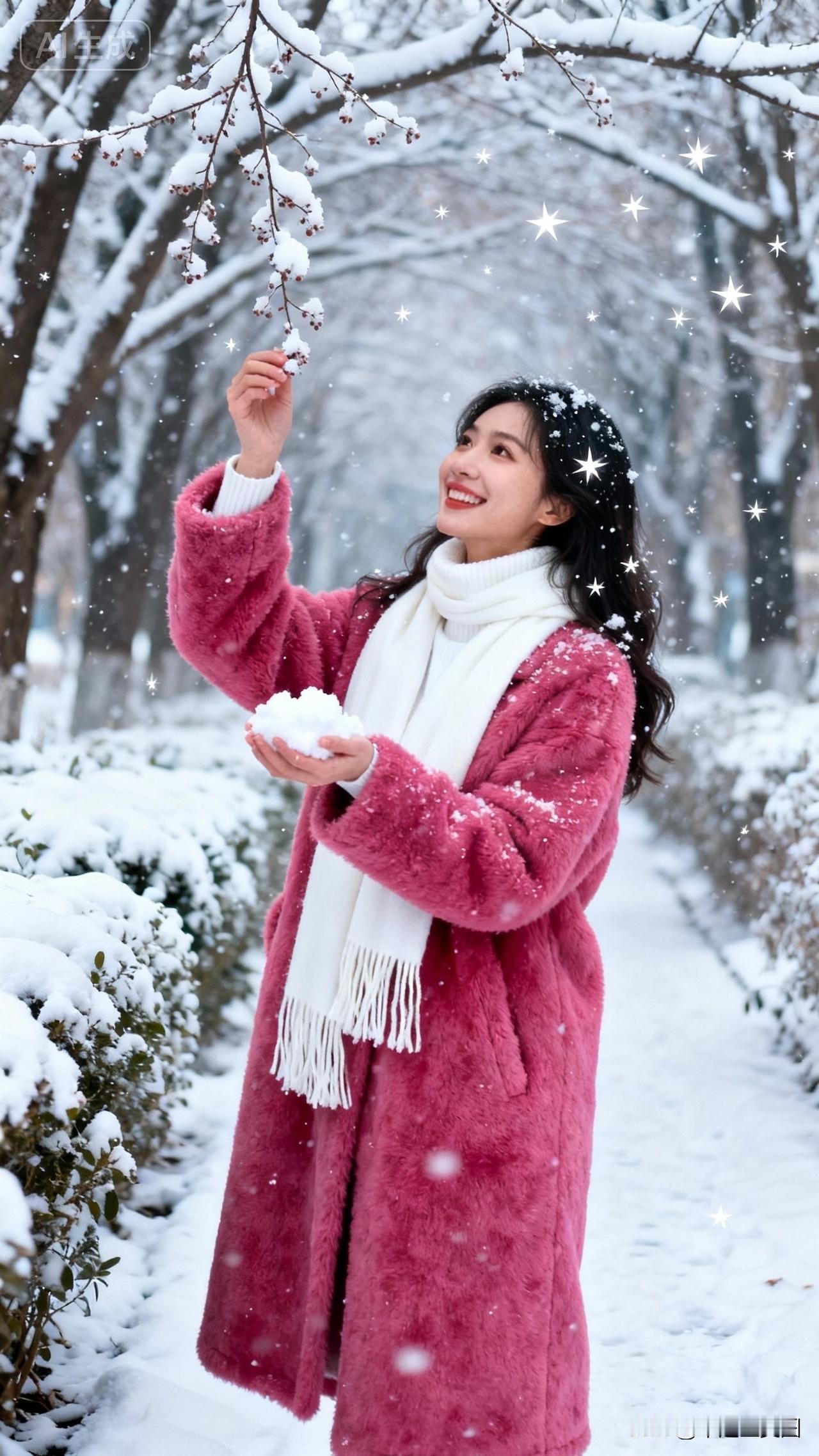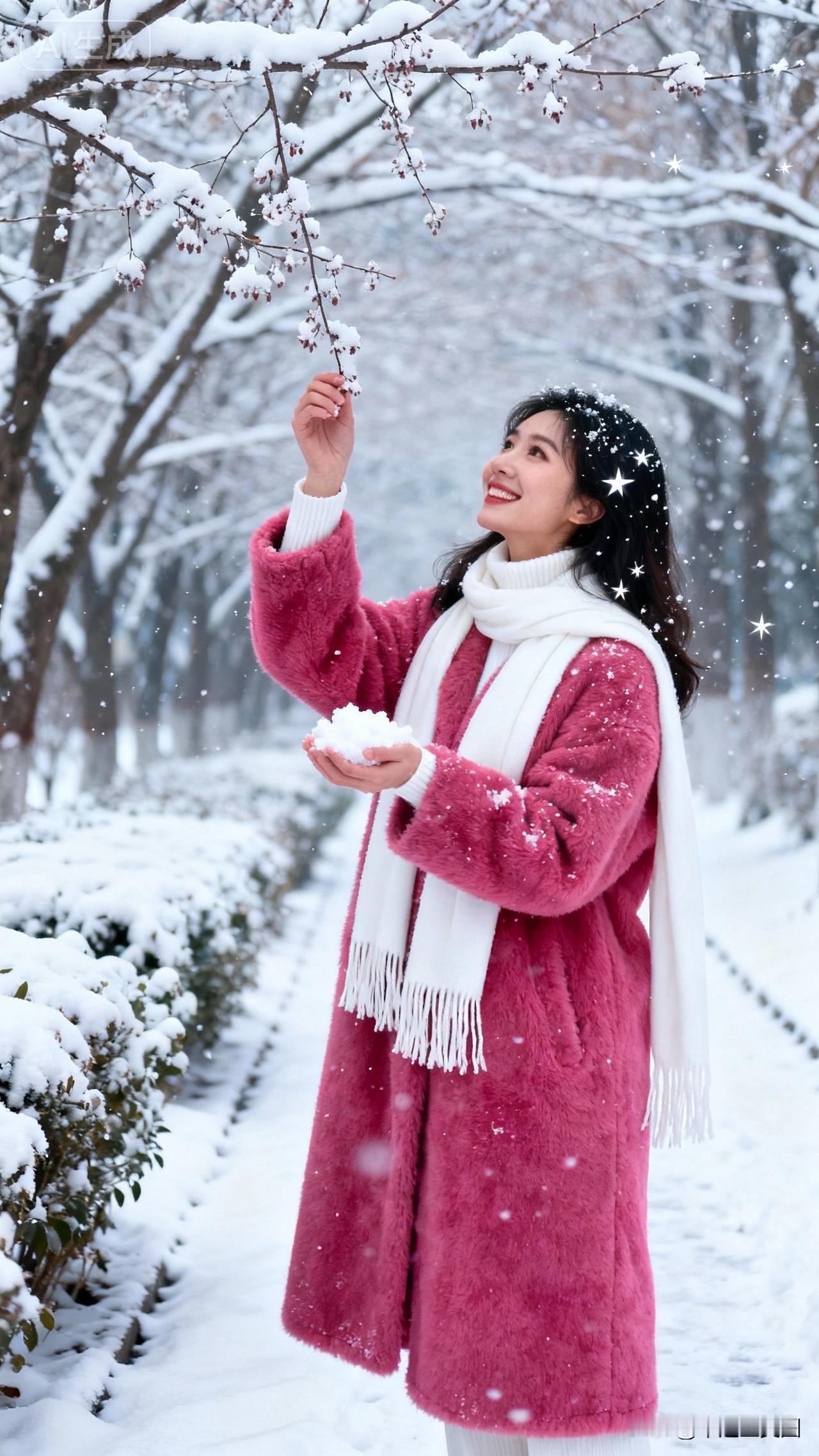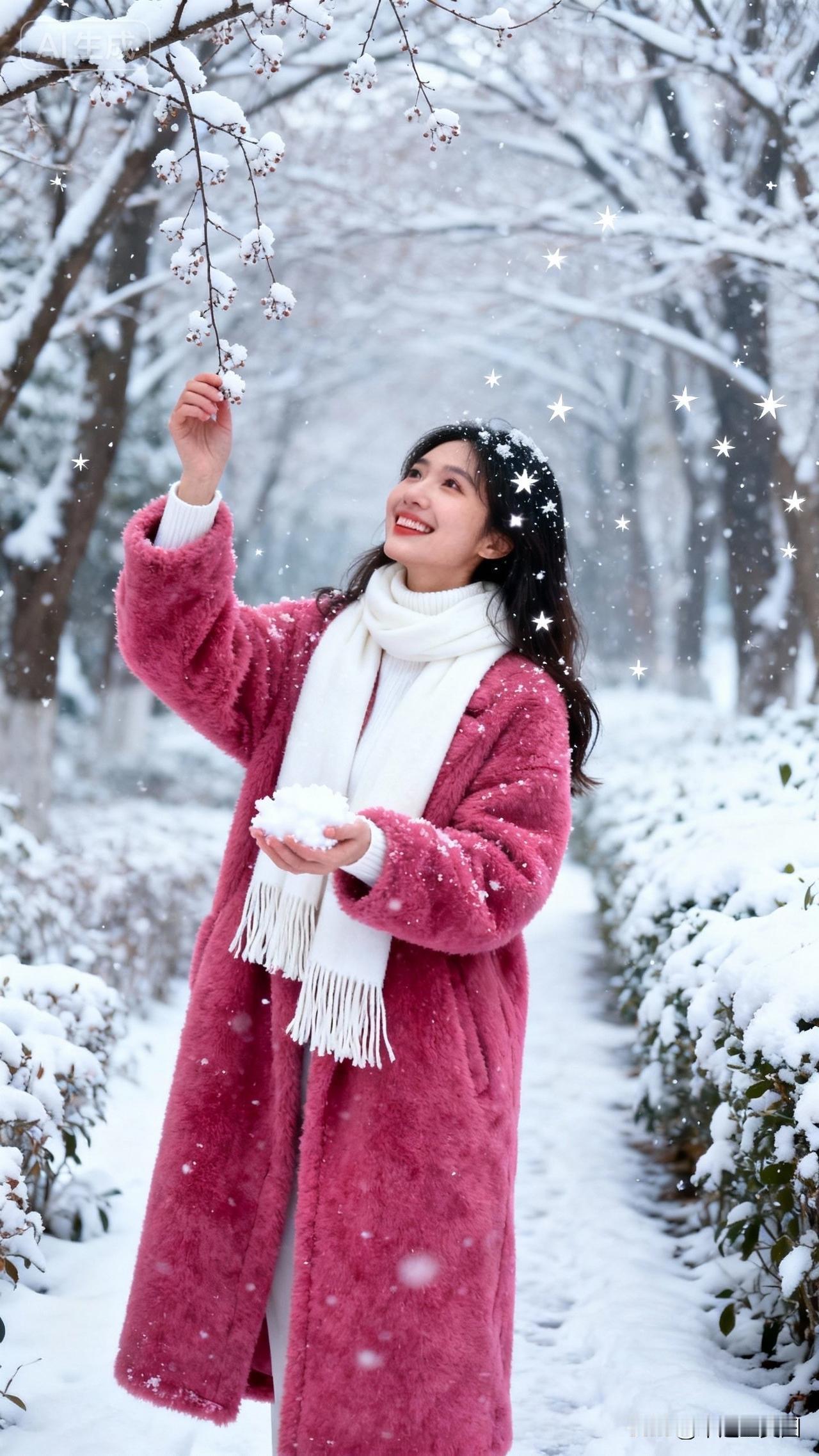 冬日雪景中的少女,粉色的外套与白雪相映成趣,笑靥如花,宛如童话中的公主。