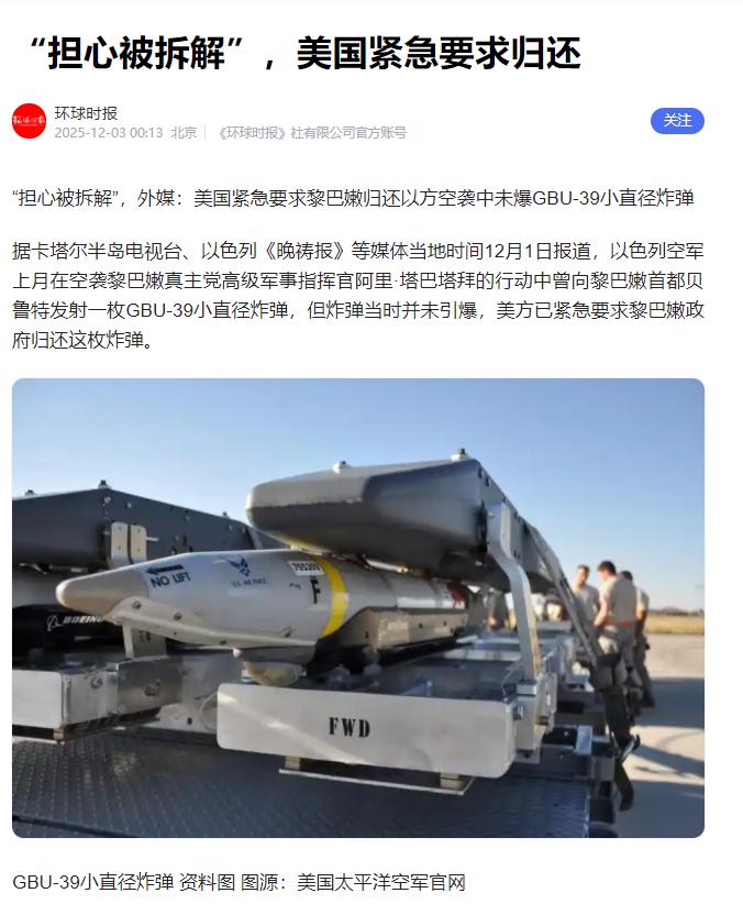 美国慌了!快还给我! 据卡塔尔半岛电视台、以色列《晚祷报》等媒体12月1日报道,上个月以色列空袭黎巴嫩真主党高官的时候,往贝鲁特投射了一枚GBU-39小直径炸弹,可这枚炸弹没炸响,就留在了现场。如今美国已经急不可耐地要求黎巴嫩政府把这枚炸弹还回去。明眼人都能看穿,美国这急吼吼的样子,压根不是担心这枚没炸的炸弹会误伤平民,核心诉求就俩字:怕拆! 怕这枚珍贵的炸弹被人拆解研究,进而窃取其中的核心技术,尤其是怕它最终落到伊朗手中,一旦如此,美国在中东的军事技术优势就会打折扣,这才是它真正的心病。 可能有人会问,一枚炸弹而已,至于这么紧张吗?还真至于!这GBU-39可不是普通炸弹,是美国花大价钱造的精准打击利器。 它个头不大,才130公斤重,直径不到20厘米,但威力不小,能穿透近2米厚的钢筋混凝土,从高空扔下去能滑翔100多公里,打目标准得很,误差不超过5米,简直是指哪打哪。 最关键的是它的导航技术,不怕干扰,能稳稳锁定目标,这可是美国精准打击的核心机密,绝不能让人偷走。 美国为啥这么怕技术被人学去?看看伊朗就知道了,伊朗可是出了名的“拆弹高手”,专能从美国武器里偷师。 早年间伊朗买过美国的战机,后来美国断了零件供应,本想让这些战机报废,结果伊朗人把废战机拆开,照着样子做零件,最后居然仿制出了自己的战斗机。 还在美制导弹的基础上,造出了自己的反舰导弹,威力大到美国军舰过霍尔木兹海峡都得小心翼翼。有这先例,美国能不担心GBU-39落到伊朗手里吗? 一旦被拆解,用不了多久伊朗就能造出类似的精准炸弹,美国的空袭优势就全没了。 美国最担心的就是,这枚炸弹在黎巴嫩会辗转落到伊朗手里。要知道,黎巴嫩真主党和伊朗关系铁得很,相当于伊朗在黎巴嫩的得力帮手,双方互相支持了四十多年。 就在今年8月,真主党领导人还专门见了伊朗高官,强调彼此的兄弟情谊。 现在炸弹在黎巴嫩境内,只要真主党想把炸弹交给伊朗,黎巴嫩政府根本拦不住,毕竟黎巴嫩内部派系乱,真主党武装势力强,政府根本管不了,这也是美国急得跳脚的关键原因。 更让人看不惯的是美国的双重标准。平时美军在伊拉克、阿富汗到处扔炸弹,留下那么多未爆弹危害平民,从来没说要回收。 可这次轮到自己的核心技术可能泄露,就立马施压让黎巴嫩还炸弹。而且以色列空袭黎巴嫩本身就是侵犯主权的行为,美国不追究以色列的责任,反而倒打一耙,霸权主义的嘴脸一下子就露出来了。 说到底,美国急着要回炸弹,核心就是怕技术泄露、动摇自己的军事霸权根基。 这枚未爆弹就像一面镜子,照出了美国对自身技术优势的焦虑,也照出了它在中东的霸道本性。 美国越着急,越说明它的技术不是不可撼动的,这种只想着自己利益、动辄施压的做法,只会让更多国家看清它的真面目,最后得不偿失。