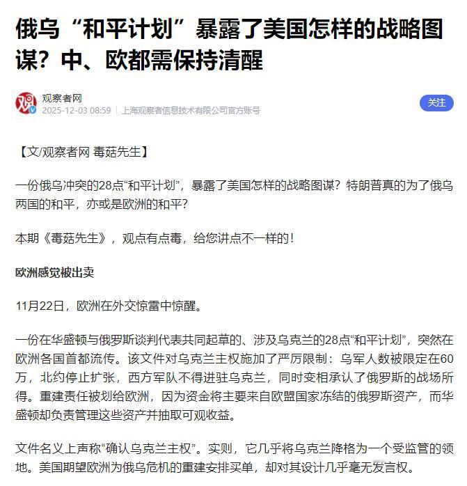 俄乌“和平计划”暴露了美国怎样的战略图谋?中、欧都需保持清醒 11月22日,一份由美俄谈判代表共同拟定的28条俄乌“和平计划”,悄然在欧洲各国首都流传开来,令欧洲各国倍感意外。 这份文件对乌克兰主权施加了严苛限制:乌军规模被限定在60万人以内,北约不得继续扩张,西方军队严禁进驻乌克兰,还变相认可了俄罗斯的战场所得。 更关键的是,乌克兰重建的费用要由欧洲承担,资金主要来自欧盟冻结的俄罗斯资产,而这些资产的管理权却归美国所有,美国还能从中谋取不少好处。 这份文件嘴上喊着“承认乌克兰主权”,实则把乌克兰变成了受管控的领地。美国的心思很直白,就是要让欧洲为俄乌冲突的重建买单,却压根不让欧洲参与计划的制定。 大家务必看清楚,这所谓的“和平计划”根本不是为了止战,全是美国设下的圈套,满是损人利己的算计。不管是欧洲还是中国,都得保持清醒,别被美国带偏了方向。 最过分的是,美国借着“和平”名义抢钱,把战争当成稳赚不赔的买卖。 计划里写得很清楚,要用欧盟冻结的俄罗斯资产搞重建,欧盟已冻结俄罗斯2100亿欧元国家资产和280亿欧元私人资产,这些钱全要拿来用。 更离谱的是,美国要主导管理这些钱,还光明正大地抽成,有消息说重建项目一半利润都归美国,直接把战争红利揣进自己腰包。 不仅如此,美国还逼欧洲再拿1000亿欧元重建费,自己一分不出,算盘打得全世界都听见。 之前美国搞的“乌克兰武器需求清单”也是一个路数,说白了就是让欧洲掏钱、美国卖军火。 乌克兰列个武器清单,欧洲各国凑钱向美国买,美国还额外收10%“管理费”,把欧洲当提款机。 现在这个和平计划就是换个马甲,继续靠俄乌冲突捞钱,用别人的苦难发财,实在不像话。 美国的心思不只是抢钱,还想靠这个计划把欧洲绑死在自己身边,让欧洲当小弟。这计划是美俄私下写的,欧洲全程被蒙在鼓里,直到文件传开才知情。 欧洲本就是俄乌冲突最大受害者,单是接收难民和增加军费就压得喘不过气。 有研究说若俄罗斯获胜,欧洲未来四年安置难民和增购军费要花上万亿欧元,是支持乌克兰获胜成本的两倍。可美国根本不管欧洲难处,逼欧洲买单还不让插手计划制定。 后来欧洲各国强烈反对,法德领导人都站出来表态,没有欧乌参与的和平计划不算数,但主动权已被美国攥住。 美国一边分别跟乌俄谈判,一边派特使周旋,就是不让欧洲参与核心决策。长此以往,欧洲的安全和经济会越来越依赖美国,想靠欧盟团结自保的想法最终会落空。 说到底,美国是想靠这个计划重新规划欧洲格局,巩固全球霸权。计划限定乌军规模、不让北约扩张,看似为了停火,实则是划定自己能控制的范围,让乌克兰变成受美国管控的“半附属国”。 更阴险的是,计划还想把剩余俄罗斯冻结资产拿去搞美俄联合投资,比如北极稀土开采,既拉拢俄罗斯又牵制欧洲,一举两得。 美国这些年一直靠隔岸挑事、坐收渔利的路子搅乱世界,以前在中东、东欧都这么干:先挑冲突,再以“调停者”身份掌控局面,最后捞好处。 这次俄乌危机也一样,从冲突爆发到推和平计划,每一步都在占欧洲便宜,就是想让欧洲永远依赖自己,同时压制俄罗斯、牵制中国。 所以欧洲和中国都得保持清醒。对欧洲而言,再跟着美国走只会被持续抽血,最终失去自主能力。 欧盟虽想过用俄罗斯冻结资产搞“赔偿贷款”减轻负担,但只要美国掌握话语权,还是躲不过被收割的命运。 对中国来说,更要认清美国“借和平之名、行霸权之实”的真面目。我们一直主张谈判解决乌克兰危机,也始终在和各方沟通促谈。 但美国这个计划根本不是为了真和平,而是维护自身霸权,只会让危机更难解决。 我们必须坚持立场,不被美国带偏,警惕其把中国拖入博弈的企图,继续推动建立公平合理的欧洲安全体系,让危机朝着合理方向解决,守住真正的和平。