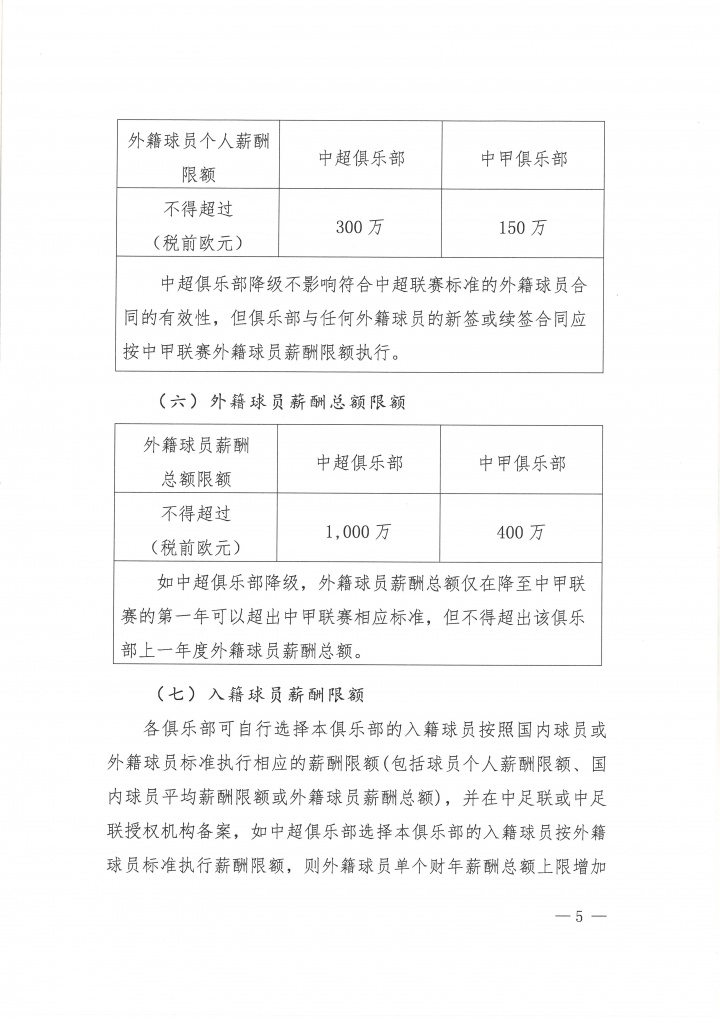 中超国内球员年薪封顶500万 中国足球职业联赛联合会关于印发中国足球职业联赛俱