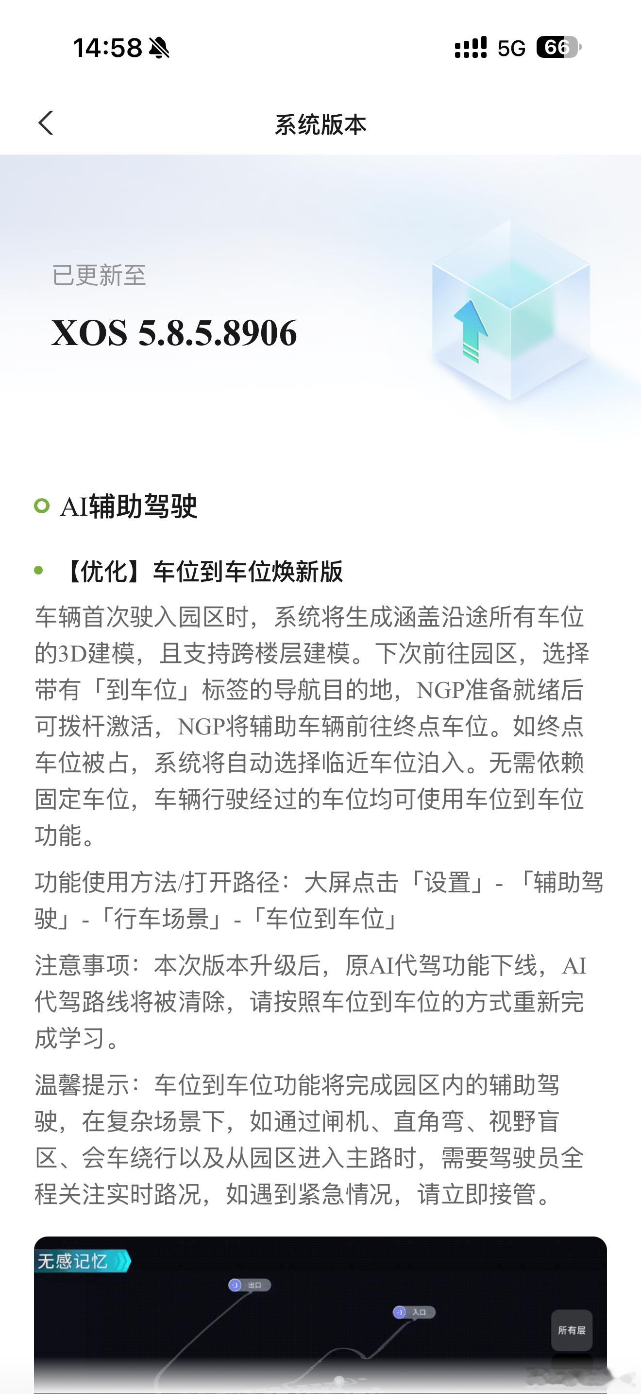 小鹏G7的ARHUD功能再上新这次新增倒车影像功能,倒车不低头泊车更安心而且Max版上也新增了ARHUD自适应调节、路怒消消气等4项功能,实用又好玩而在AI辅助驾驶上,小鹏G7 MAX版本新增车位到车位焕新版,首次入园无需学习即可实现无断点完成车位到车位;当然全系智能出库功能也迎来再度升级,可以提前发起减少等待时间我们的车也火速更新到了XOS 5.8.5体验之后确实好用又靠谱,鹏友们可以升级起来啦~