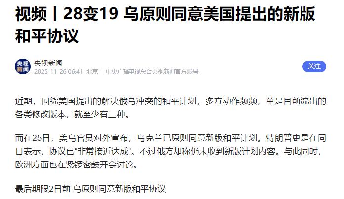 散了散了,乌克兰选择了!乌克兰宣布同意签署和平计划了!但搞笑的是俄罗斯让它不许跪! 乌克兰哪儿是突然想通了,分明是真的撑不下去了。这场仗打了这么久,最遭罪的还是普通老百姓,前线士兵连炮弹都快供不上了。 美国那些援乌资金里七成以上都留在了美国本土,要么进了军工企业的口袋。现在特朗普政府干脆暂停了新的武器援助,明确说要等乌克兰拿出“和平诚意”。 欧洲那边更是口惠而实不至,泽连斯基心里跟明镜似的,再硬撑下去,别说“战斗到最后一人”,恐怕连谈判的资本都耗光了。 这事儿背后,特朗普的小算盘打得噼啪响,他之所以这么积极撮合,说白了就是想借着促成和平捞政治资本,为自己的政治前途加分。 最早搞了个28点和平计划,被骂成“偏袒俄罗斯”,后来11月23号美乌欧在日内瓦坐下来改,改成19点的新版本,特意加了国际安全保障条款,泽连斯基这才敢点头。 可美国的心思也没那么纯粹,他们原本打算把冻结的1000亿美元俄罗斯资产拿去投资,自己还要抽走一半利润,这哪是促和平,分明是想趁机赚钱。 可美国这边刚搭好台,欧洲就急着抢戏,英法德牵头搞了个修改版,非要把乌克兰和平时期的兵力上限从美国提议的60万提到80万,还说冻结的俄罗斯资产得先用来赔偿乌克兰。 11月25号英法又拉着30多个国家开视频会,说要给乌克兰“坚如磐石”的安全保障,甚至提了派维和部队的事。这哪是帮乌克兰,分明是怕美国把欧洲甩在身后,自己捞不到好处。 德国外长嘴上夸美国做得好,转头就和法国商量怎么“修正”计划;英国首相也说“进展不错”,话里话外都在强调要把乌克兰绑在欧洲战车上。 俄罗斯那边早把这些看明白了。12月2号普京跟特朗普的特使威特科夫,还有特朗普的女婿库什纳谈了快五个小时,这么长时间的会谈,怎么可能没收到计划内容? 普京后来直接挑明,欧洲改的那些条款俄罗斯压根不能接受,欧洲就是想搅黄和平,再把责任推给俄罗斯。 这话里的意思很清楚:乌克兰要是带着欧洲的条件来谈,靠外人撑腰摆架子,这事儿就别聊了。 想想2022年3月俄乌在土耳其谈判,当时乌克兰一会儿一个主意,最后谈崩了。 现在俄罗斯可不会再掉坑里,他们要的不是一个跪着求饶的对手,而是能正视战场现实、平等对话的伙伴。 其实现在的路很清楚,乌克兰要是真想谈,就得抛开美欧的干扰,自己拿主意,跟俄罗斯坐下来平等对话;俄罗斯也该拿出点诚意,别总用“没收到计划”这种话试探。 美欧那些国家更该醒醒,别再把乌克兰当博弈的筹码,真为和平着想,就该少搞点小动作,多推一把双方的谈判。 说到底,和平从来不是求来的,更不是靠别人施舍的。乌克兰选和平是对的,这是为了自己的老百姓;俄罗斯也不是刁难,是想要一个能真正解决问题的协议。 希望这场打了这么久的仗,能早点画上句号。