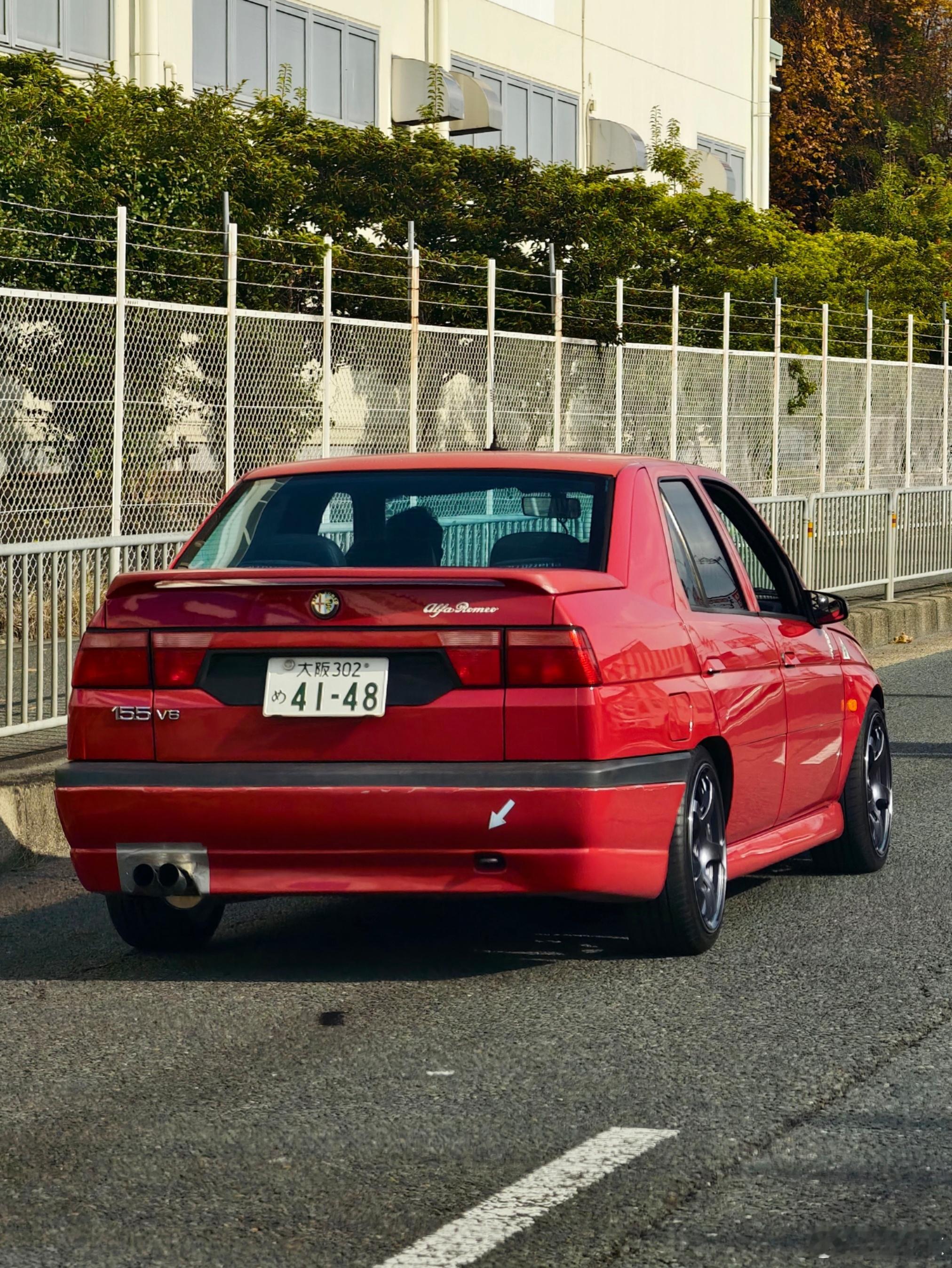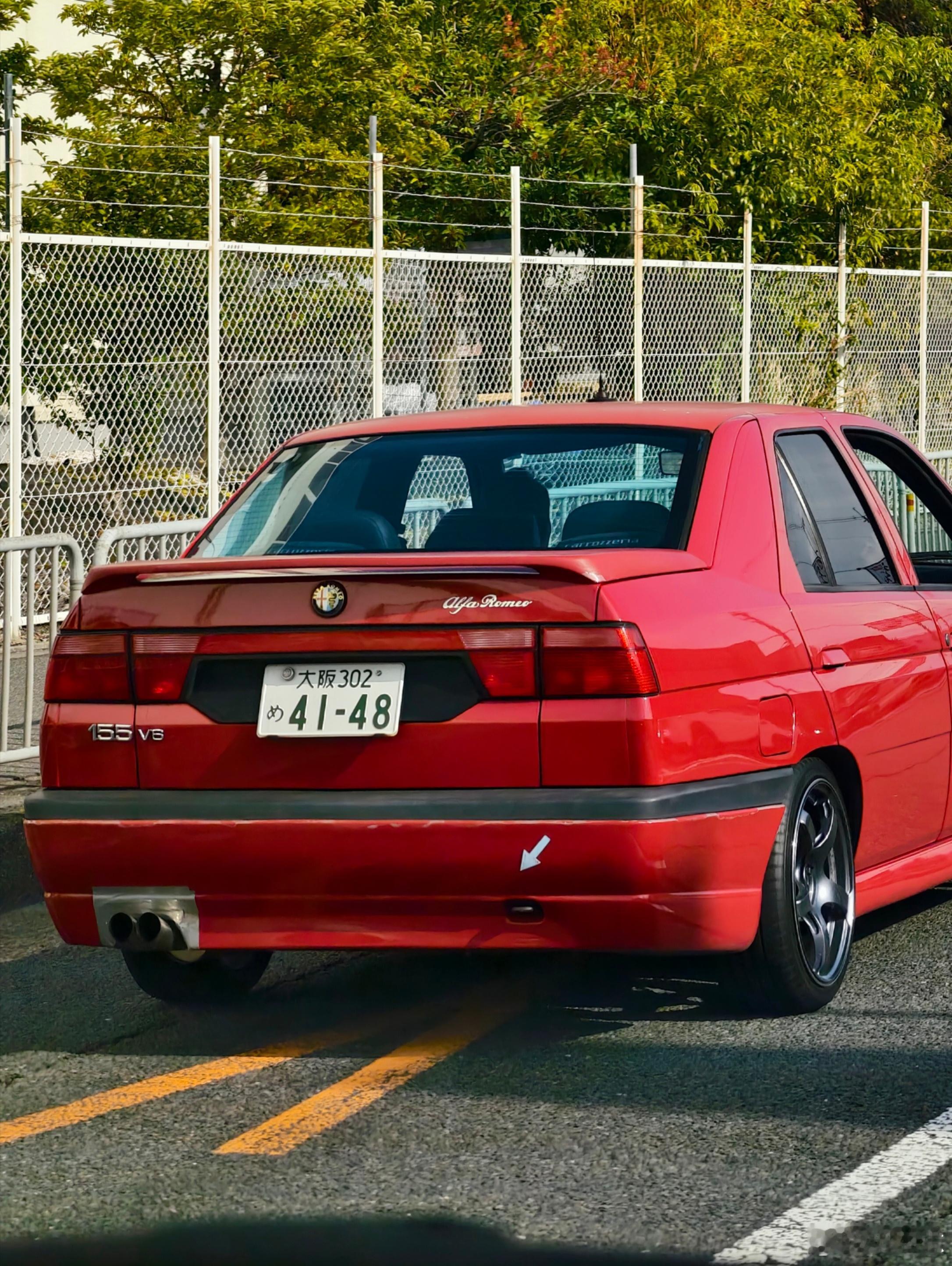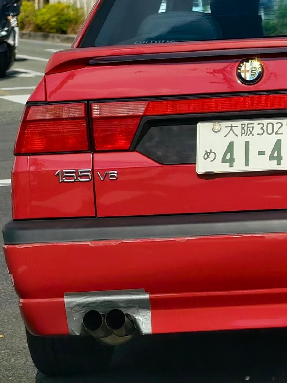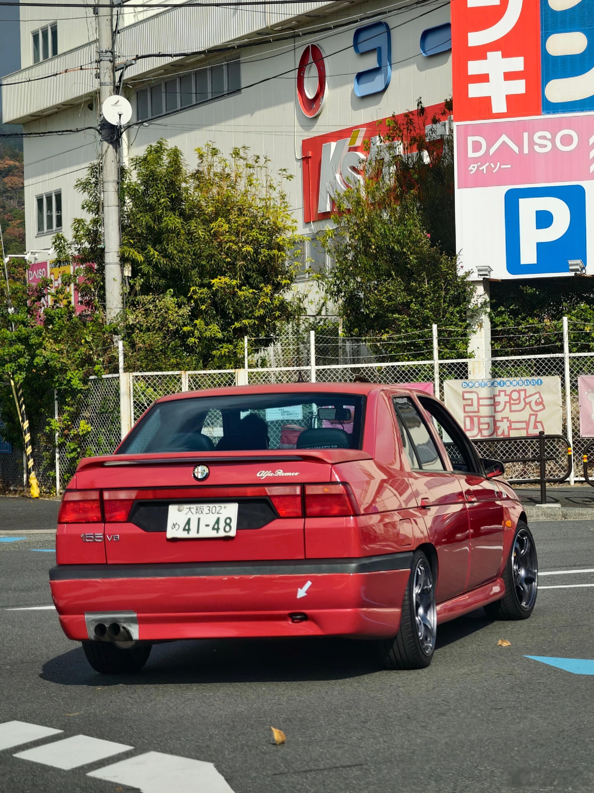 型车街拍偶遇 Alfa 赛道瓷,而且是稀有的 155 V6。排气尾段附近保险杠贴着隔热胶带,说明车主经常跑 track day 或长时间激烈驾驶。老车原厂保险杠耐热性有限,年头久了更容易热疲劳、变形,贴隔热胶是经典车玩家常见的防护方式。155 这代迷人之处来自征战 DTM 房车大师赛的 155 V6 TI 赛车:外壳相同,但底盘、驱动形式、发动机都和量产车毫无关系。赛车版是全铝空间框架、主动四驱、11,000 rpm 的 2.5 V6。街车版完全不同,采用前驱布局,基于 Tipo 平台。2.5L Busso V6 结构为 60° 夹角、全铝缸体、DOHC、每缸 2 气门,典型特征是高转顺滑、声浪金属感强。虽然是前驱,155 的方向机速比偏快,短前悬搭配紧凑转向机构,在同年代前驱车里有相对积极的前轴指向性。155 量产版的底盘几何与 DTM 赛车也没有继承关系,但由于它被选作 homologation 模板,车身有明显的方盒子线条,方便赛车版扩展宽体、底板和空气动力学套件。 日本·大阪
