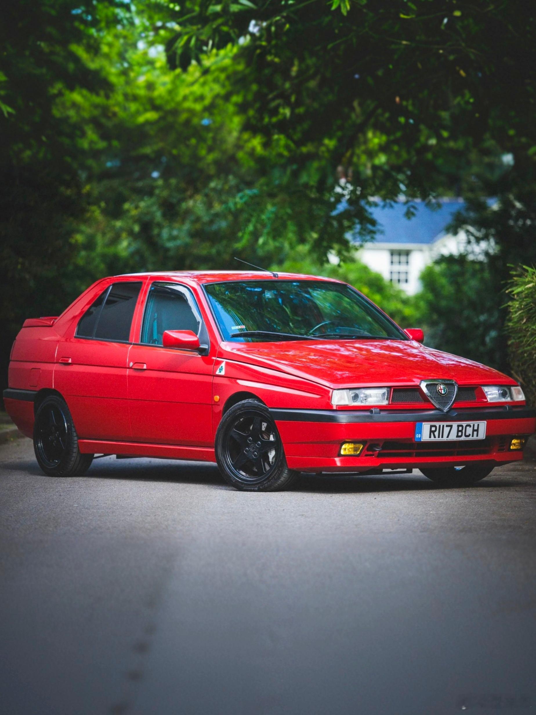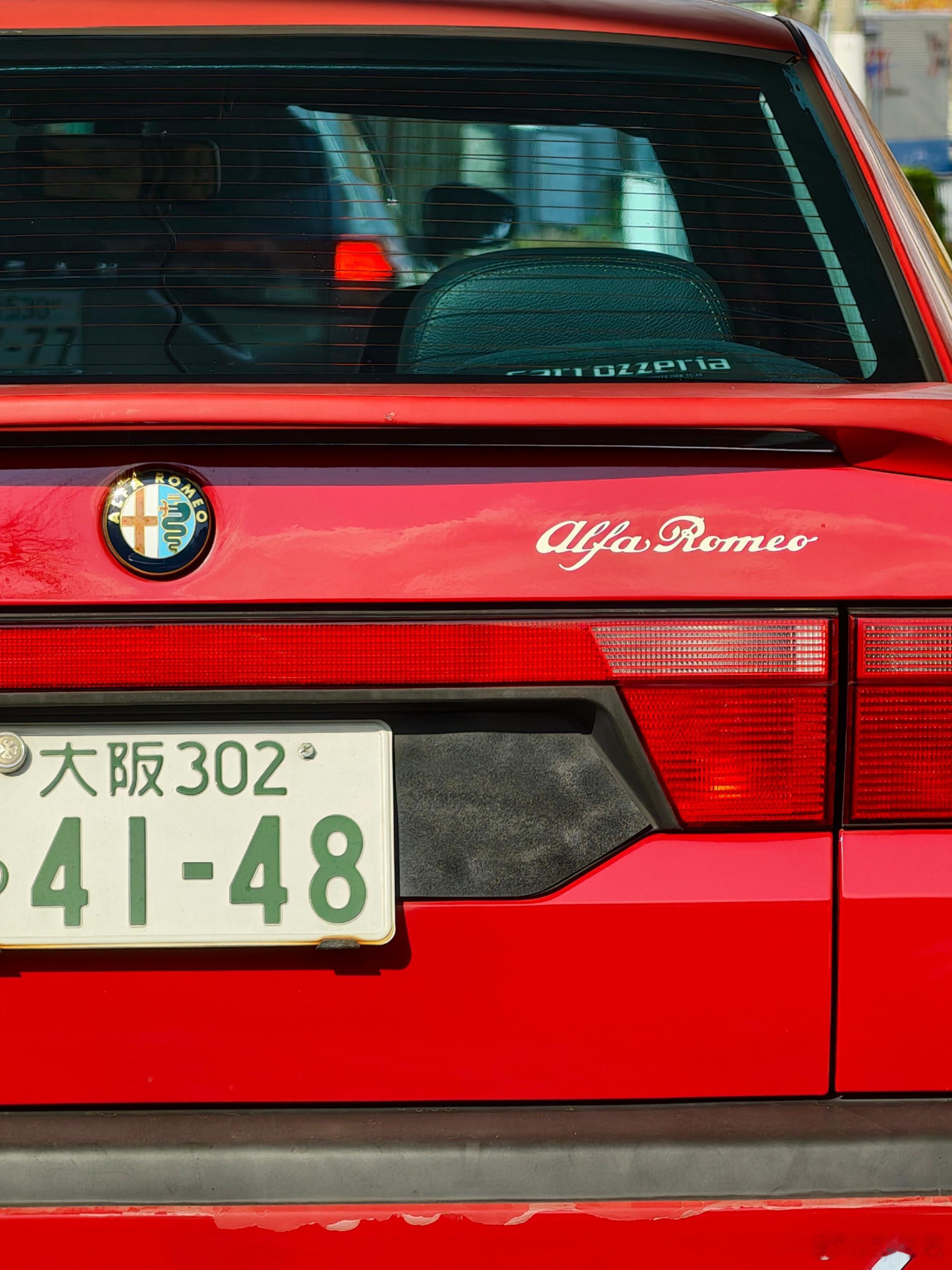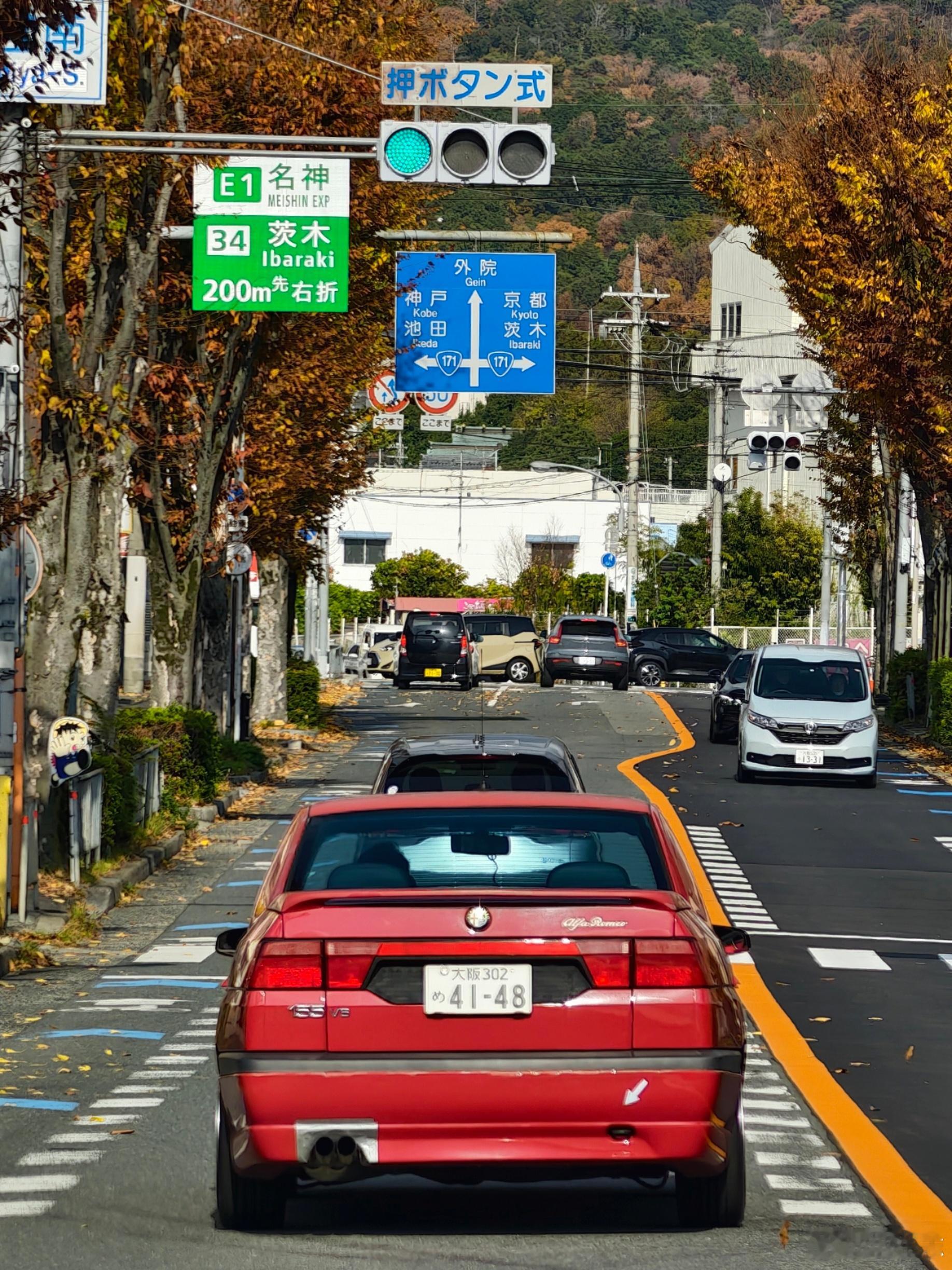 型车街拍偶遇 Alfa 赛道瓷,而且是稀有的 155 V6。排气尾段附近保险杠贴着隔热胶带,说明车主经常跑 track day 或长时间激烈驾驶。老车原厂保险杠耐热性有限,年头久了更容易热疲劳、变形,贴隔热胶是经典车玩家常见的防护方式。155 这代迷人之处来自征战 DTM 房车大师赛的 155 V6 TI 赛车:外壳相同,但底盘、驱动形式、发动机都和量产车毫无关系。赛车版是全铝空间框架、主动四驱、11,000 rpm 的 2.5 V6。街车版完全不同,采用前驱布局,基于 Tipo 平台。2.5L Busso V6 结构为 60° 夹角、全铝缸体、DOHC、每缸 2 气门,典型特征是高转顺滑、声浪金属感强。虽然是前驱,155 的方向机速比偏快,短前悬搭配紧凑转向机构,在同年代前驱车里有相对积极的前轴指向性。155 量产版的底盘几何与 DTM 赛车也没有继承关系,但由于它被选作 homologation 模板,车身有明显的方盒子线条,方便赛车版扩展宽体、底板和空气动力学套件。 日本·大阪