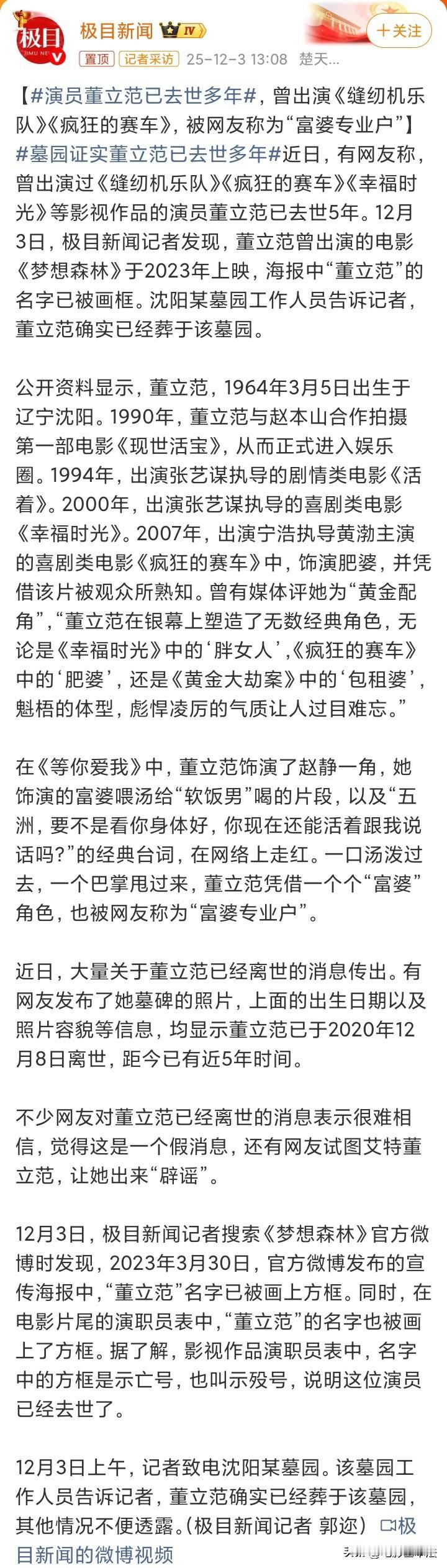 非常意外,这位富婆专业户演员,已经去世5年了! 12月3日,女演员董立范意外冲上热搜,原因是有记者发现,这位全网演富婆最深入人心的女演员,在2023年出演的电影《梦想森林》中,名字已经被画方框,经过查证后得知后,董立单已经去世5年了,2020年去世,安葬在沈阳某墓地。 网友得知后非常惊讶: 啊,去世五年了,我一直认为她还在。 20年正是疫情,还有就是她没有后代,自然没有媒体报道,当时的情况,有报道也被忽略掉了。 有的人很久没消息,或许已经没了也不知道,有的人活着就在你身边,但是在你心里她已经…… 都去世5年了啊。 这位是很优秀的演员,家喻户晓。 啊,这个演员大多数人认识,但不知道名字,居然已经去世5年了。 …… 虽然她没有后人,但是凭借角色和作品能让一代人记住,已经超过很多人了,一路走好!