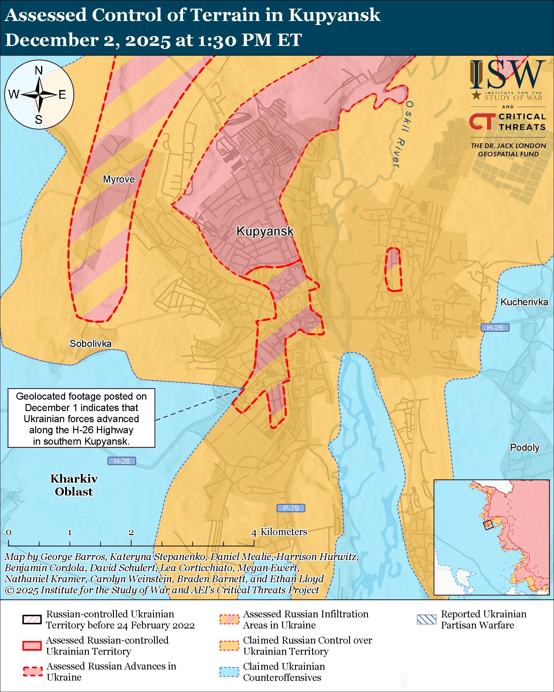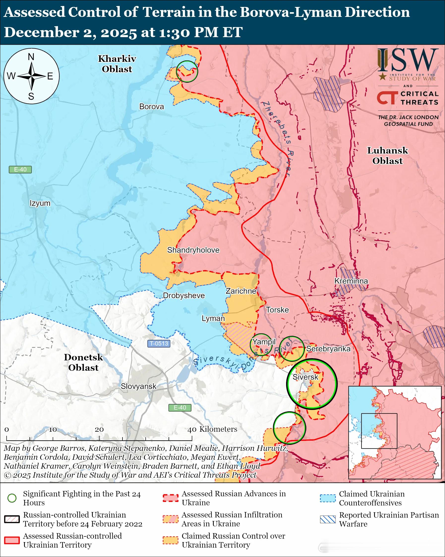 俄军主要行动2俄军目标:占领卢甘斯克州剩余部分,向西推进至哈尔科夫州东部,并包围顿涅茨克州北部。乌克兰军队最近在库皮扬斯克方向保持阵地并取得进展。俄罗斯声称占领的区域范围:12 月 1 日发布的地理定位视频显示,乌克兰军队在库皮扬斯克西南部的 H-26 库皮扬斯克-哈尔科夫市公路沿线保持阵地并推进——此前俄方声称俄军在该地区驻扎。12月1日和2日,俄军在库皮扬斯克东北部的诺沃瓦西利夫卡和辛基夫卡附近、库皮扬斯克东部的彼得罗巴甫利夫卡附近以及库皮扬斯克东南部的皮什恰内和赫卢什基夫卡附近发动了进攻。12月2日,在库皮扬斯克方向作战的乌克兰无人机团指挥官报告称,乌克兰军队已将俄军从库皮扬斯克北部郊区驱逐至奥斯基尔河,并肃清了库皮扬斯克西北部郊区。该指挥官表示,尽管俄军使用了滑翔炸弹、光纤无人机和导弹进行打击,但乌克兰军队仍保持着通往奥斯基尔河东岸(左岸)的地面交通线(GLOC),但他指出该地区的后勤保障较为复杂。作战序列:俄第68摩步师(列宁格勒军区第6合成集团军)的无人机操作员正在库皮扬斯克南部打击乌克兰阵地。第1近卫坦克集团军(莫斯科军区)正在库皮扬斯克南部作战。12月2日俄军继续向博罗瓦方向发起进攻,但并未取得进展。俄军攻击了新普拉托尼夫卡附近的博罗瓦以北并向博胡斯拉夫卡进发;赫雷基夫卡附近的博罗瓦东南部以及什基夫卡、德鲁热柳比夫卡、特维尔多赫利博韦和新霍里夫卡方向。12月2日俄军继续在斯拉维扬斯克-利曼方向发动进攻,但并未取得确切进展。未经证实的说法:俄军总参谋长格拉西莫夫12月1日声称,俄军进入了莱曼。ISW此前评估认为,俄军只对莱曼进行了有限的小规模渗透,并且继续评估认为,俄军没有在莱曼保持长期存在。俄军在莱曼附近发动进攻;莱曼西北部,靠近卡尔皮夫卡、塞雷德涅、奥列克桑德里夫卡、尚德里霍洛夫、诺沃塞利夫卡、亚罗瓦、德罗比舍韦、科罗维亚尔,并向索斯诺韦方向;莱曼 (Lyman) 以北,靠近新维哈利夫卡 (Nomykhailivka)、斯塔夫基 (Stavky) 和斯特波韦 (Stepove) 方向;莱曼以东,靠近扎里奇尼; 在莱曼东南部靠近 Yampil 和 Vasyukivka 的地方。12月2日在斯拉维扬斯克-利曼方向作战的乌军旅发言人报告称,俄军利用恶劣天气条件,在利曼方向发动了机械化进攻。该发言人表示,由于天气原因,乌克兰军队依靠步兵而非无人机击退了俄军的进攻。此前ISW曾注意到有报道称,俄军持续利用恶劣天气条件,以机械化步兵和徒步步兵推进。作战序列:据报道俄第164摩步旅(第25集团军,中央军区)正在斯拉维扬斯克发电厂附近袭击乌克兰的基础设施。第169摩步旅(第25集团军)的无人机操作员正在莱曼方向作战。12月1日至2日夜间,乌克兰军队继续对被占领的卢甘斯克州的俄罗斯军事目标进行中程打击。 12月2日发布的地理定位视频显示,乌克兰特种作战部队(SSO)无人机操作员袭击了位于被占领的杰涅日尼科韦(卢甘斯克市西北部,距前线约62公里)以南H-21斯塔罗比尔斯克-诺沃艾达尔公路沿线的俄罗斯第3摩步师(第20集团军,MMD)的燃料库。