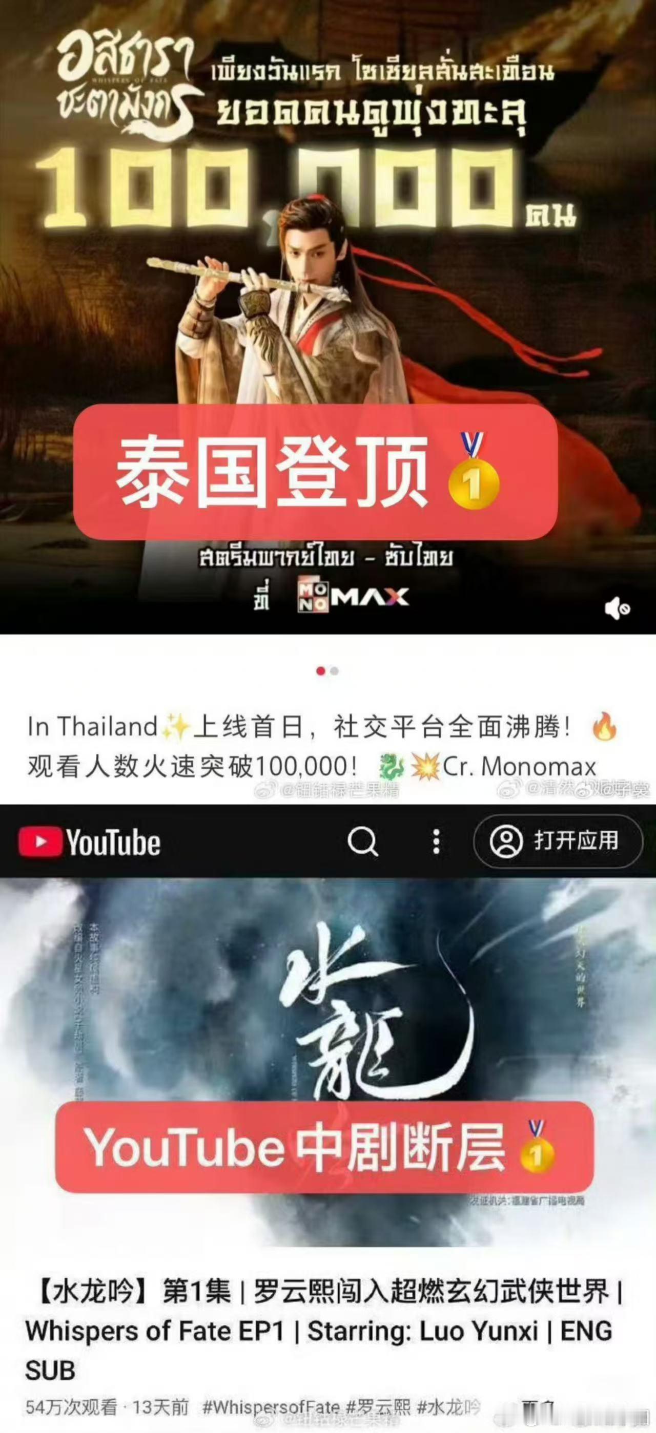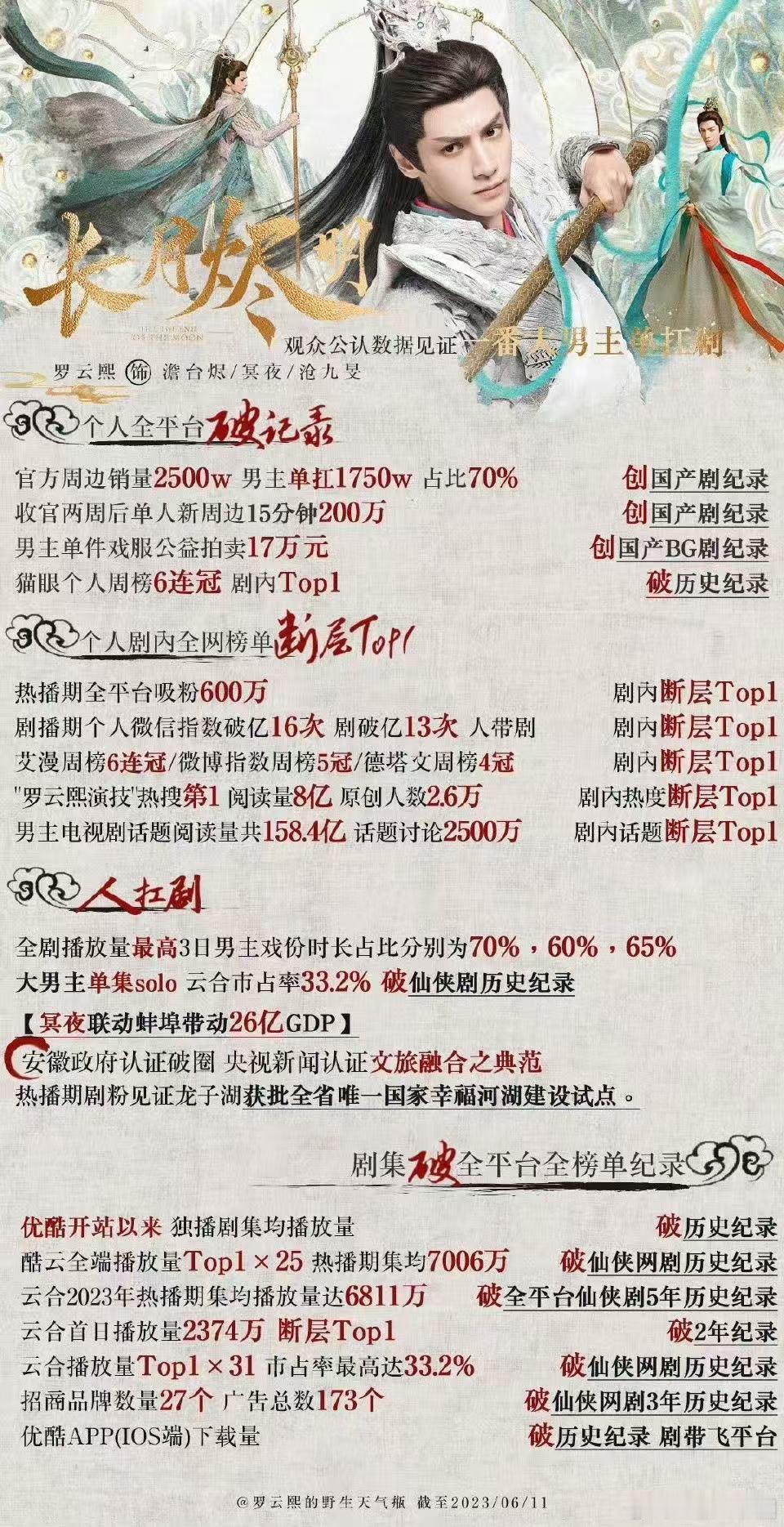 罗云熙四大平台作品集均 罗云熙真的是有效播剧,《长月烬明》开播29小时热度破万,创优酷站内记录,播放量和招商数更是占据TOP1的位置!最近刚收官的《水龙吟》更是做到文化出海,越南FPTplay剧集榜第一、台湾主流影视平台LINE TV 第一,多项海外榜单持续霸榜,真正的好剧从数据到口碑全面开花!谁还没有被唐俪辞天下第一的气度给迷到~
