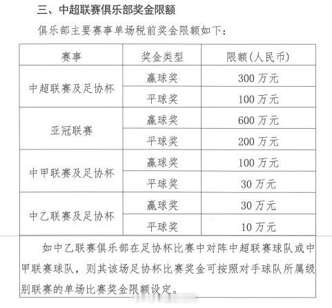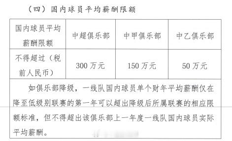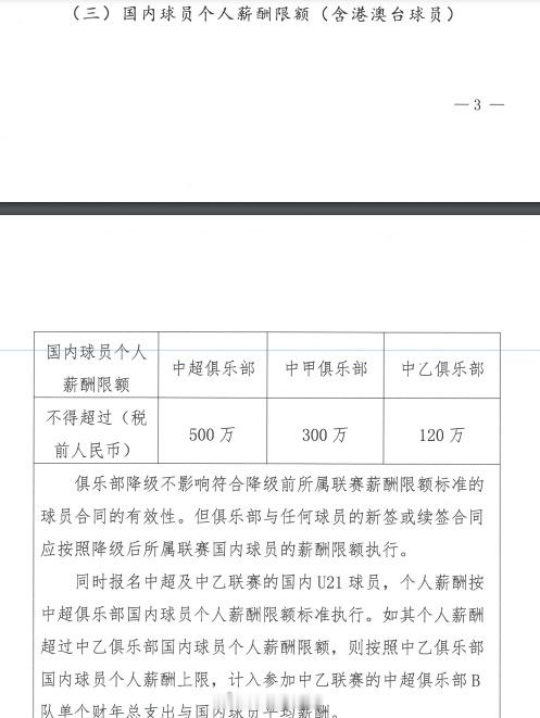 【中超国内球员税前年薪限额500万】中国足球职业联赛联合会发布关于印发中国足球职业联赛俱乐部财务约定指标的通知。通知规定:国内球员年薪限额分别为500万(中超)、300万(中甲)和120万(中乙);国内球员平均薪酬分别为300万(中超)、150万(中甲)和50万(中乙)。此外,中足联印发三级联赛财务指标,其中包含俱乐部奖金限额。中超球队联赛单场赢球奖金不得超过300万元。(中国新闻网)