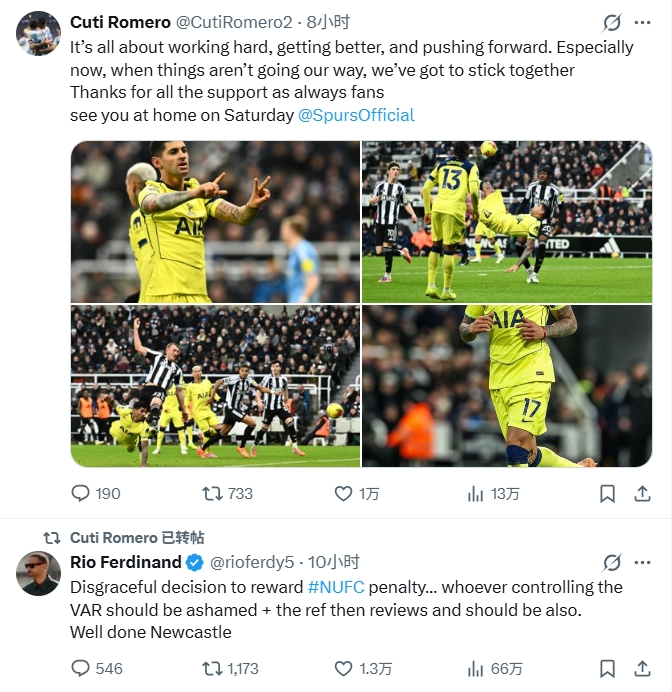 直播吧12月03日讯本轮英超,热刺凭借中卫罗梅罗的双响客场2-2绝平纽卡,赛后罗梅罗在社媒转发费迪南德的评论,抗议纽卡获得的争议点球。