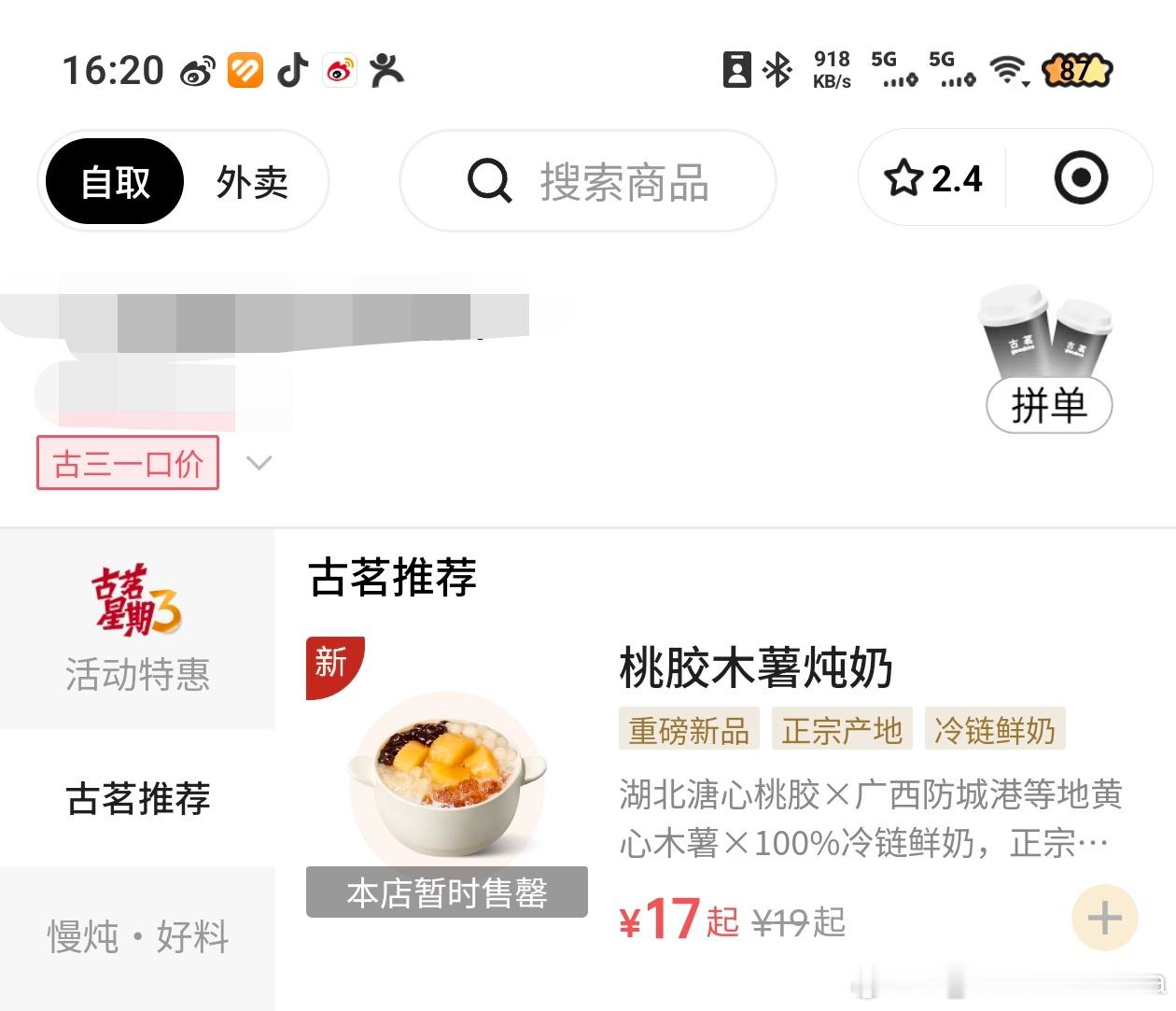 补说了自从卓沅何浩楠联名了古茗当天出周边当天就没有这款桃胶木薯炖奶了天天都只有芋泥炖奶(讨厌芋泥!!!)直到今天我终于等到它上架,喝到了结果我买完又售罄了古茗的木薯和小丸子都太甜了 齁晕我了如果只有桃胶和奶底 甜度比较刚好 好喝
