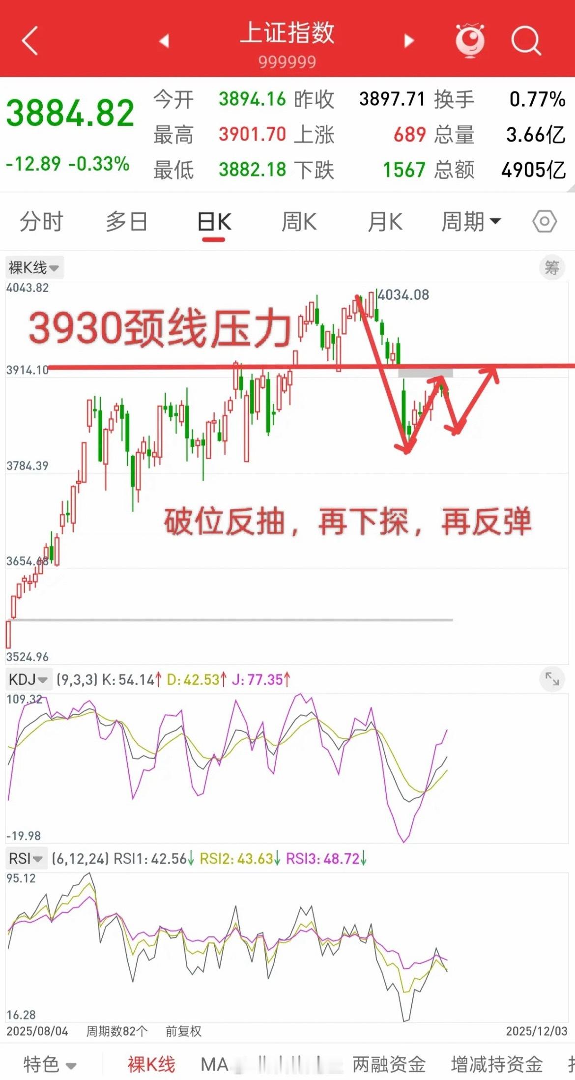 A股放量探底!今明两天低吸,仓位控好稳赢先说观点,行情下跌,我并不认为是风险,反而是分批低吸的好时机,当然前提是你的仓位得控制好,破位后的反抽,反抽不过颈线压力,二次探底,很正常。回顾历史走势,很多时候M头双顶,破颈线之后,后面会加速下跌,然后反抽不过颈线,再下跌,再反抽,就是这种来来回回拉扯。因此,我认为,如果行情继续探底,不一定会比左底3816底,甚至会高于这个点,但是,距离目前位置,也有一定空间,所以,仓位只要不重仓,都还好。