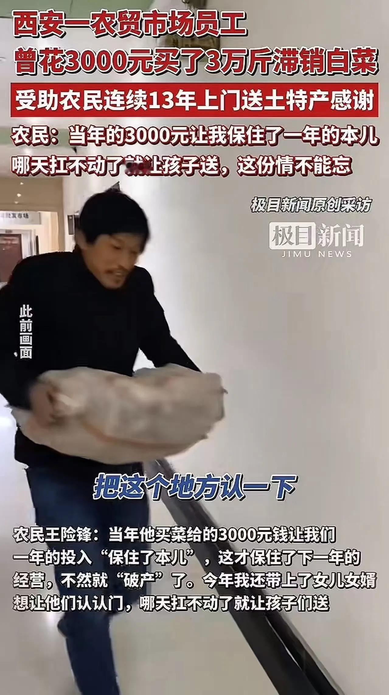 “这就叫知恩图报!”一个农民连续 13 年给农贸市场的工作人员送土特产,不是被逼迫,也不是走关系,而是感谢恩情!原来,这位市场员工曾花 3000 元下农民 3 万斤的滞销白菜,让农民保住了一年的本!农民说:“我要坚持送,哪天扛不动了,就让孩子送,这份情不能忘!” 这就叫知恩图报!一个普通农民,用行动诠释了最朴实的感恩之情,也让我们看到人性中那份温暖与坚韧的力量。在这个快节奏、功利至上的时代,很少有人愿意用十几年如一日的坚持去表达一份心意。而他,却用实际行动告诉我们:感恩不是一句空话,而是一种责任,是内心深处那份对恩情的铭记。 这位农民的故事,仿佛一股清流,洗涤着我们浮躁的心。你是否还记得曾经有人在你最困难的时候伸出援手?你是否也曾暗自发誓,要用自己的方式去回馈那些曾经帮助过你的人?这份情义,远比那些浮夸的承诺更为珍贵。它不需要豪言壮语,只需一份坚持,一份真心。 或许有人会说:“送土特产算什么?不过是一些小东西罢了。”但正是这份“小”,折射出农民对恩情的尊重和感激,也展现了那份深藏心底的善良。每年的坚持,每一次的送礼,都是他用心的表达,是对那段温暖记忆的珍惜。 这故事也让我们反思:在这个社会,感恩的力量究竟有多么强大?它能穿透冷漠,温暖人心;它能激发善良,凝聚人心。或许我们都应像这位农民一样,把感恩变成一种习惯,把善意传递下去。因为,只有这样,我们的社会才会变得更加温暖和谐。 读到这里,你或许会心生共鸣——在我们身边,也许就藏着许许多多像他一样的“平凡英雄”。他们用行动续写着感恩的篇章,无声地告诉我们:善良不是一时的冲动,而是日积月累的坚持。让我们学会感恩,用心去发现、去传递那份温暖。毕竟,正能量的力量,正是从这些细碎而真实的善举中发芽、生长。 这故事,激励我们每一个人:在忙碌的生活中,也别忘了那份最纯粹的善意。它或许不起眼,却能点亮一片温暖的天空。让我们以这位农民为榜样,把感恩变成行动,把善意传递到每一个角落。因为,只有这样,我们的社会才能真正变得更美好、更有爱。 在这个世界上,最动人的,永远不是轰轰烈烈的表白,而是日复一日的坚守与付出。这份坚持,值得我们每个人去敬仰,也值得我们每个人去思考——你的感恩,你的善良,又在用怎样的方式温暖着这个世界?十件感恩的事情 恩知图报 君子知感恩 父母恩情图报 真心回馈 中国感恩故事 农民责任心