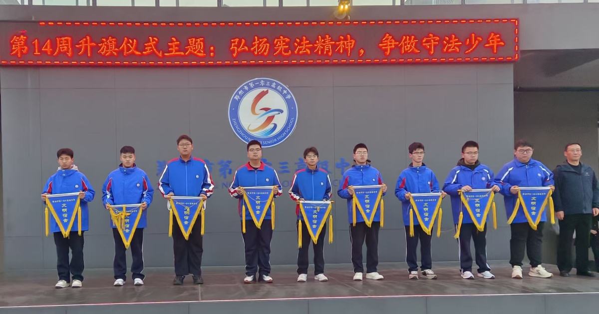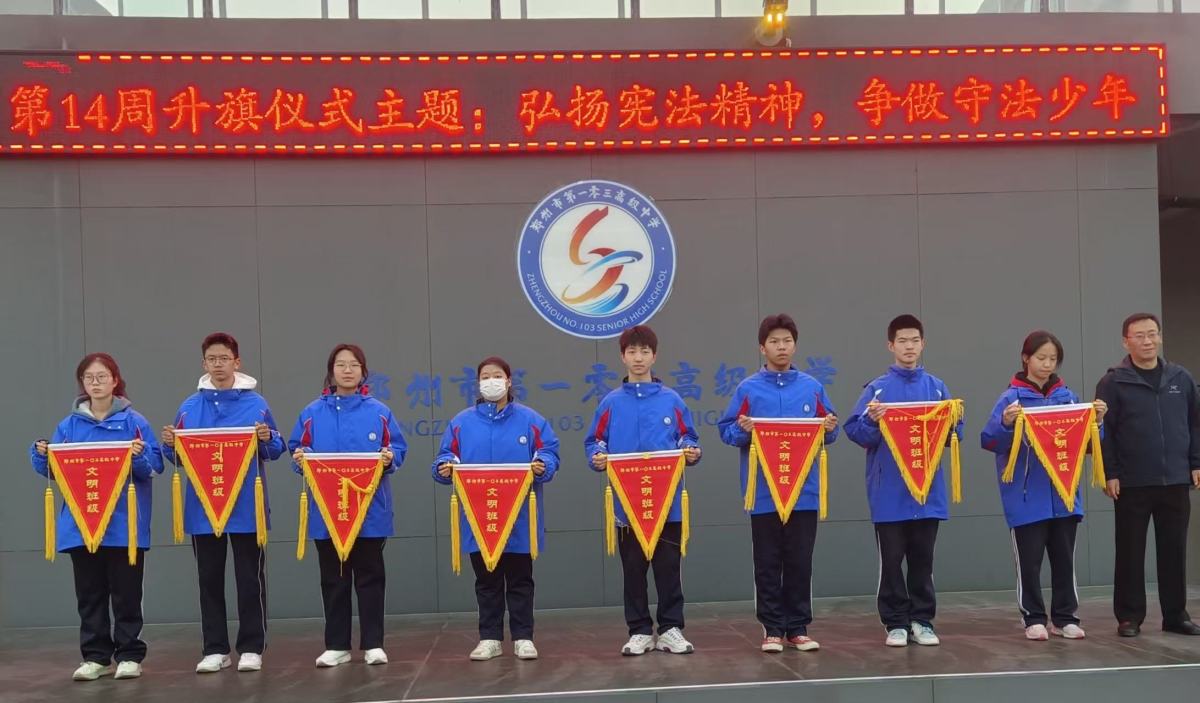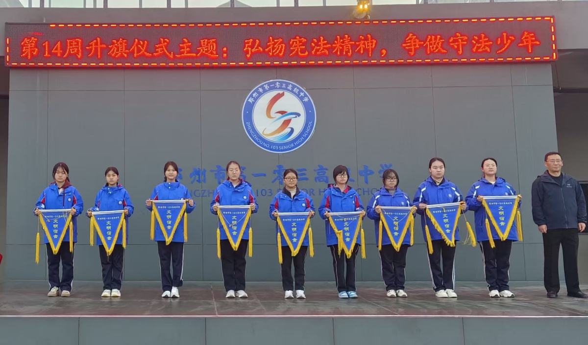 在12月4日国家宪法日即将到来之际,为深入贯彻落实宪法宣传教育要求,引导学生厚植法治信仰,郑州市第一〇三高级中学于12月1日举行2025-2026学年上学期第十四周升旗仪式。本次仪式以”弘扬宪法精神,争做守法少年”为核心主题,将爱国主义教育与宪法宣传紧密结合,为即将到来的国家宪法日营造了浓厚氛围,全体师生共同参与这场兼具仪式感与教育意义的精神洗礼。