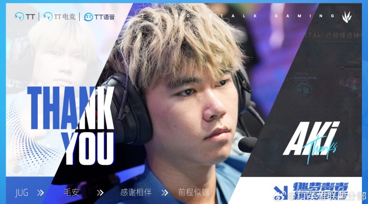 经双方友好沟通与协商,原TT英雄联盟分部打野选手毛安(ID:Aki)断开连接,即日起正式离队。