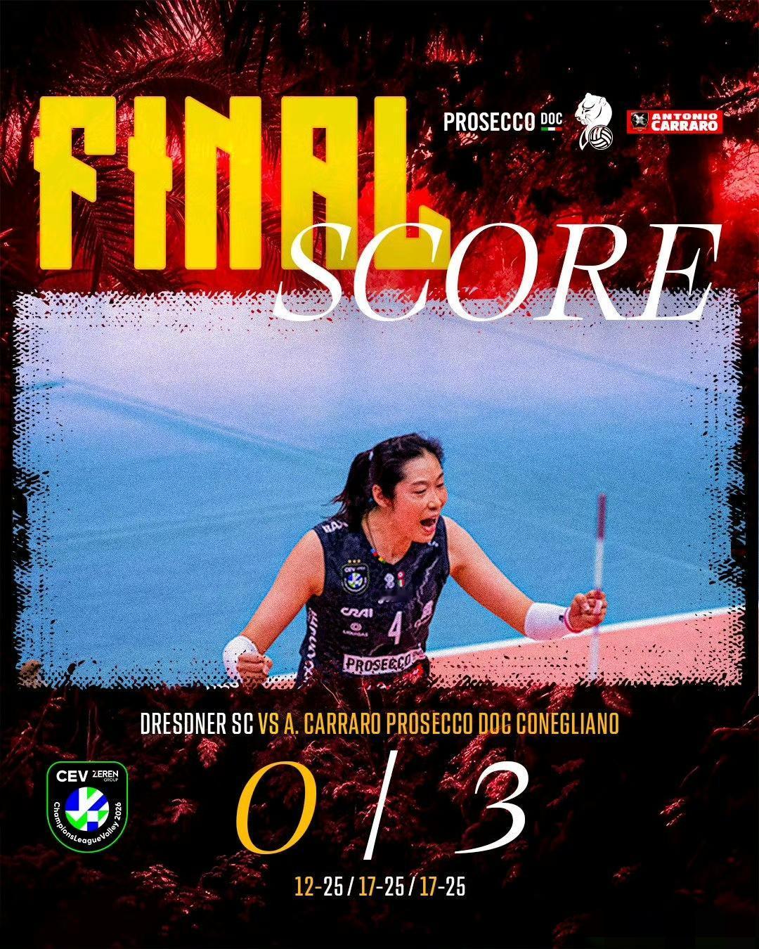 欧冠小组赛第二轮,结束全运会的朱婷恢复良好,首发并打满三局,助科内利亚诺客场3:0德累斯顿(25:12/25:17:25:17),朱婷全场20扣12中4拦16分,获得单场MVP[心] 朱婷16分,21扣12中,1失误0被拦,4拦 哈克13分,25扣11中,3失误2被拦,1拦1发 加比11分,13扣10中,0失误被拦,1拦 卢比安5分,5扣3中,0失误被拦,2拦 穆纳里尼3分,5扣3中,0失误被拦 沃洛什2分,1扣1中,1发 接下来,朱婷将和球队再转战世俱杯,赛事密集,希望朱婷越来越好!