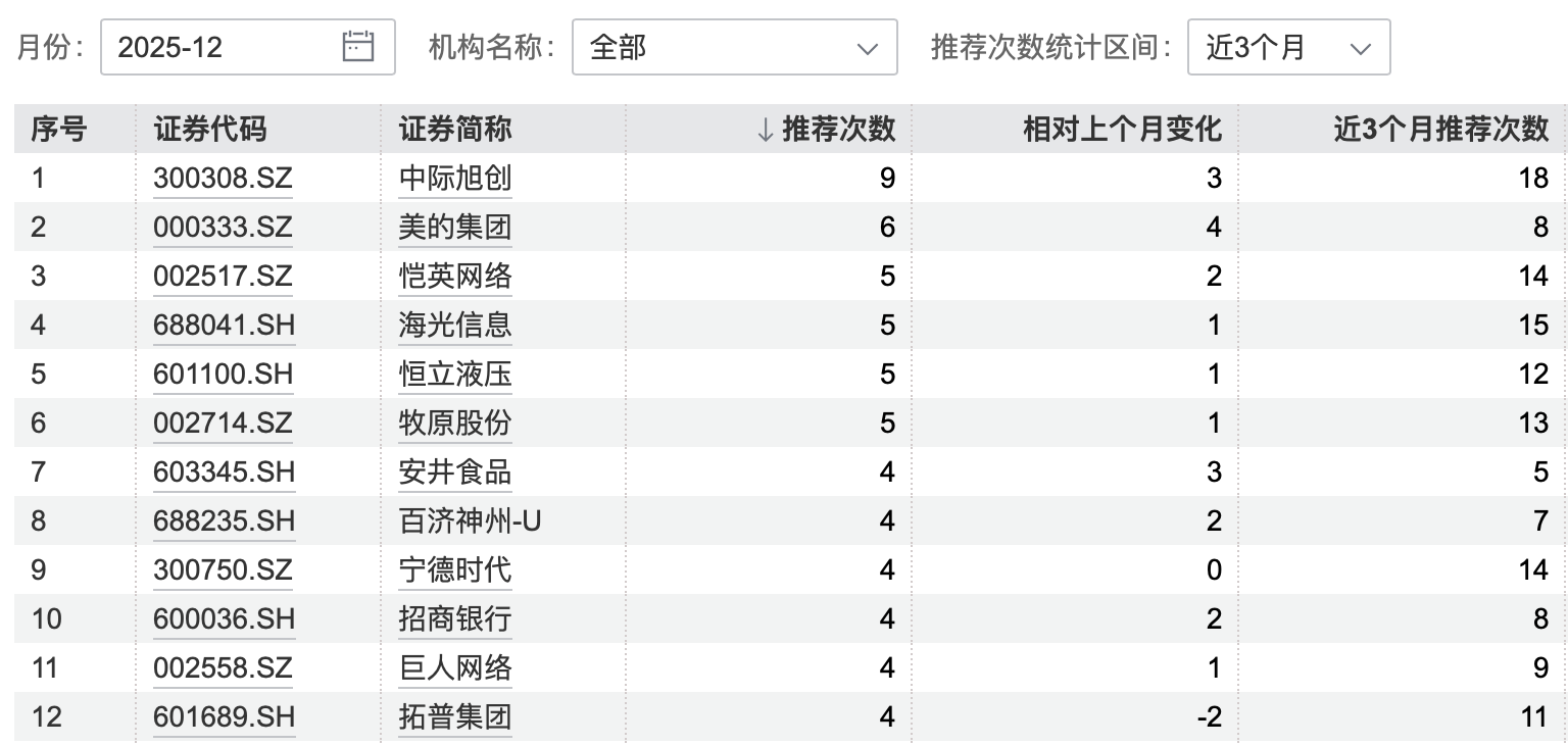Wind数据显示,截至12月3日中午,已有36家券商发布了12月金股推荐,共计推荐226只股票。在12月金股推荐榜中,中际旭创被推荐次数最多,被9家券商同时推荐,其近三个月被推荐次数达到18次,自9月1日以来区间涨幅达到48.46%。紧随其后被推荐的是美的集团,其股价在12月3日再创年内新高。