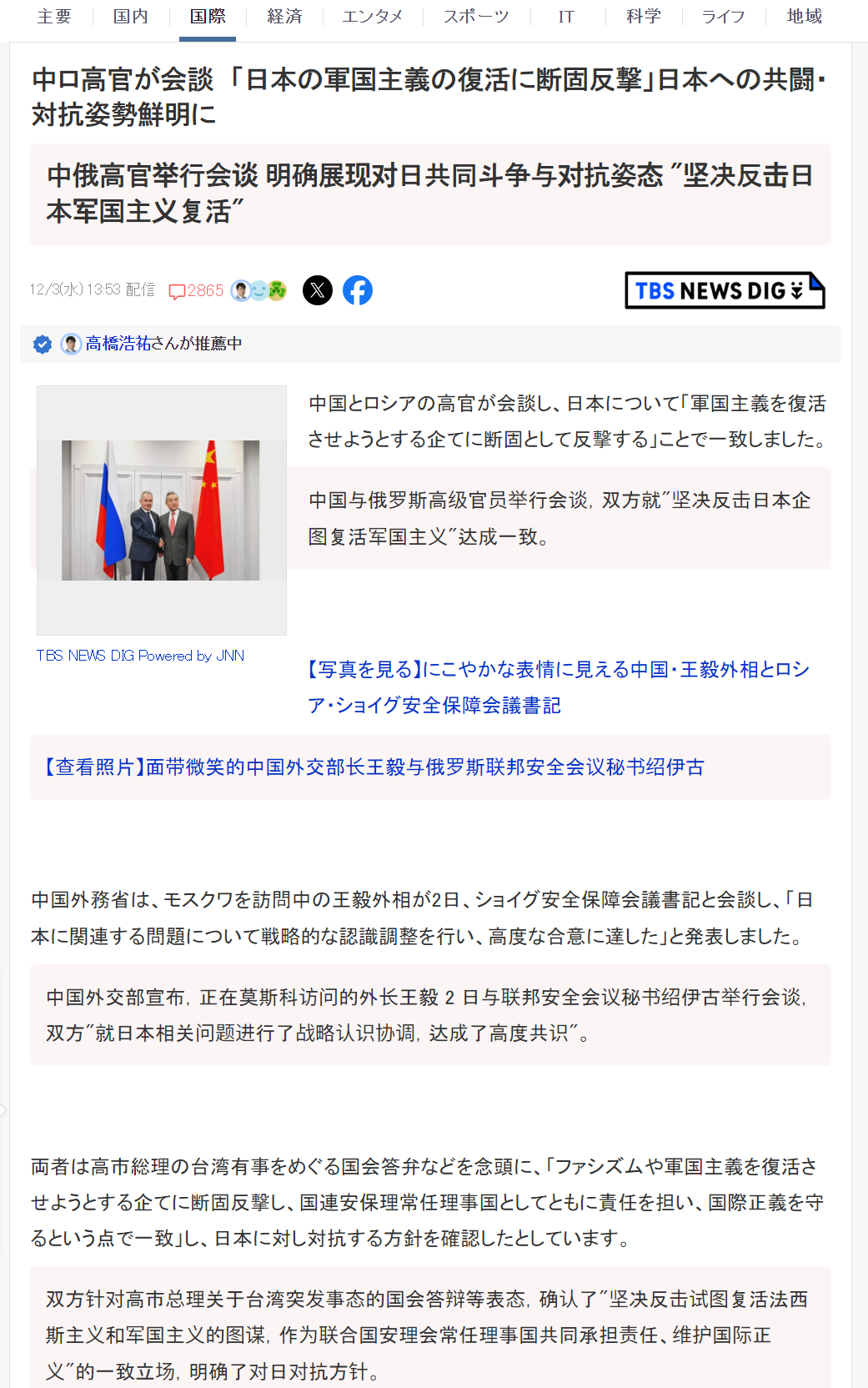 🔻日本媒体也很快报道了“中俄就涉日本问题进行战略对表”的消息。🔻via TBS NEWS中俄就涉日本问题进行战略对表高市早苗老家奈良凉了热点现场海外新鲜事