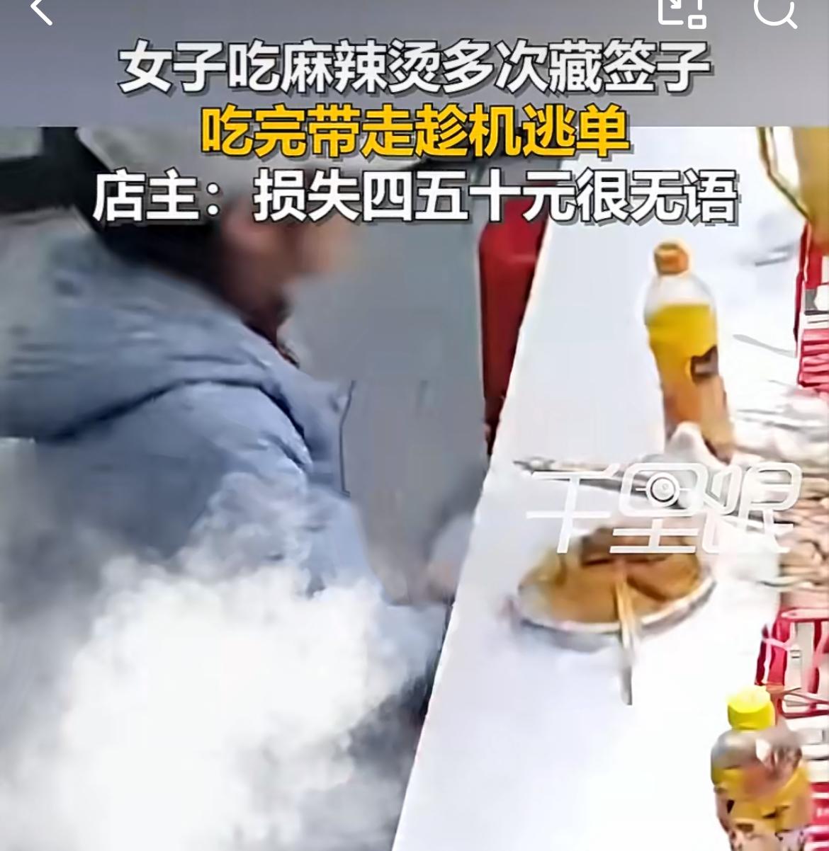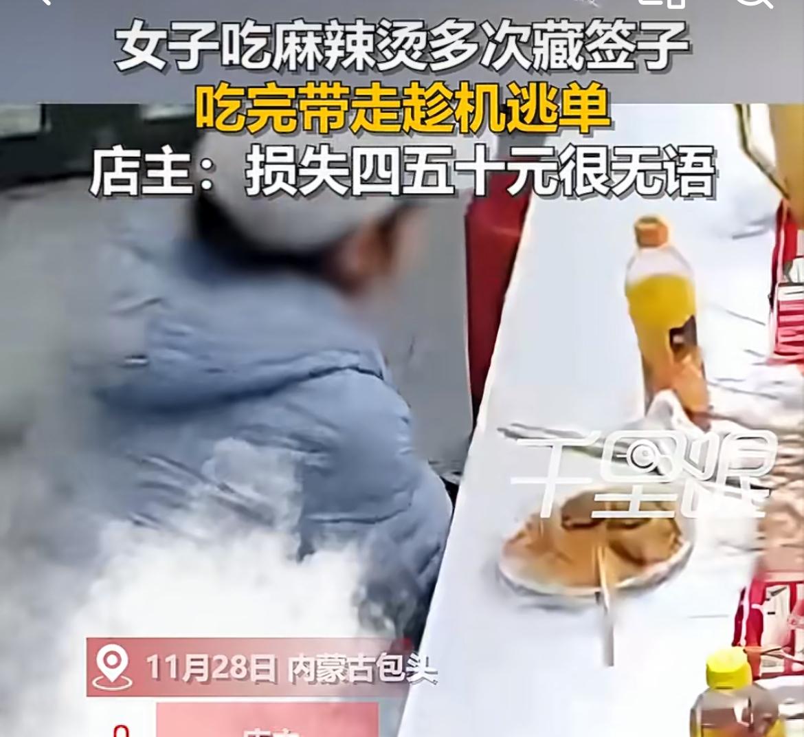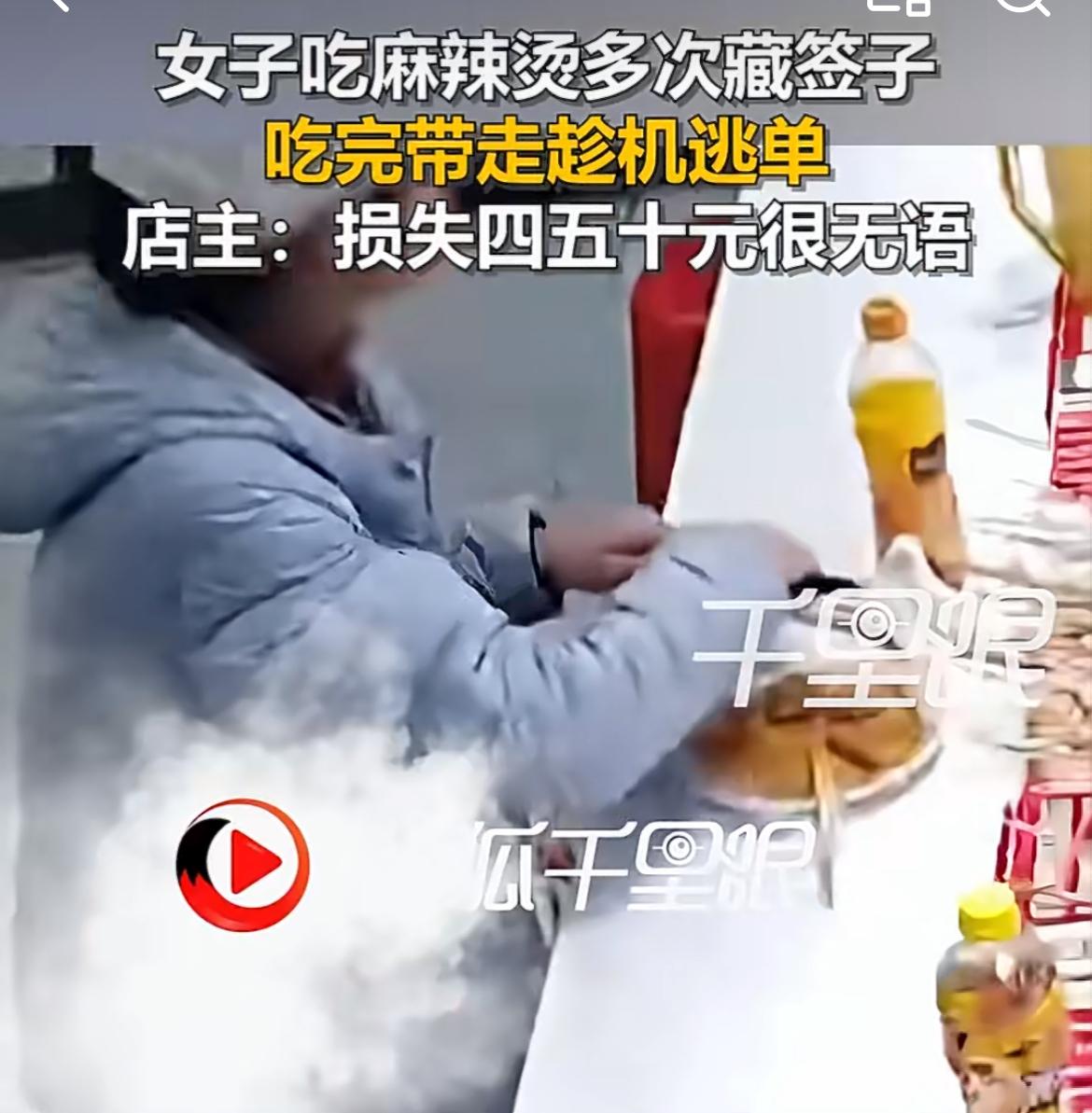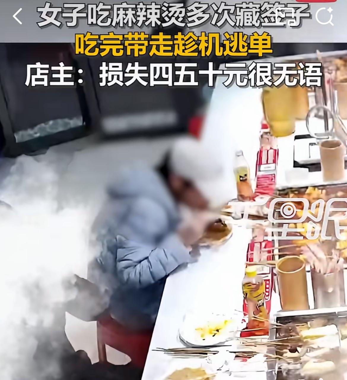 麻辣烫店主曝光,女子吃麻辣烫,藏签子,结账买单时假装输密码逃跑,都是啥人啊。事发内蒙古包头,女子带着鸭舌帽,吃完麻辣烫,趁店主不备把签子偷偷塞地下,只留下十几块待结账,真正结账的时候假装扫码,趁机逃跑。店家没有报警,只是发出来给同行提醒。麻辣烫店员工 麻辣烫收银