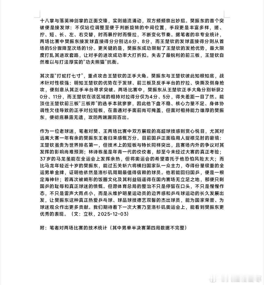 这是我邀请我的好朋友“立秋”写的分析全运会樊振东两胜王楚钦的文章。纯粹的技战术、