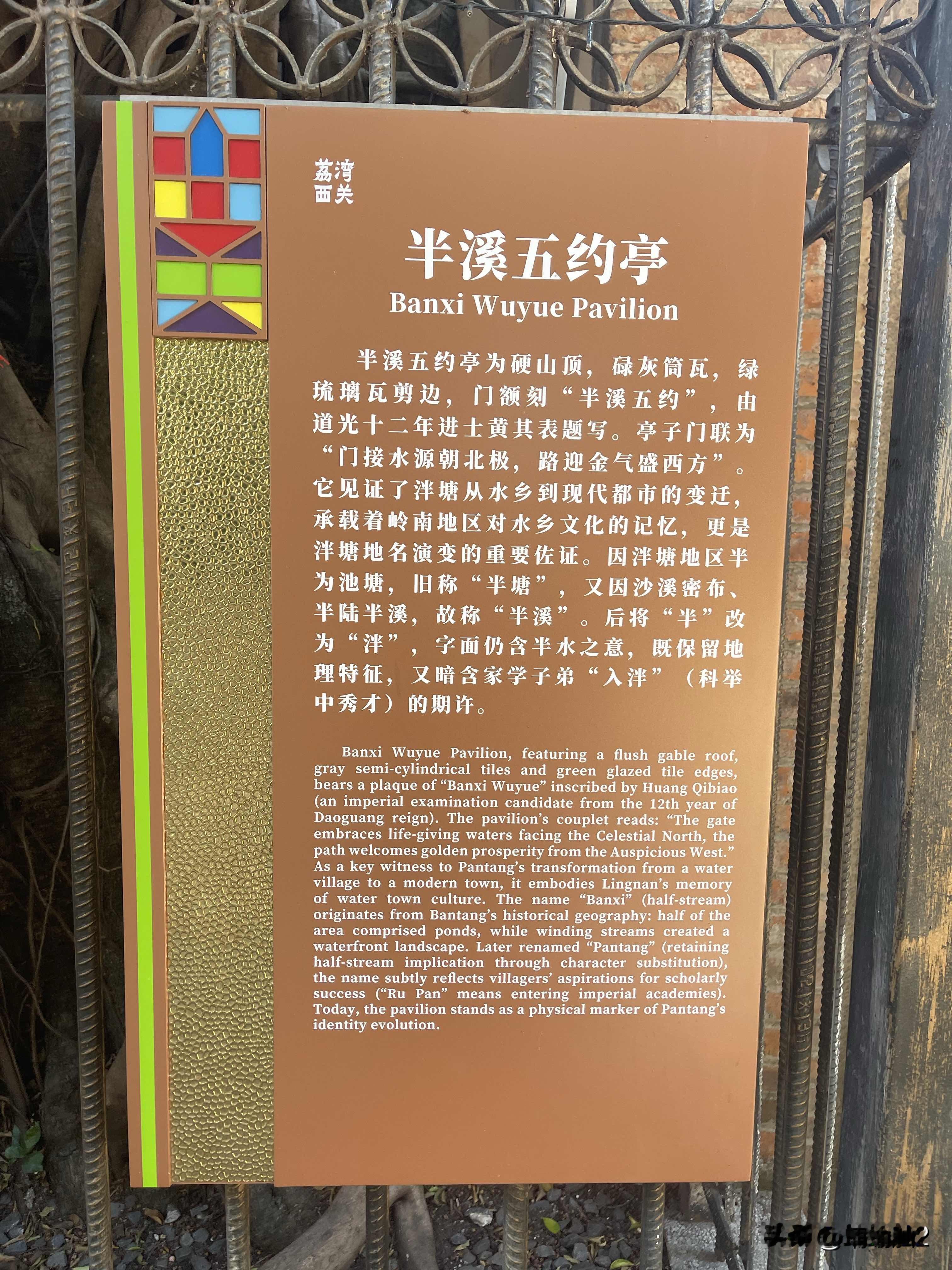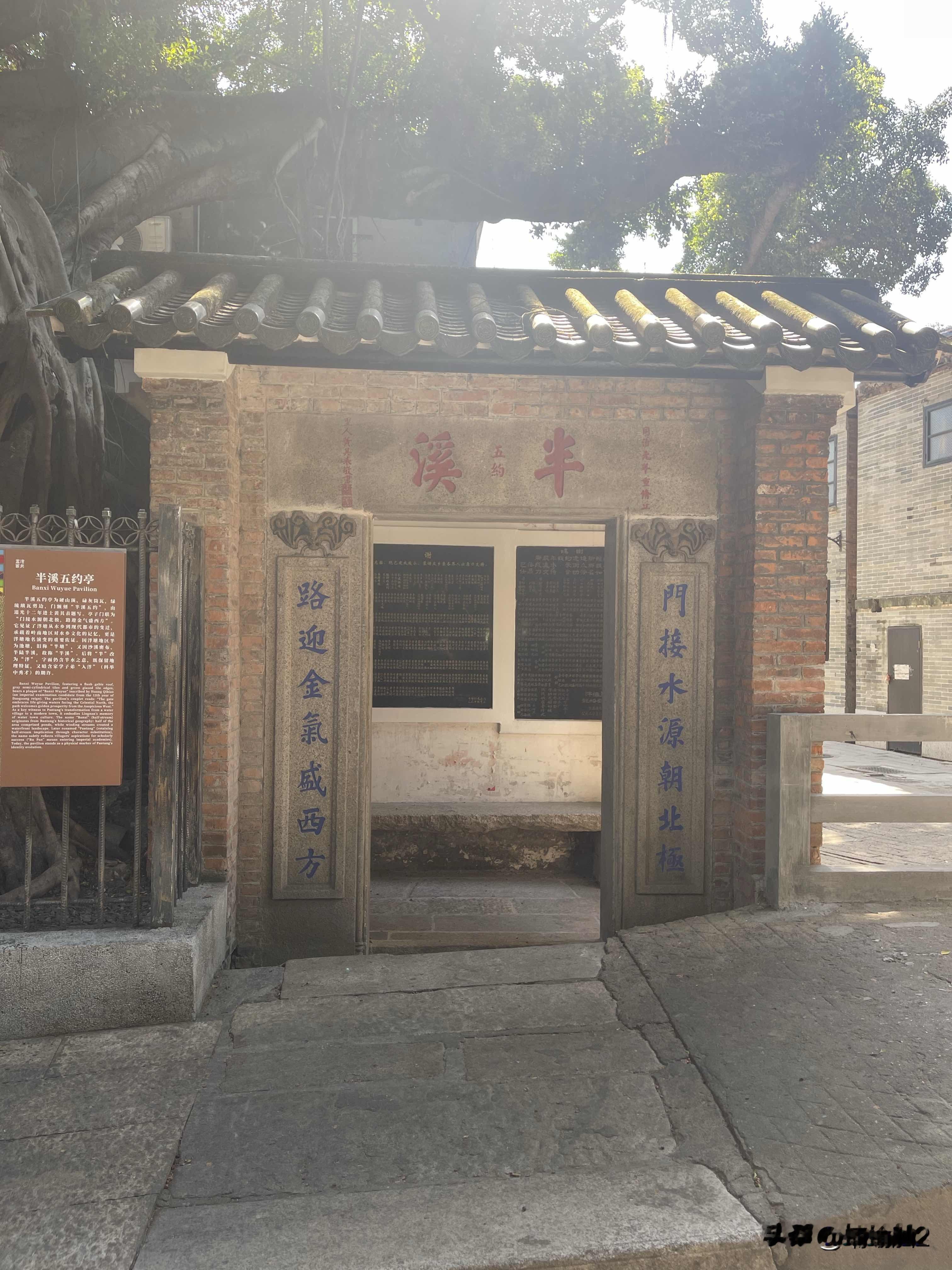 广州半溪五约亭,在荔湾湖公园附近的街区里,很不起眼的一个小亭子,藏在一株铺天盖地的大榕树下,不仔细看,都发现不了,看看说明,大榕树有九百多年了,亭上刻有“半溪五约”石刻,说是清道光十二年一位黄姓进士所题。