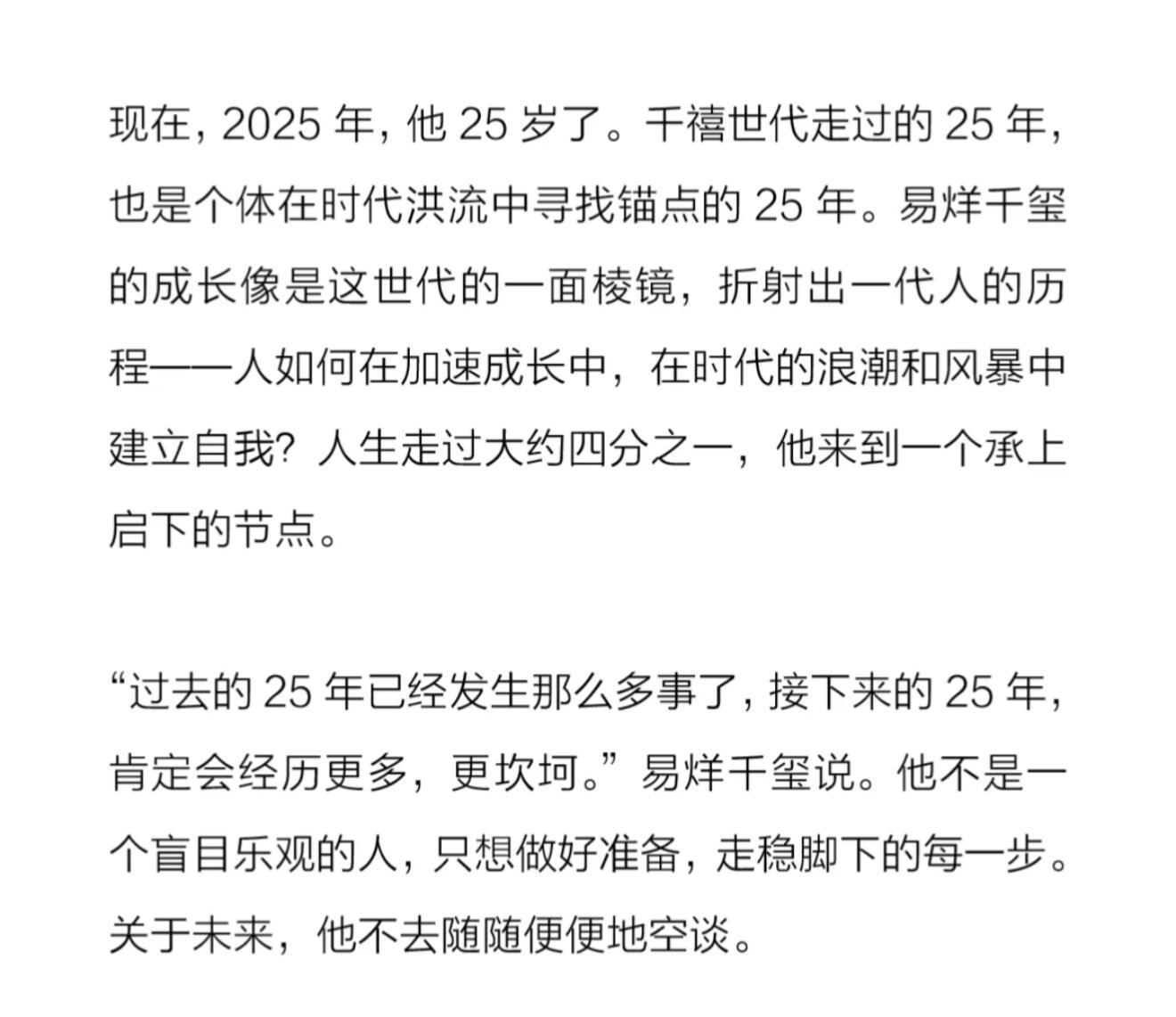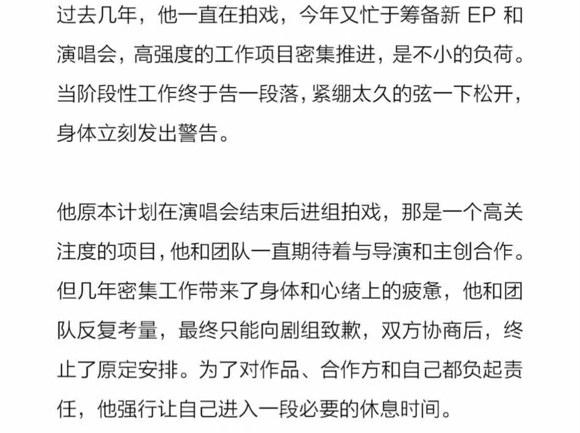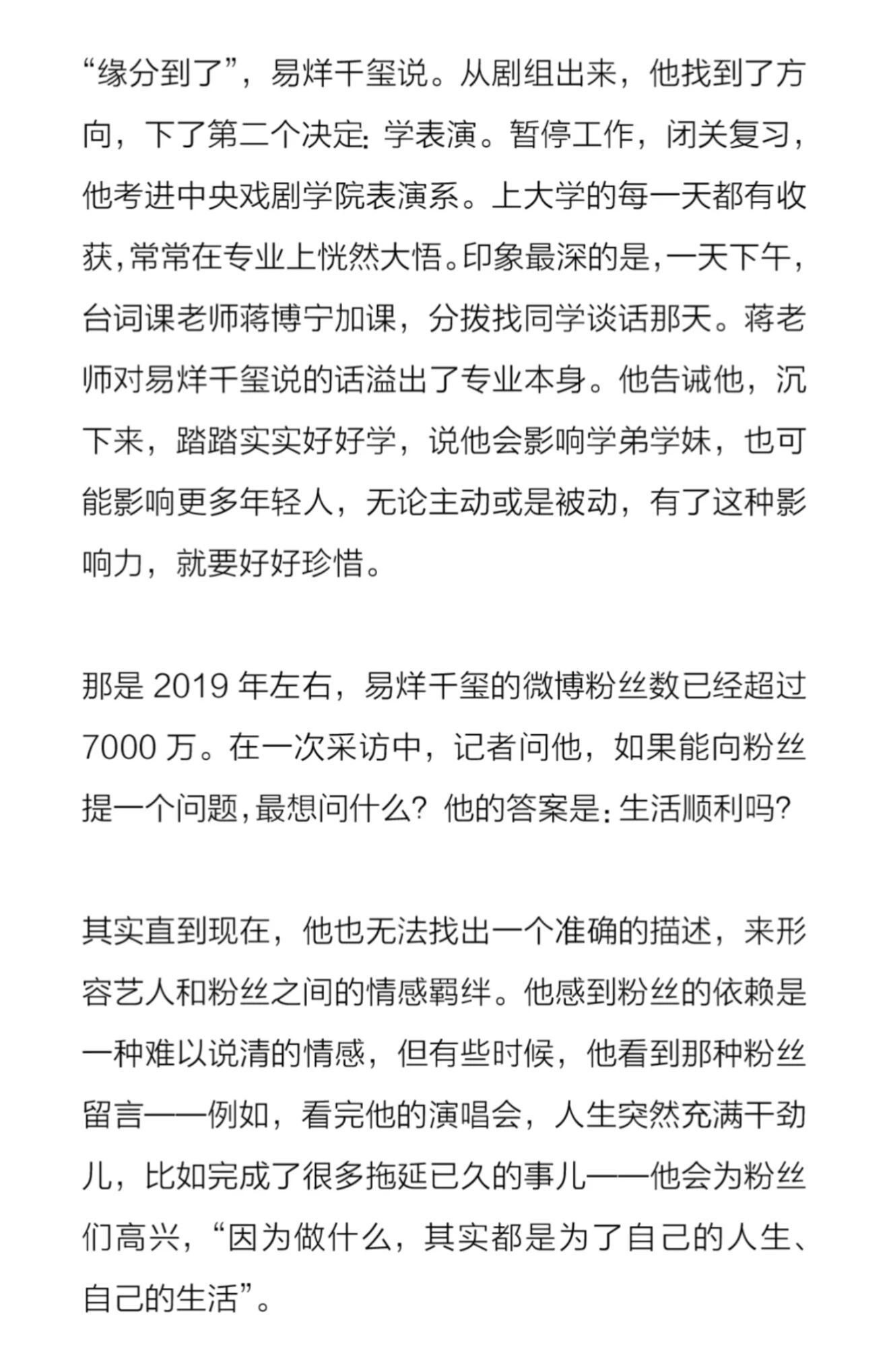 如果可以 慢一点也没关系🥲心疼易烊千玺真的有时差💧“十二岁时,他被选中出道。日程像激流推着他往前走。”记者问他:“你现在在干吗?”他想了半天,回答:“我在工作。”“偶尔压力太大、太郁闷,他会打枕头出气,这是一个人的时候。”“他想独自出门旅行,但这个愿望真有点难。”“但几年密集工作带来了身体和心绪上的疲惫”“他强行让自己进入一段必要的休息时间。”唉…🥲🥲 易烊千玺因身体原因终止原定进组安排