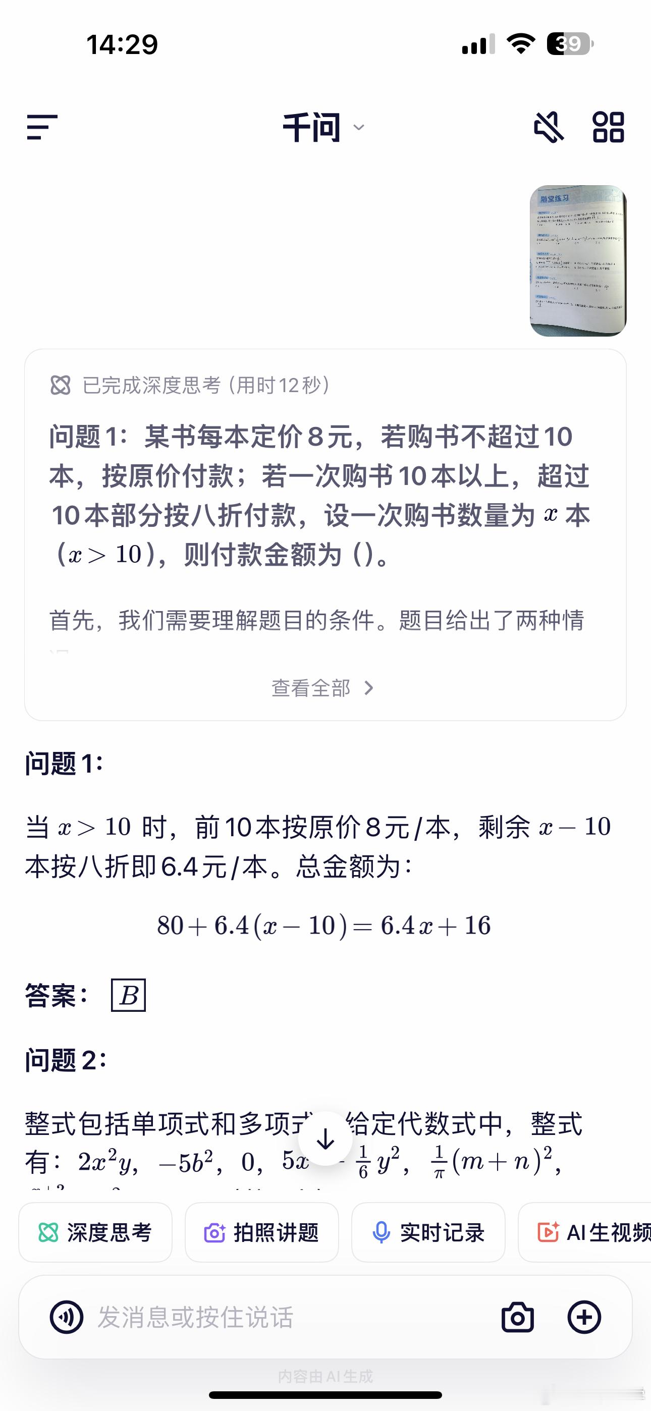 博主实测千问是初中数学辅导天花板 作为一名老父亲有话说!下班后最大的考验就是陪娃写作业!现在孩子们的教材变化快,孩子们在课堂上很少能全部消化,课后作业就变得非常重要,而家长一边忙工作一边还要辅导作业,真的精力有限!一道数学题折腾半小时还讲不明白,孩子也急得不行!小家伙卡做题在数学应用综合题上,上学时候看着很亲切的题目,咋现在一看一头雾水?故作深沉思考题目之中忽然想起这两天在用的千问,对啊,脑子不够用,咱有AI工具,说试咱就来试试!千问最新上线Qwen3-Learning最强学习模型,拍题解答快速准确!没想到应用题的解题也是非常流畅:如何快速找到解题思路,及后续的解题都分步骤拆解得明明白白。每一步推导都标得清清楚楚,很快就回忆起来被遗忘的知识点,老父亲弄明白以后,小家伙跟着思路顺下来,一道题10分钟就搞定!做题后又仔细研究了一下千问阿里最强阿里最强学习大模型Qwen3-Learning,功能划重点如下:1、答案准确率没话说,家长不用翻教材查教案验证,哪怕我早忘了这些知识点,也能借着它的讲解帮娃梳理。2、作业批改:及时页面不是特别清晰也能快速判定结果。错题总结及思考引导可以让孩子们很快查缺补漏。3、免费不限次!比起上千块的学习机,免费工具真的太值了!对家长来说免费还是蛮重要的,该省的地方咱们还是要省!4、千问拍题太良心,以后再遇到分式方程应用题、三角函数难题,我都可以用千问查,孩子也跟着慢慢也学会了自己使用,当然尽量还是家长陪着孩子一起学,有了AI工具的辅助,孩子学习效率高多了,抽出更多时间可以一起看喜欢的电视。真心觉得这种贴合初中数学难点的AI工具,既帮孩子攻克痛点,也让家长辅导不抓狂,推荐给所有初中生家长们,别让写作业毁了亲子关系!